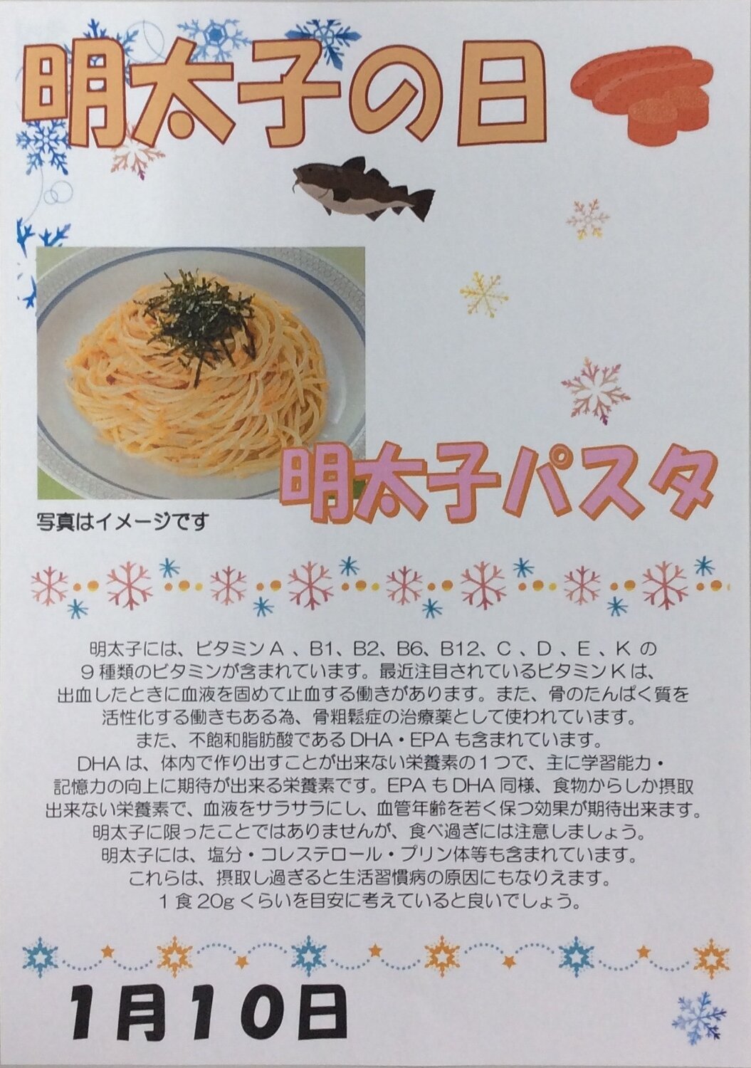 1/10は明太子の日です。昼食は『明太子パスタ』です。
