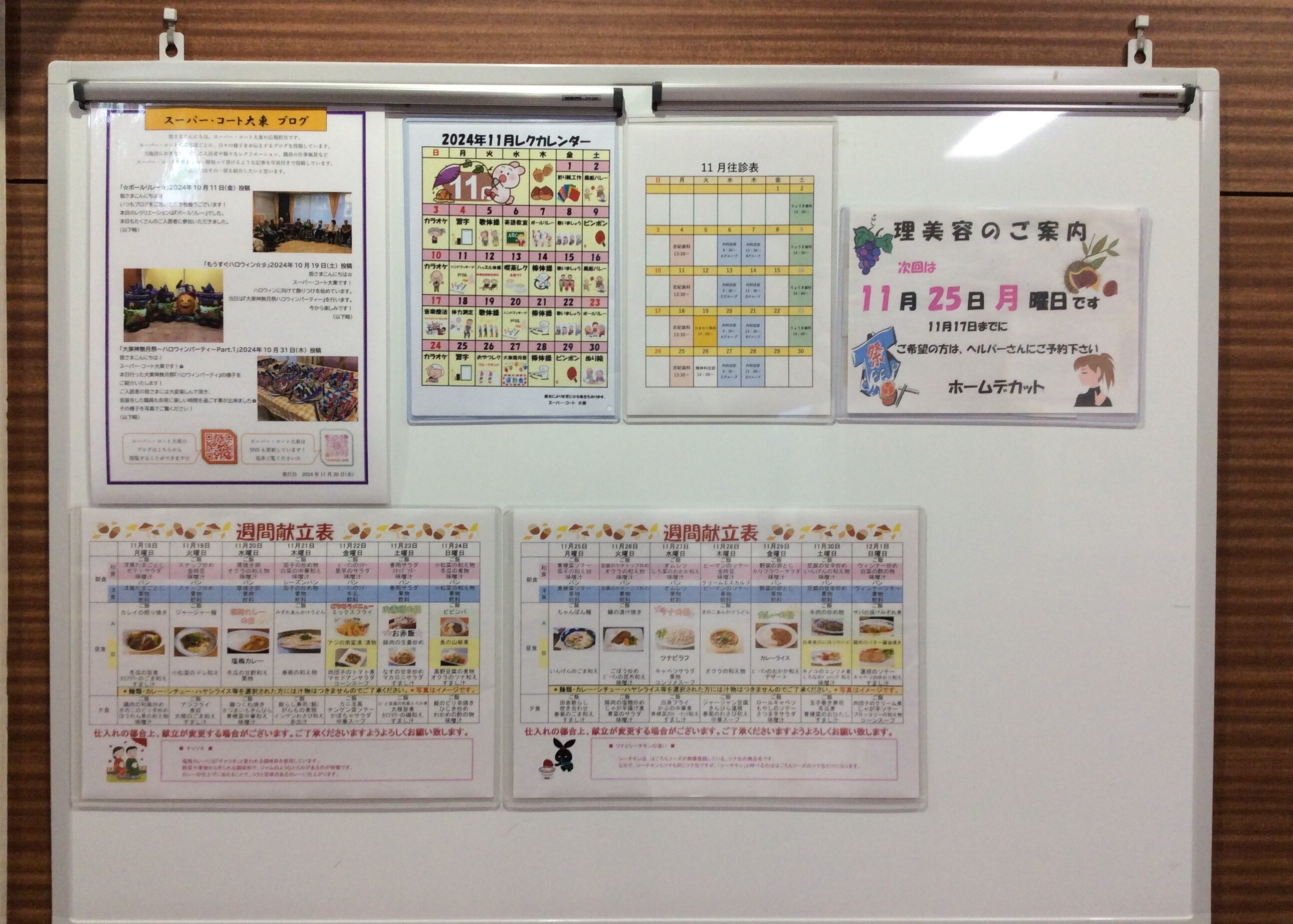 各階に献立表、レクカレンダー、往診予定などを掲示しています。
