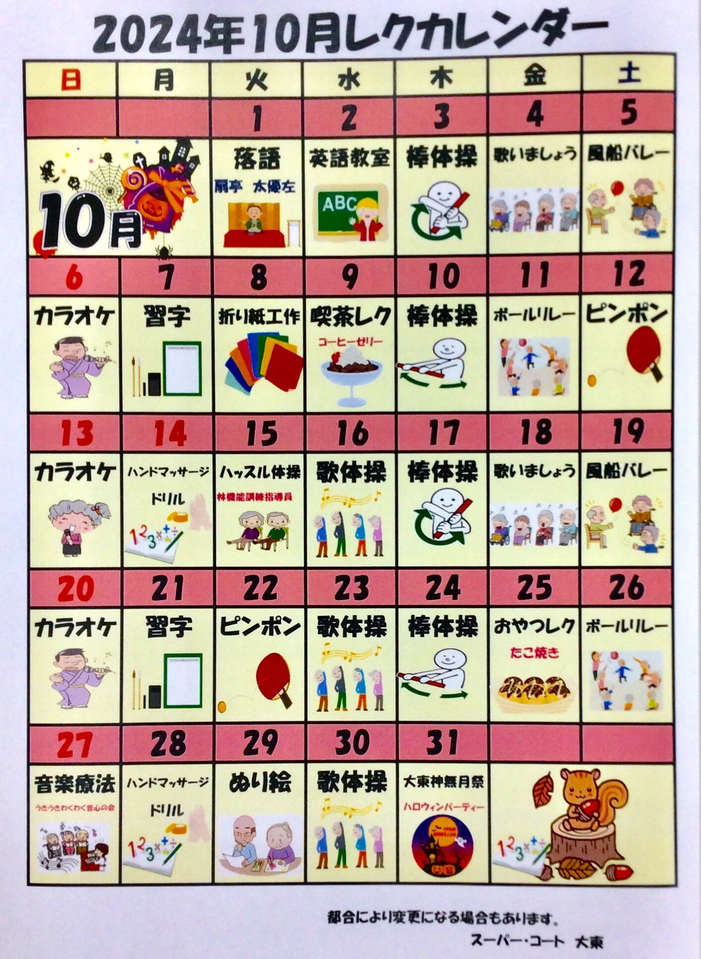 今月のレクカレンダーをご紹介いたします。