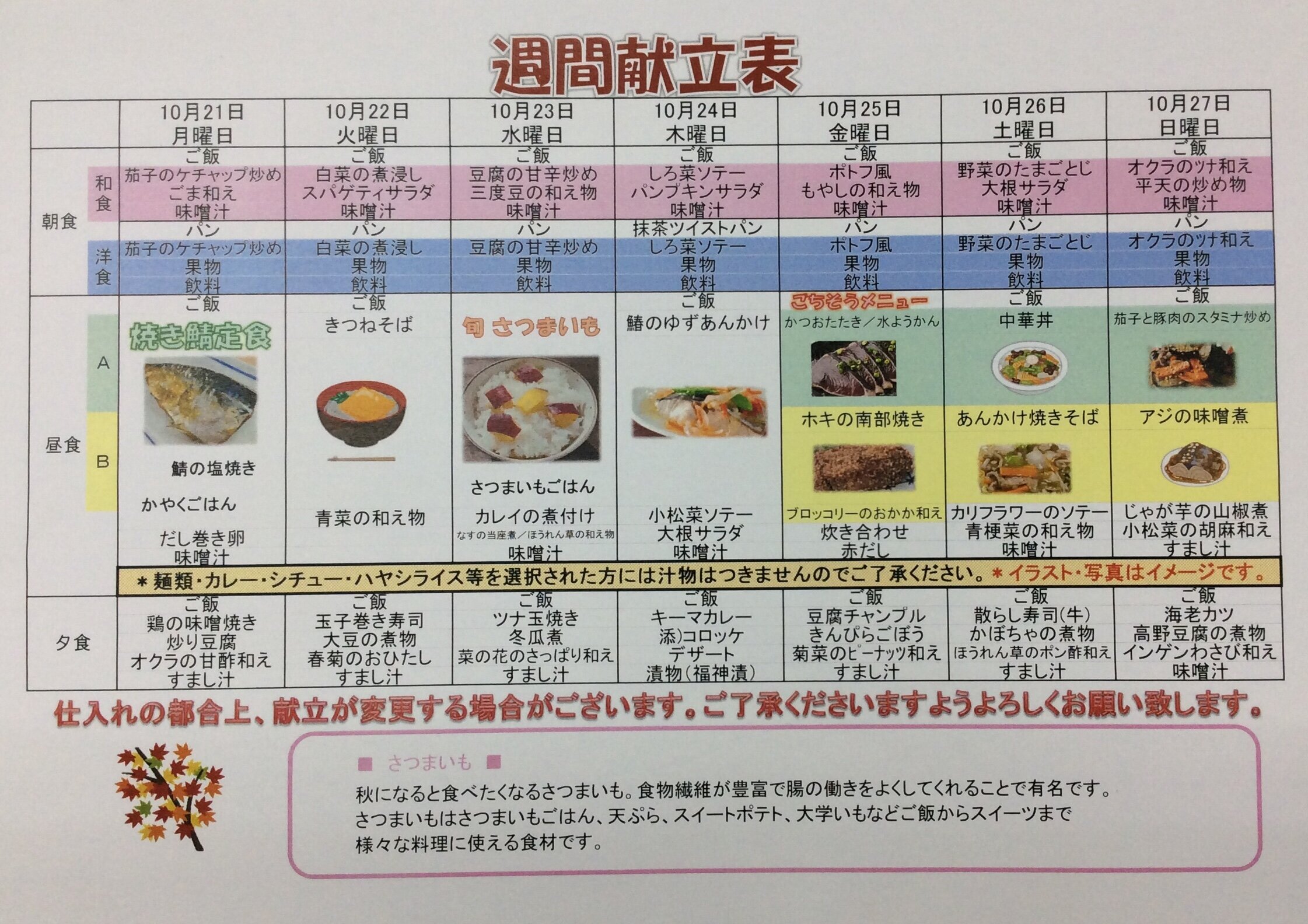 10/21~10/27の献立表をご紹介いたします。