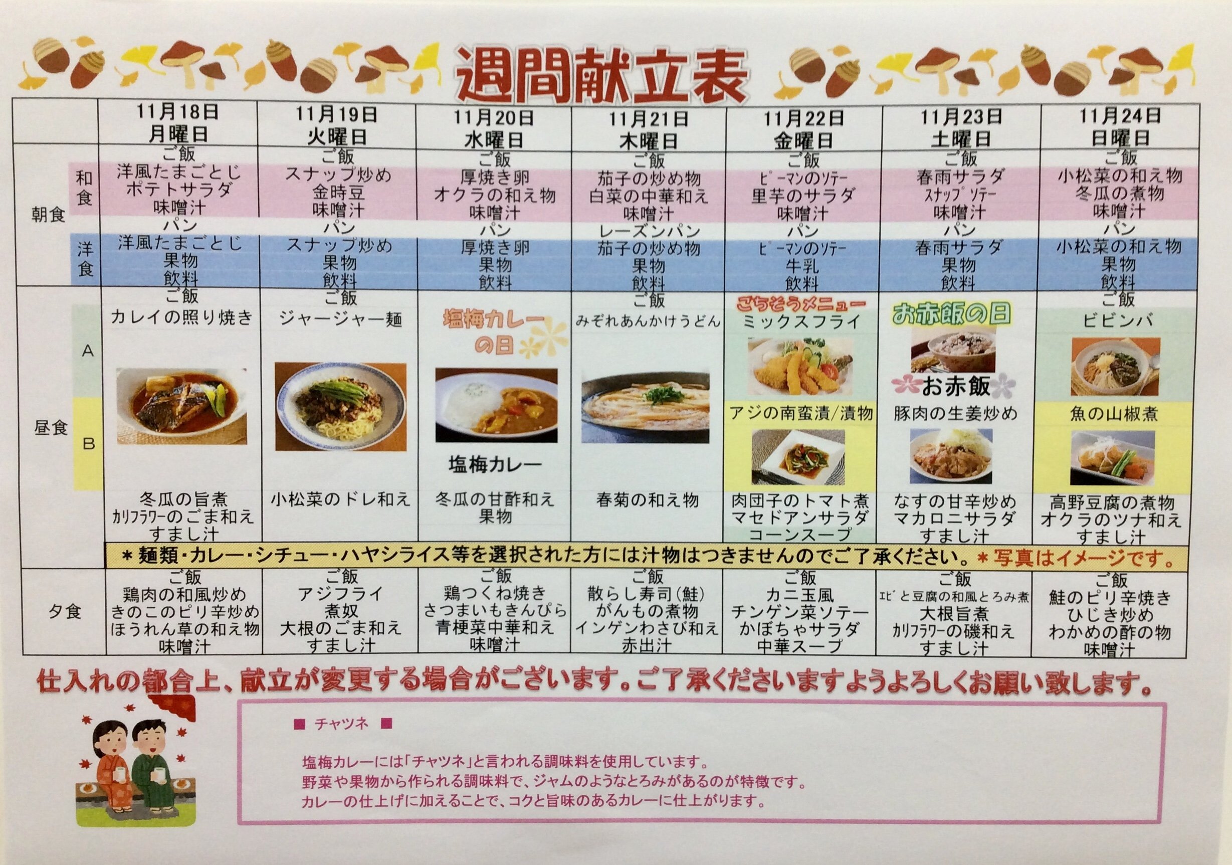 11/18~11/24の献立表をご紹介いたします。