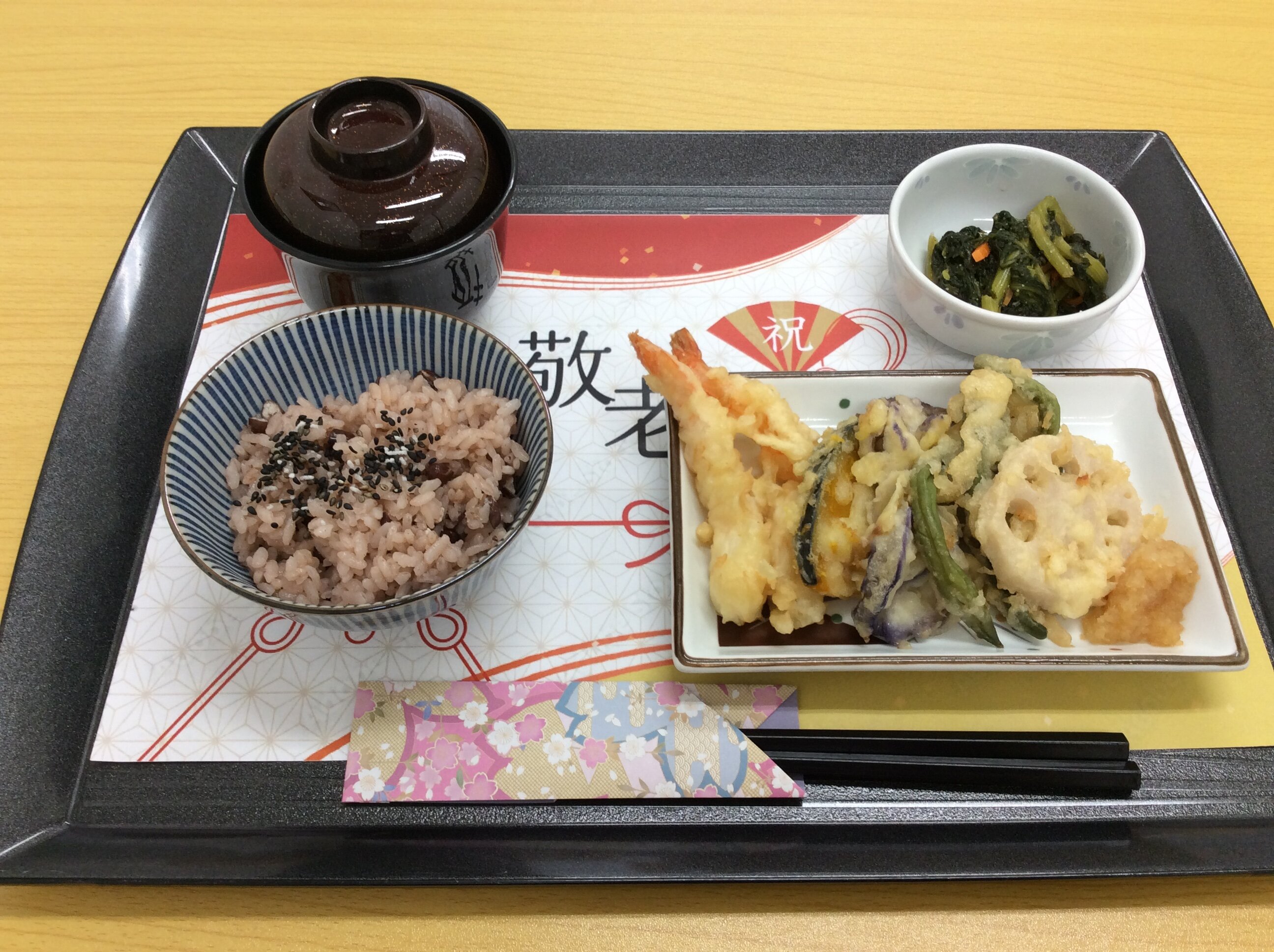 敬老の日の昼食は、お赤飯と天ぷらの献立です。