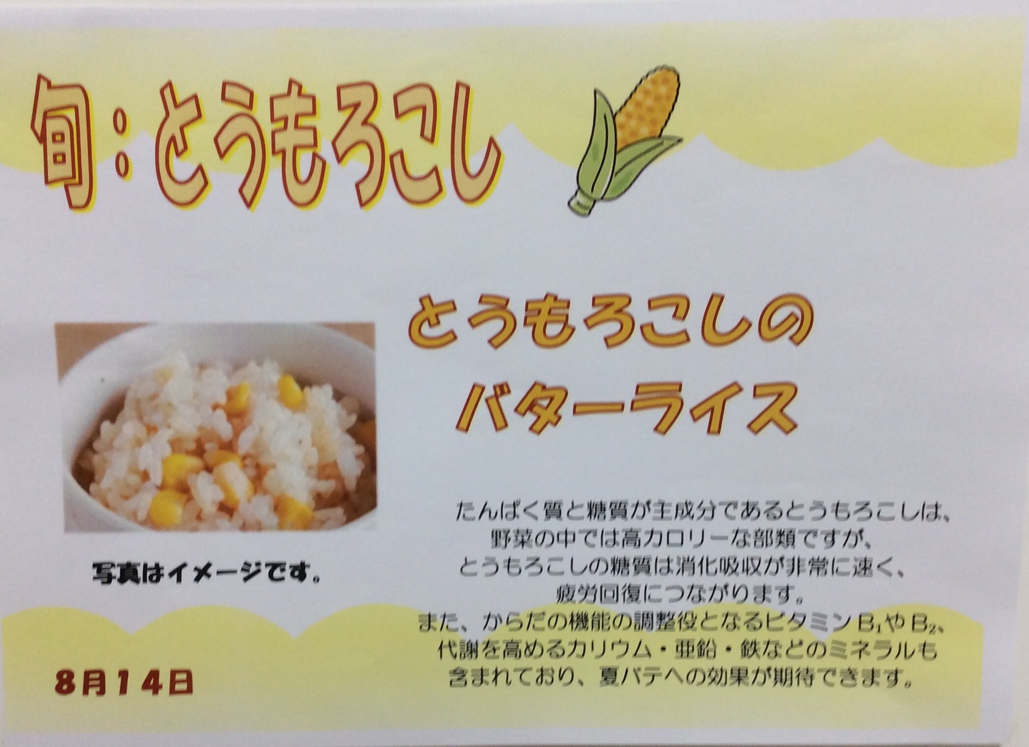 14日の昼食は、旬のとうもろこしを使って『バターライス』を提供いたします。