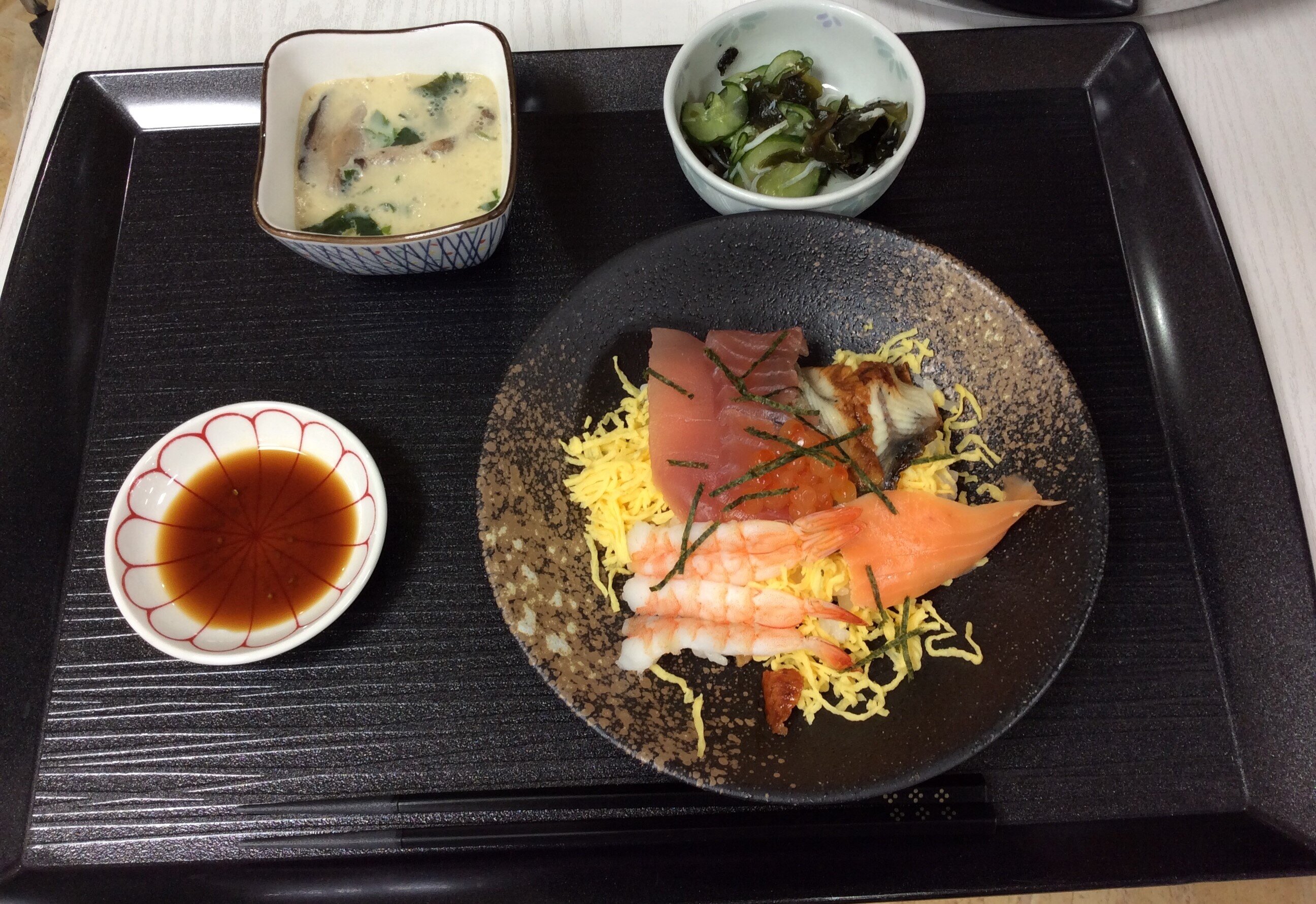 昨日の昼食は、ごちそうメニューの「海鮮散らし」でした。