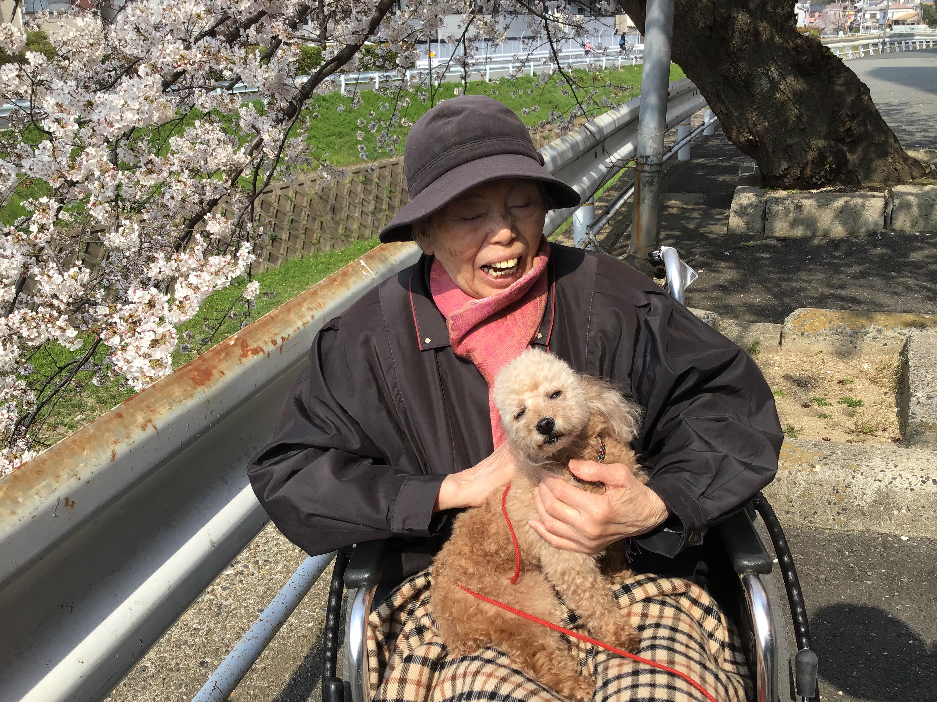 わんちゃん抱っこの入居者様、楽しそうでこちらまで嬉しくなってきます。わんちゃんも満足そうで素敵な春の日ですね。