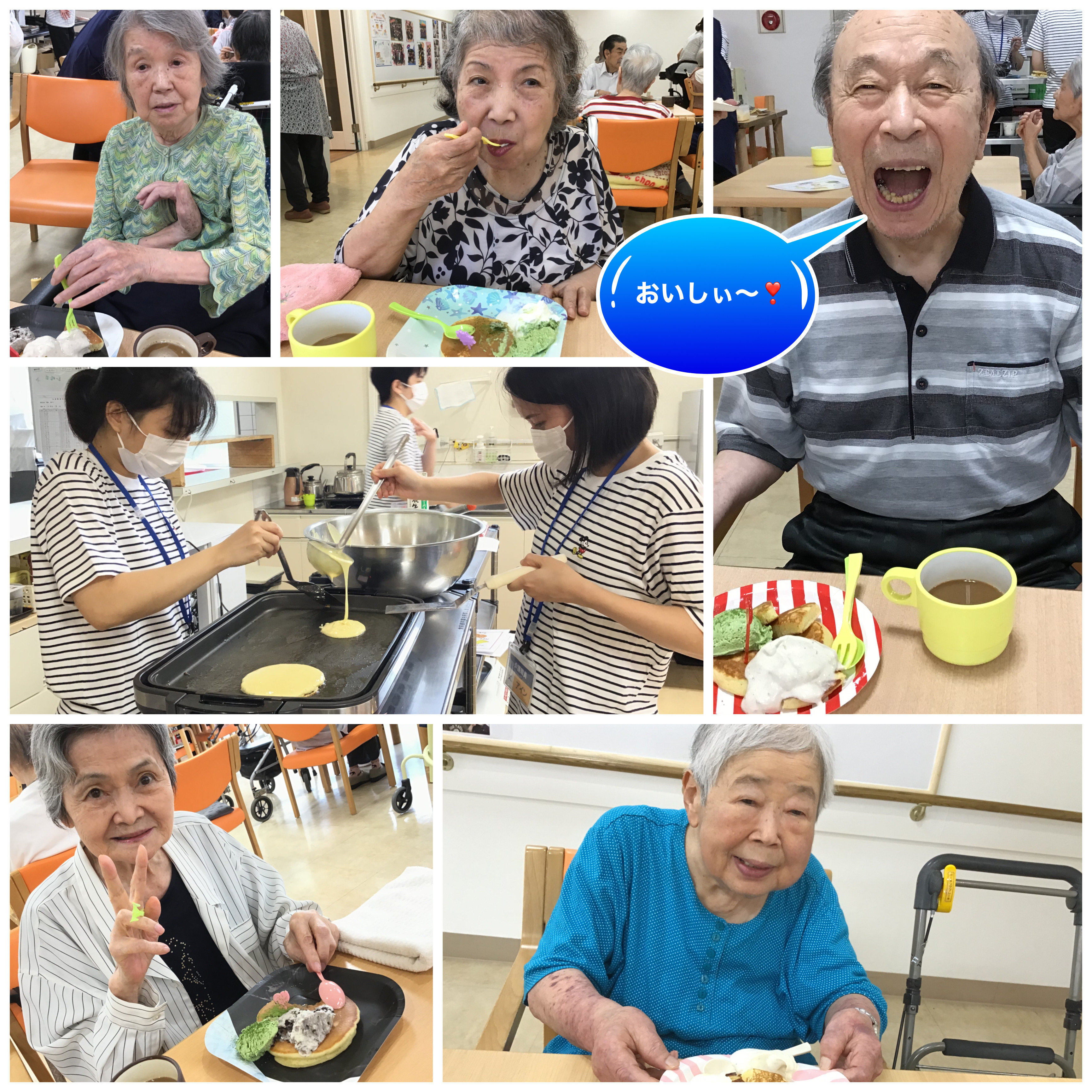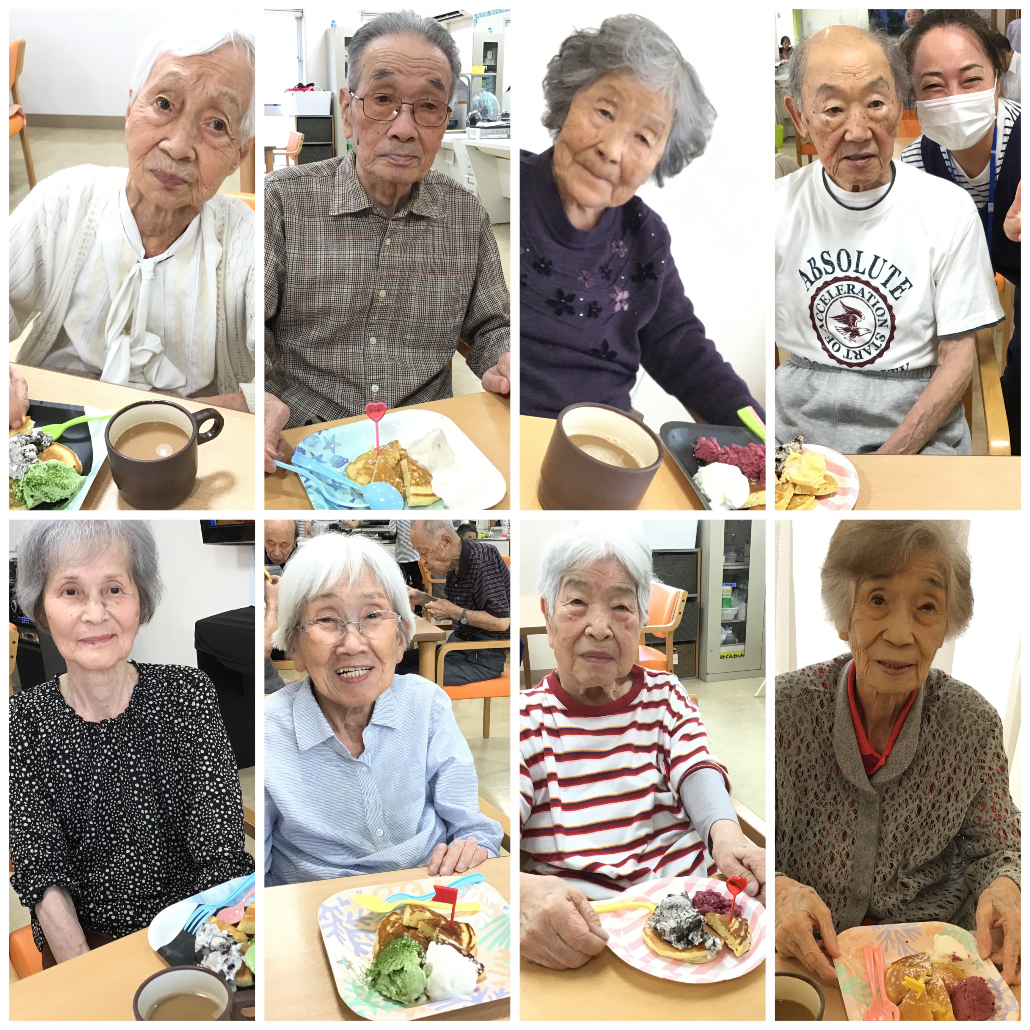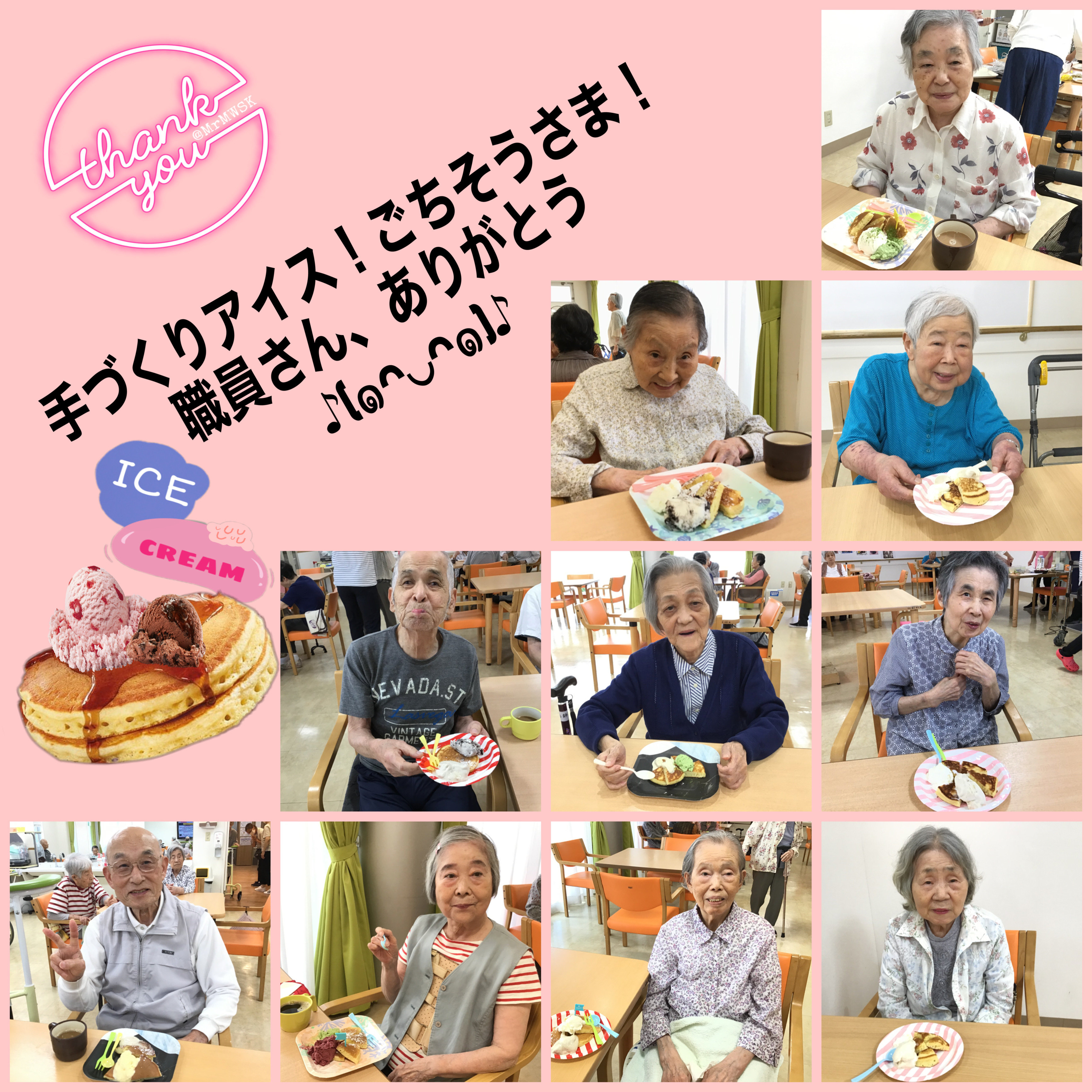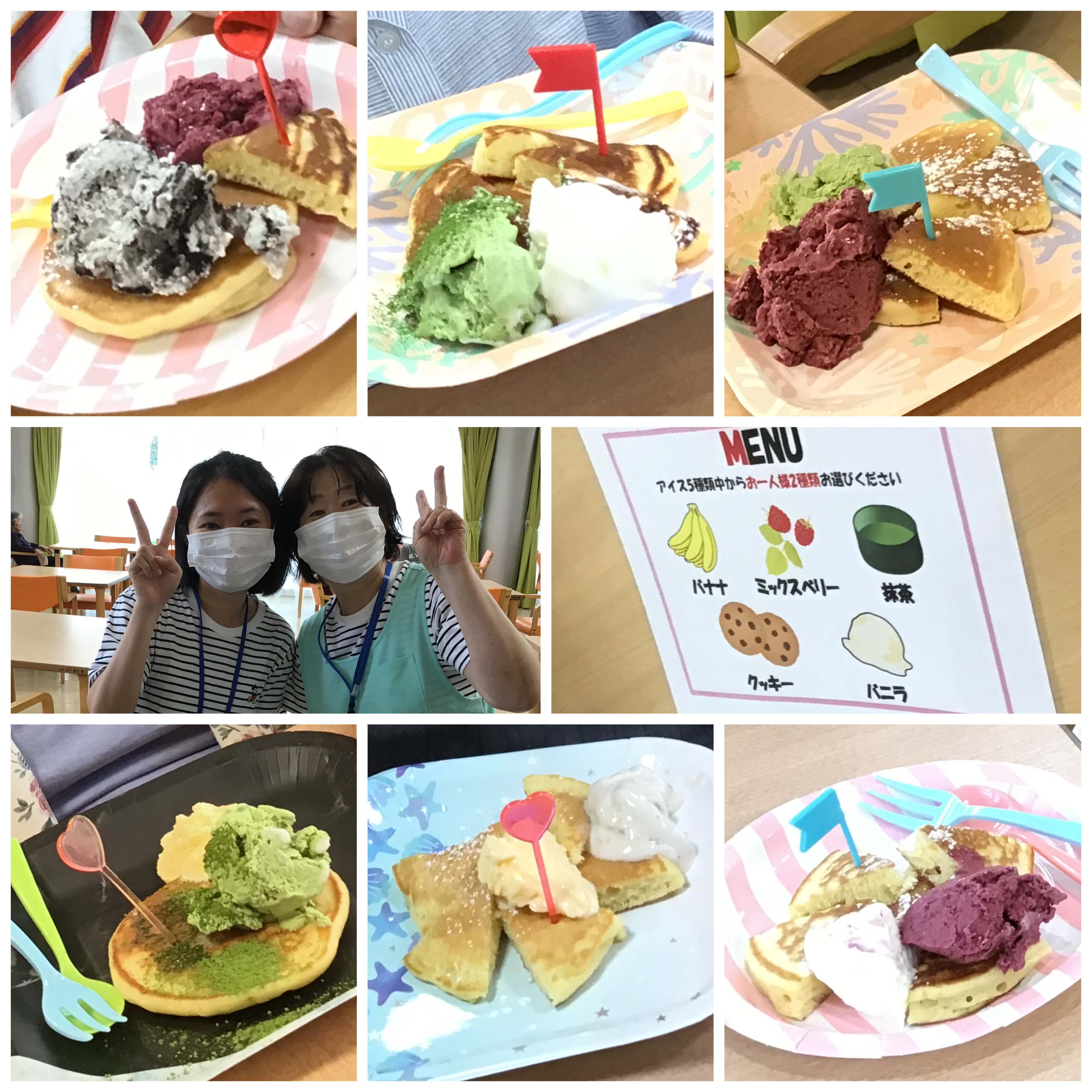 ホットケーキに5種類すべてナースさん手作り100%アイスを乗せました!レク前日まで固さや柔らかさ味に至るまで試行錯誤しながら作ってくださりプレミアムアイスが完成!提供させていただく事が出来ました!感謝☆感激~!