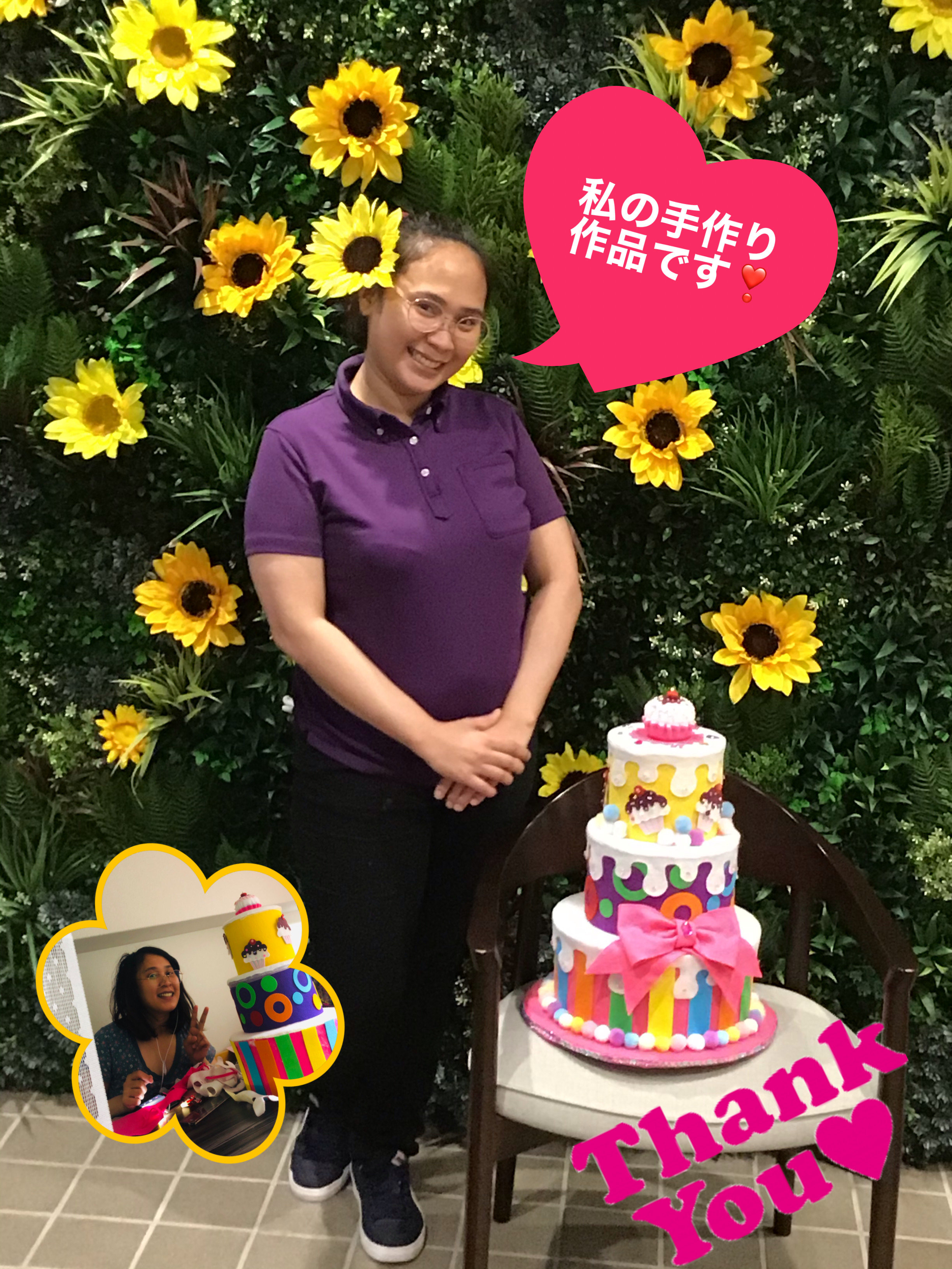 何と可愛いケーキはグローバルのチェナさんが夜な夜な作ってくださいました!フエルトを切り貼り綿を詰めてチクチク縫って一段一段積み重ね完成させてくれました。