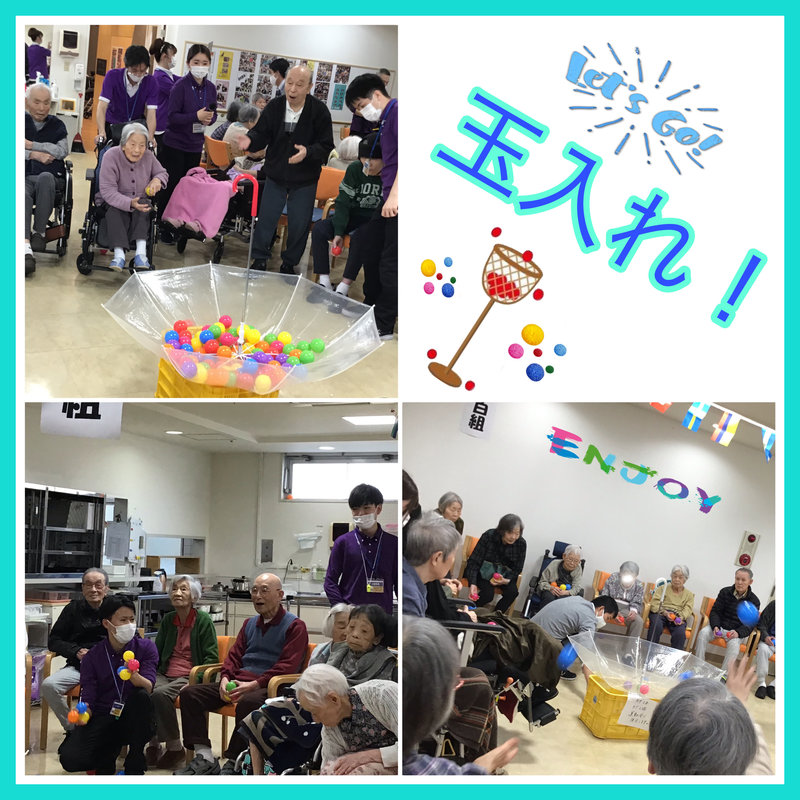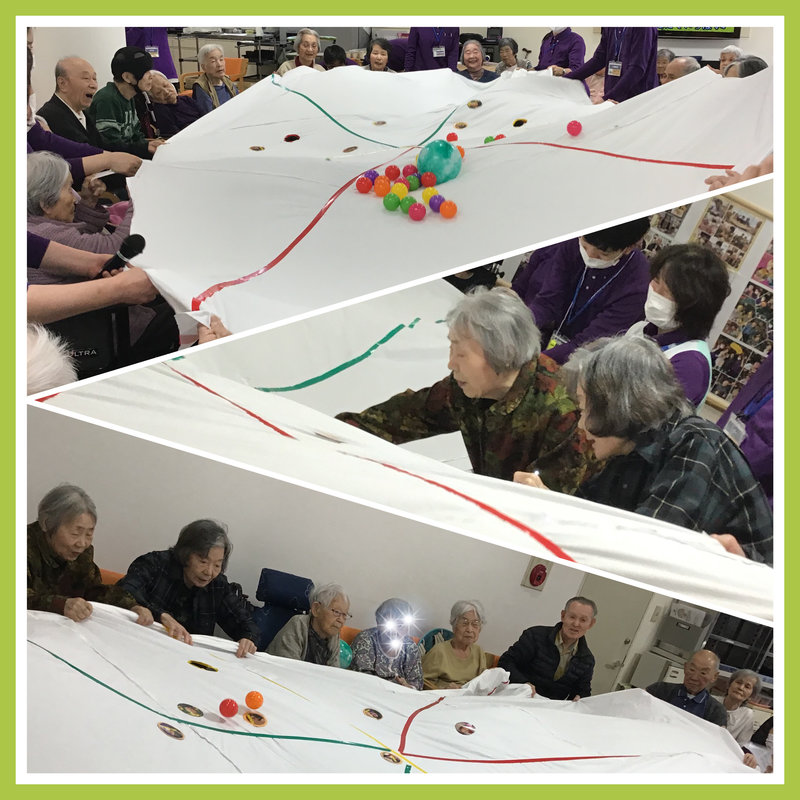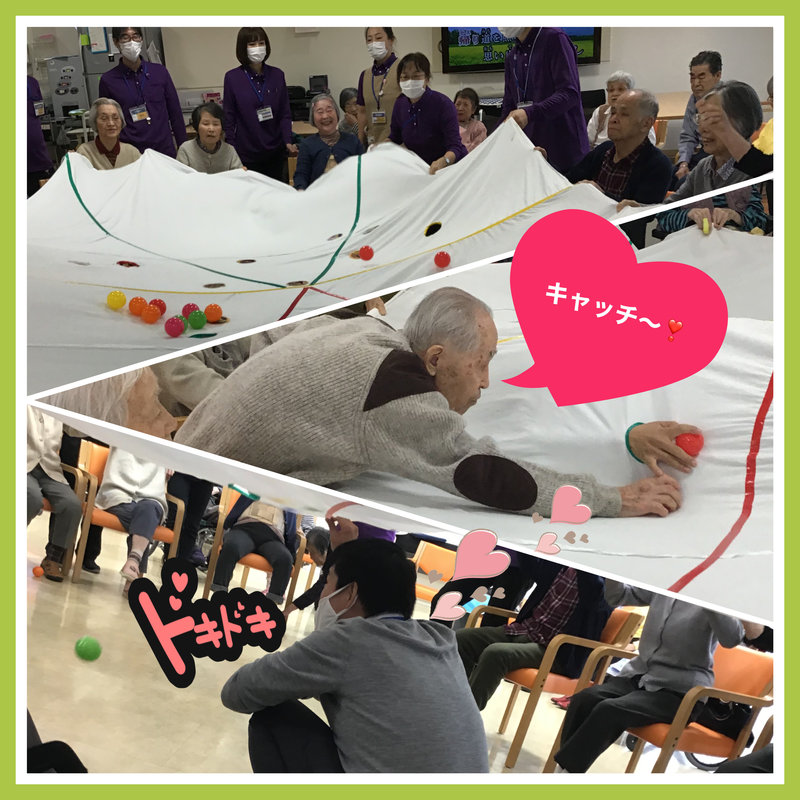 まず最初は大きな大きなシーツでボール落としゲーム!頑張って職員シーツを縫い合わせました!