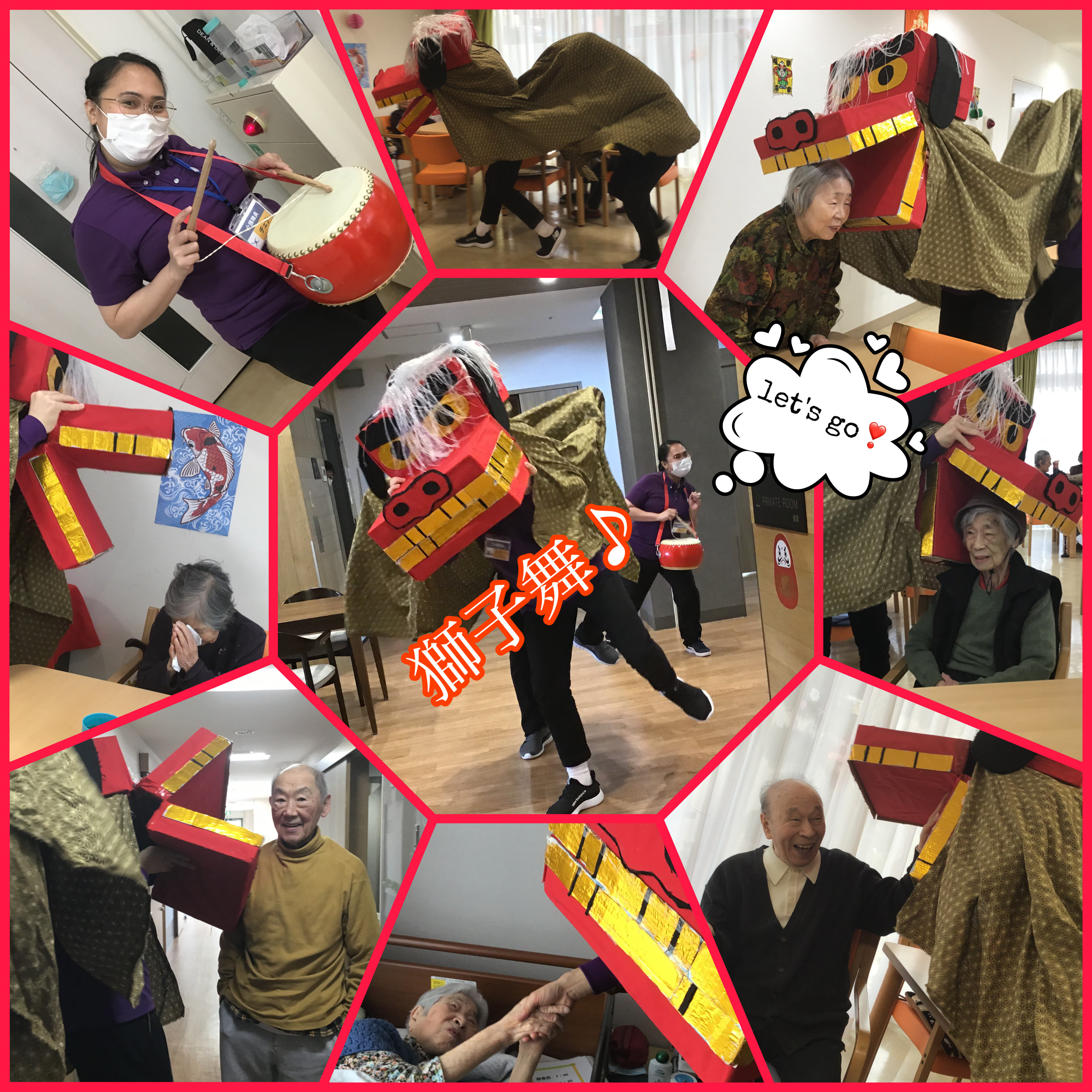 コロナ退散を願って獅子舞いの披露です!息ぴったりです!レッツ・ゴー!!!