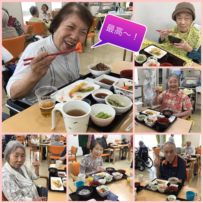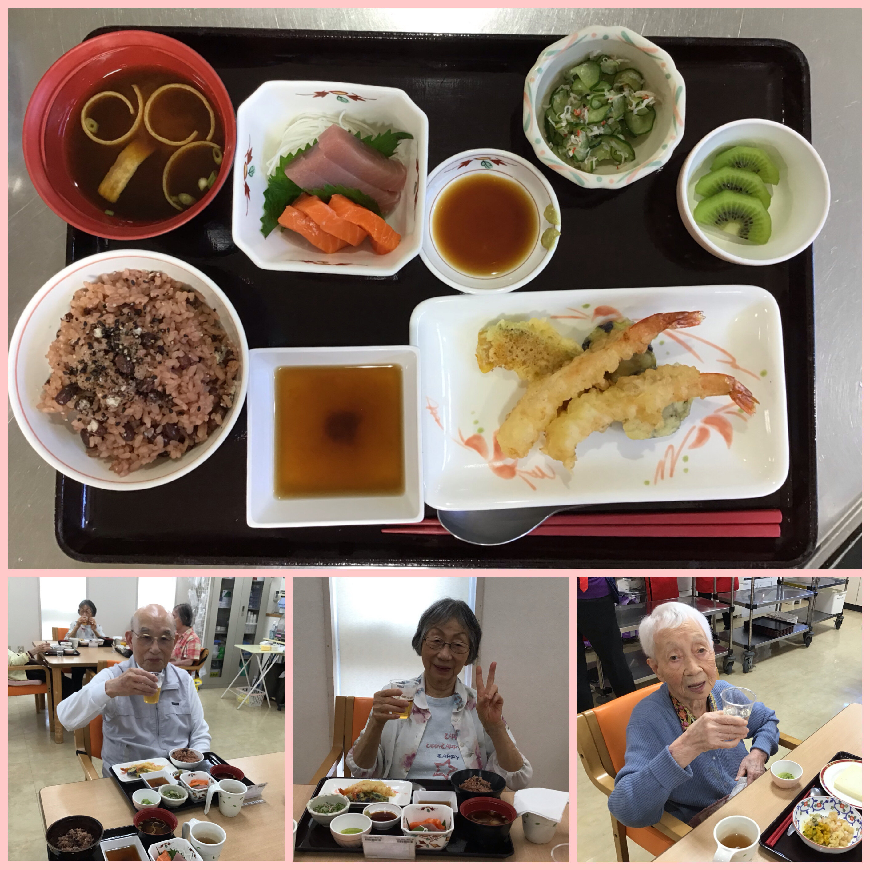 お赤飯にお刺身に天ぷらに酢の物に果物とごちそうに皆さん笑みが溢れました!
