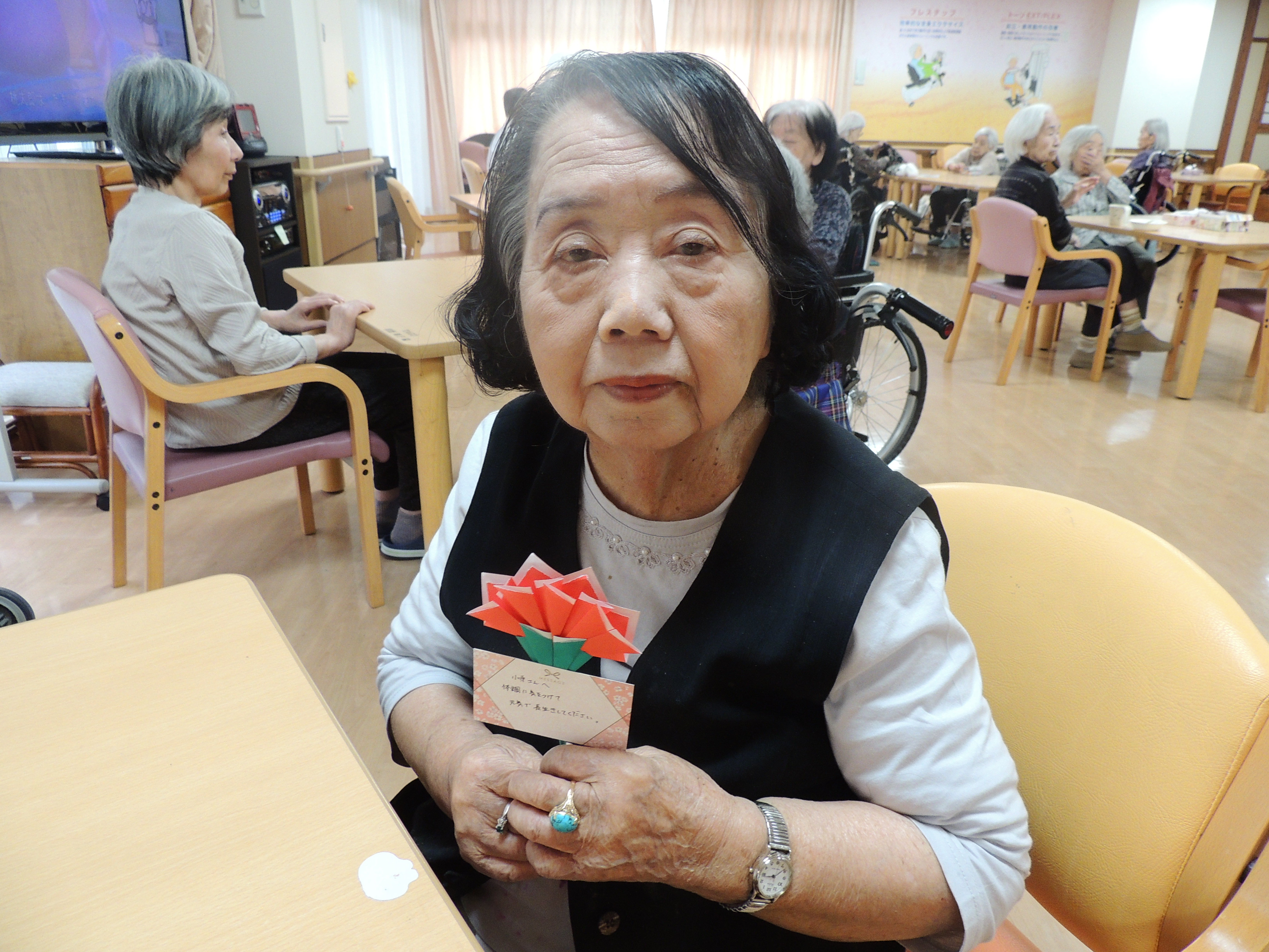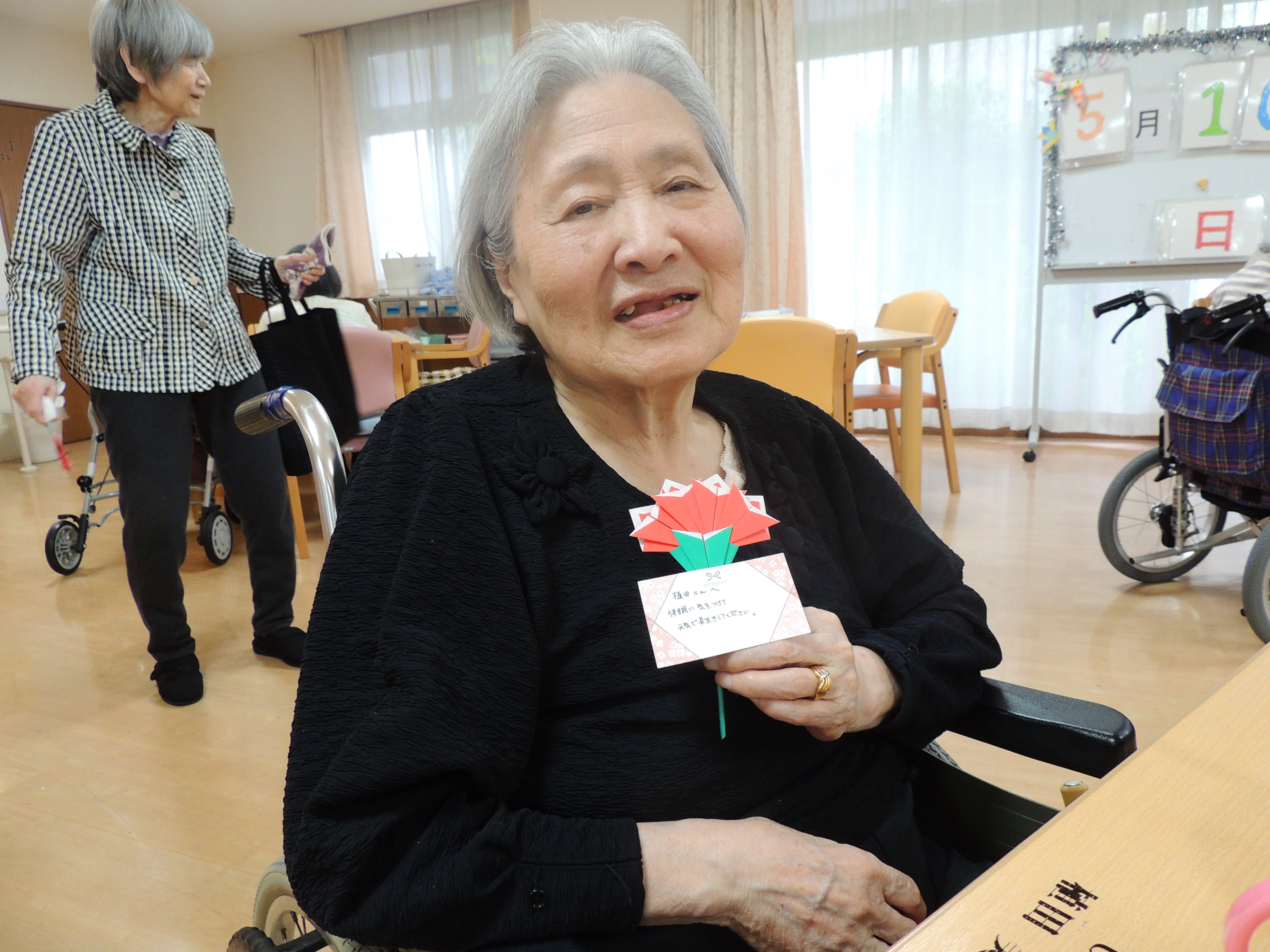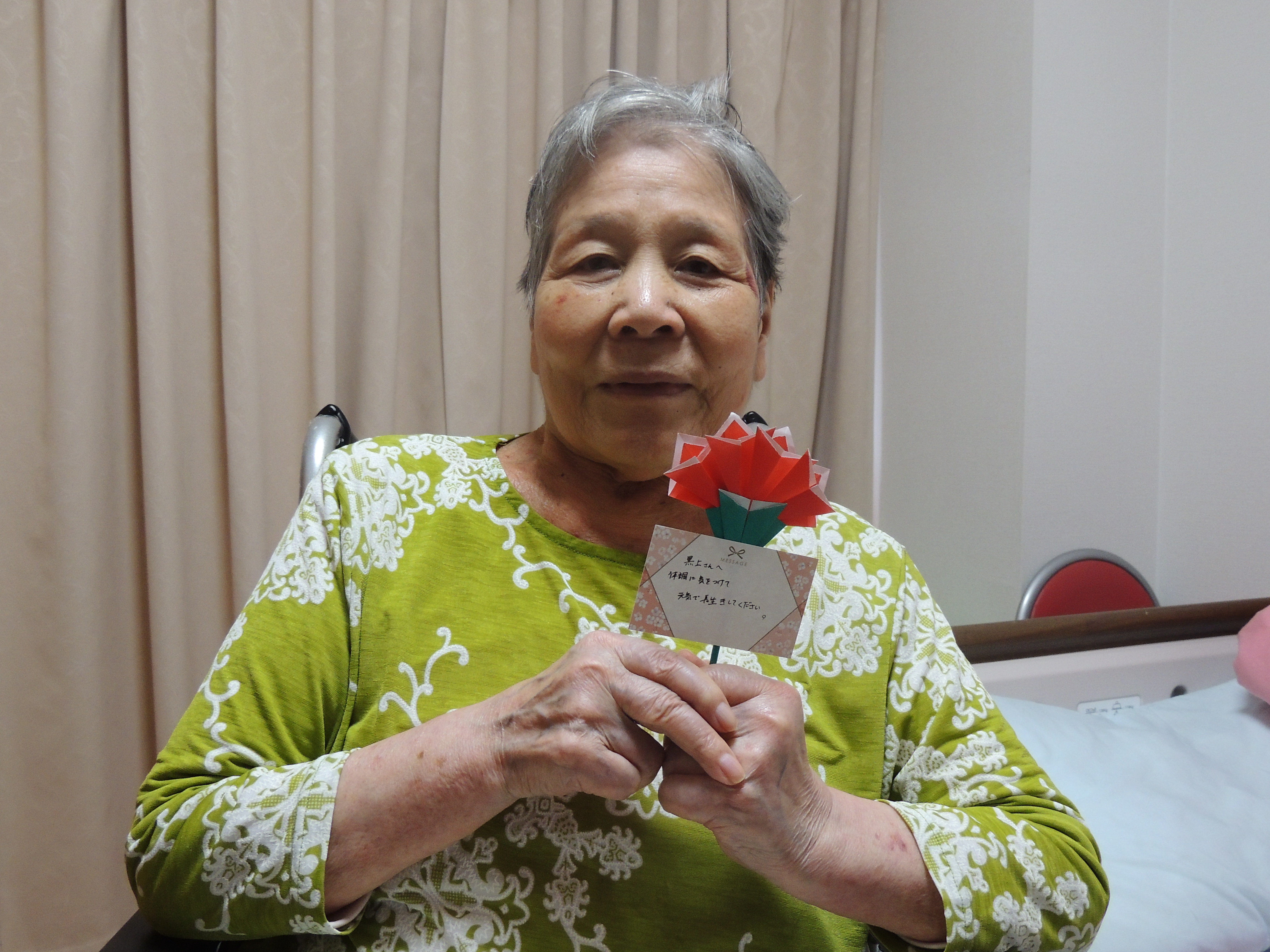女性のご入居者にスタッフが折り紙で作ったカーネーションの花とメッセージカードを手渡しさせて頂きました。