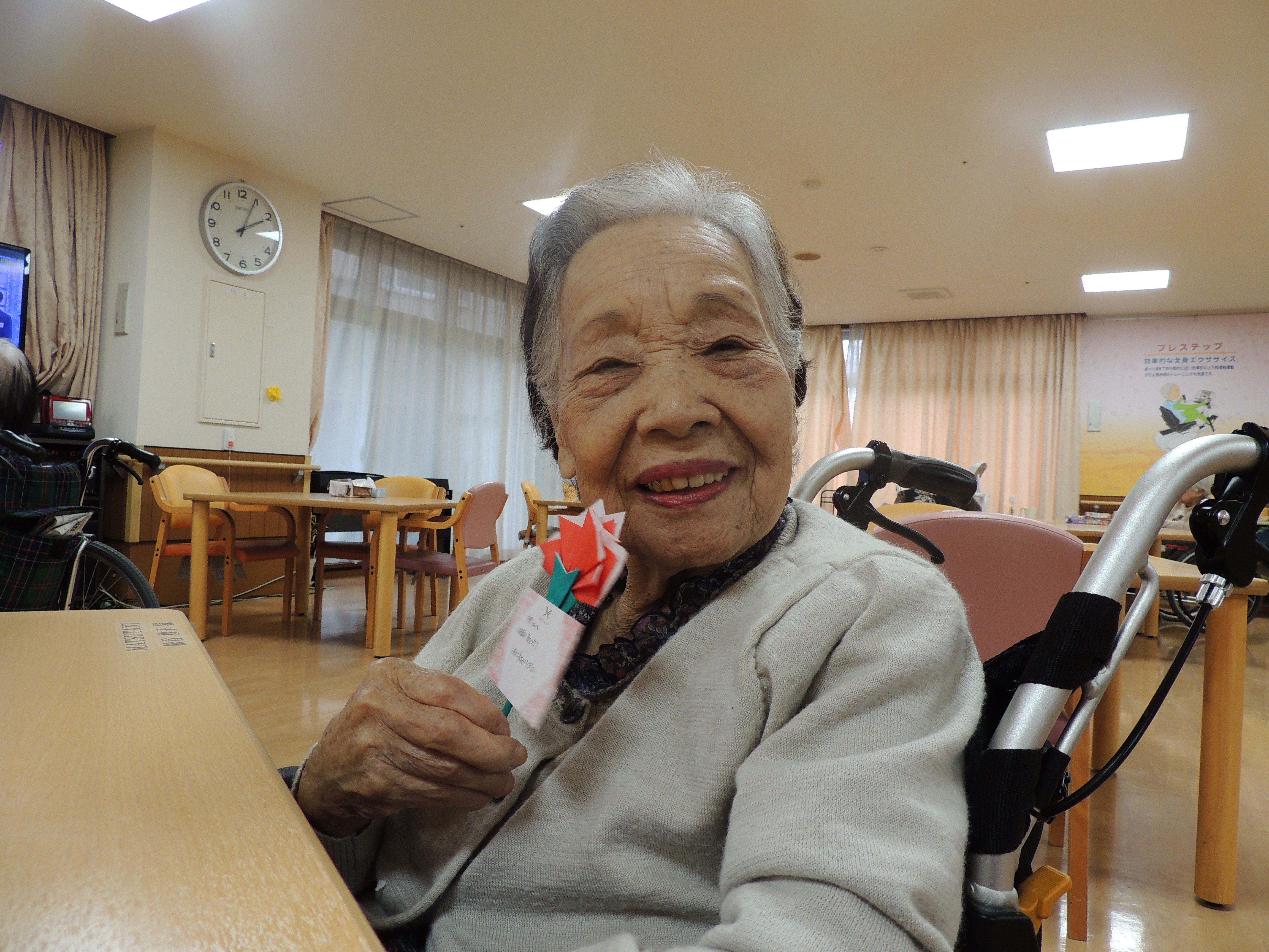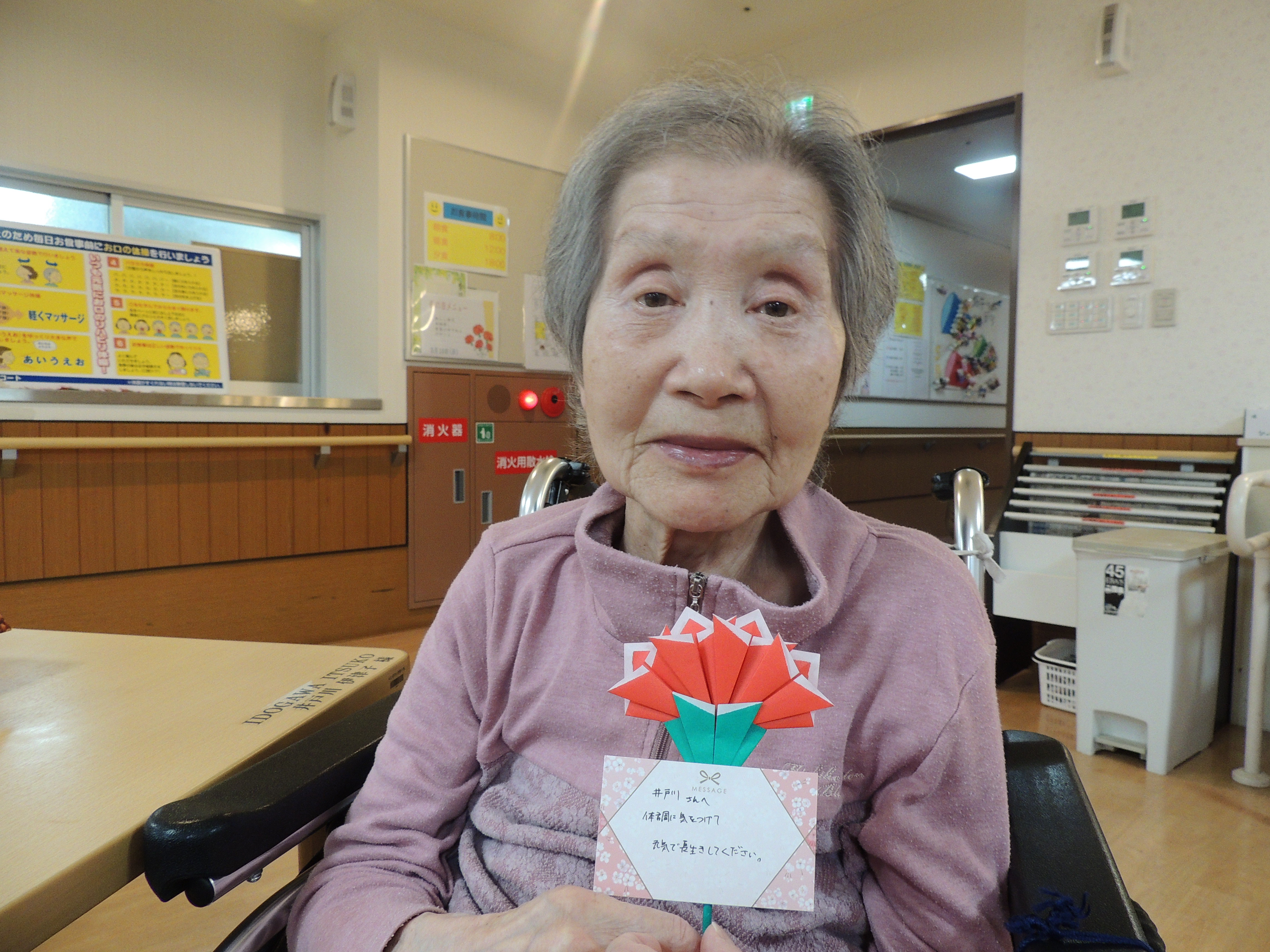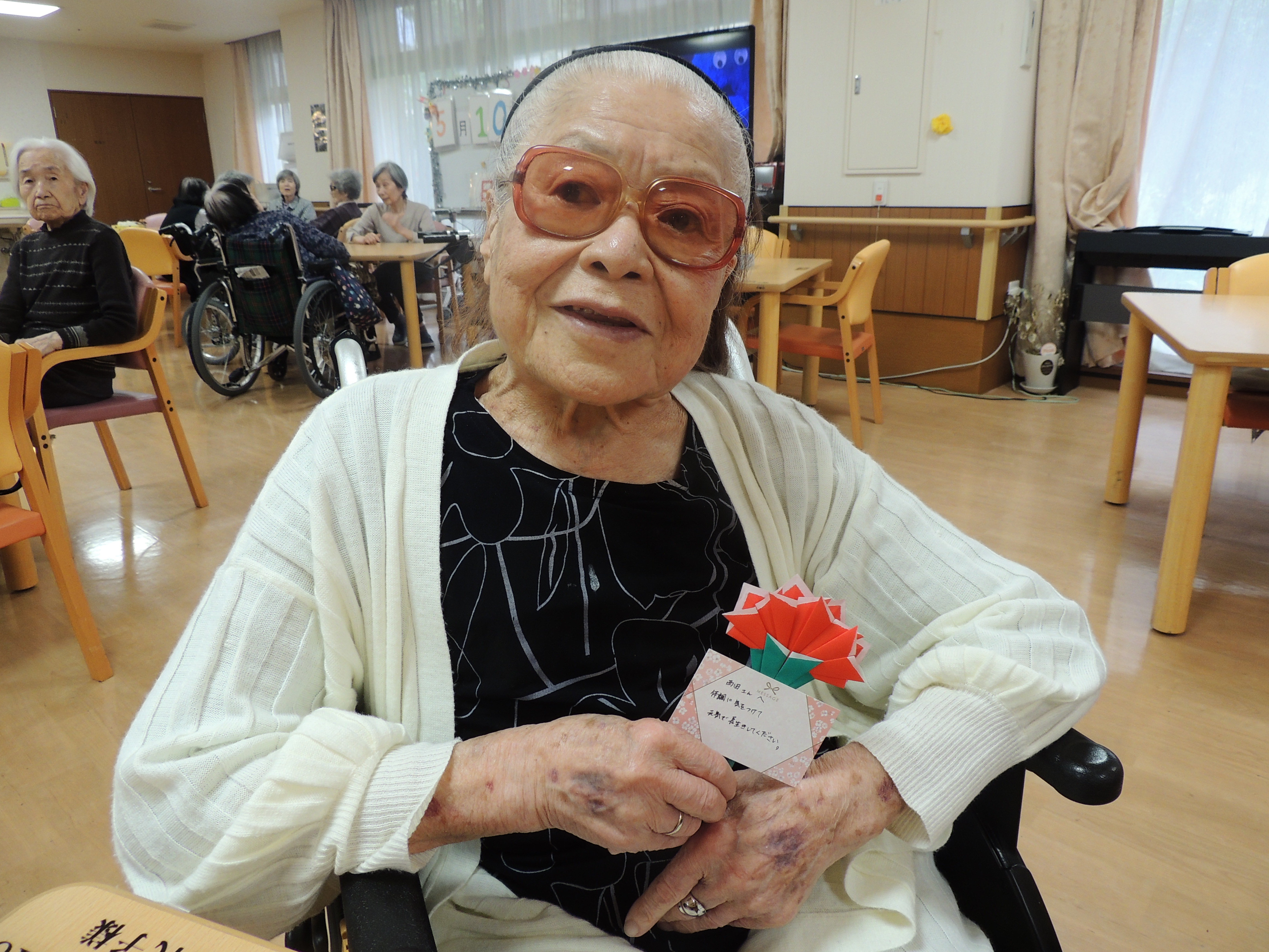 女性のご入居者にスタッフが折り紙で作ったカーネーションの花とメッセージカードを手渡しさせて頂きました。