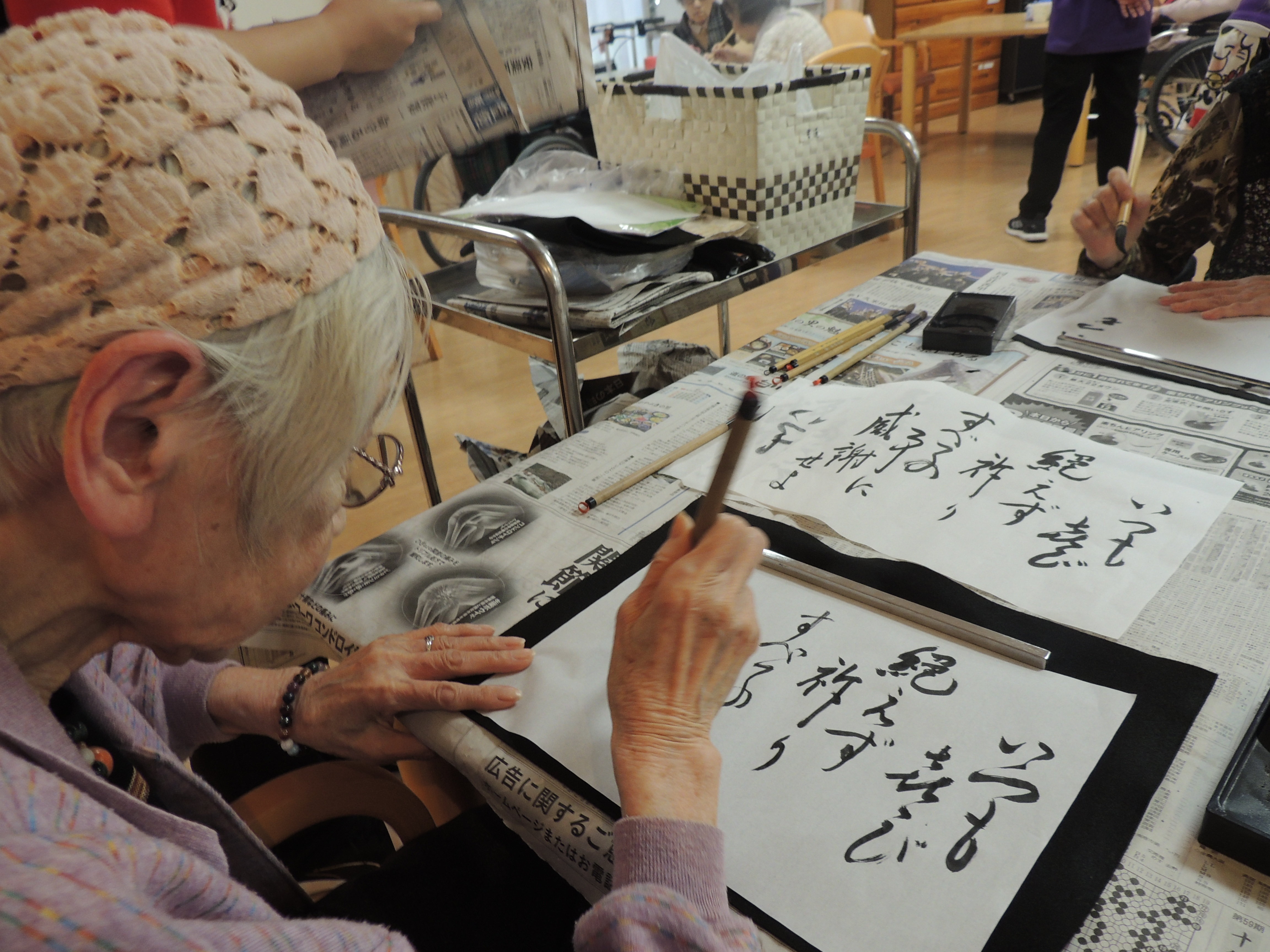 みとのご入居者は書道をやっていた方が多く、今回の自粛期間に実施しました。皆さん、久しぶりに筆で字を書かれていましたが上手にできていました。