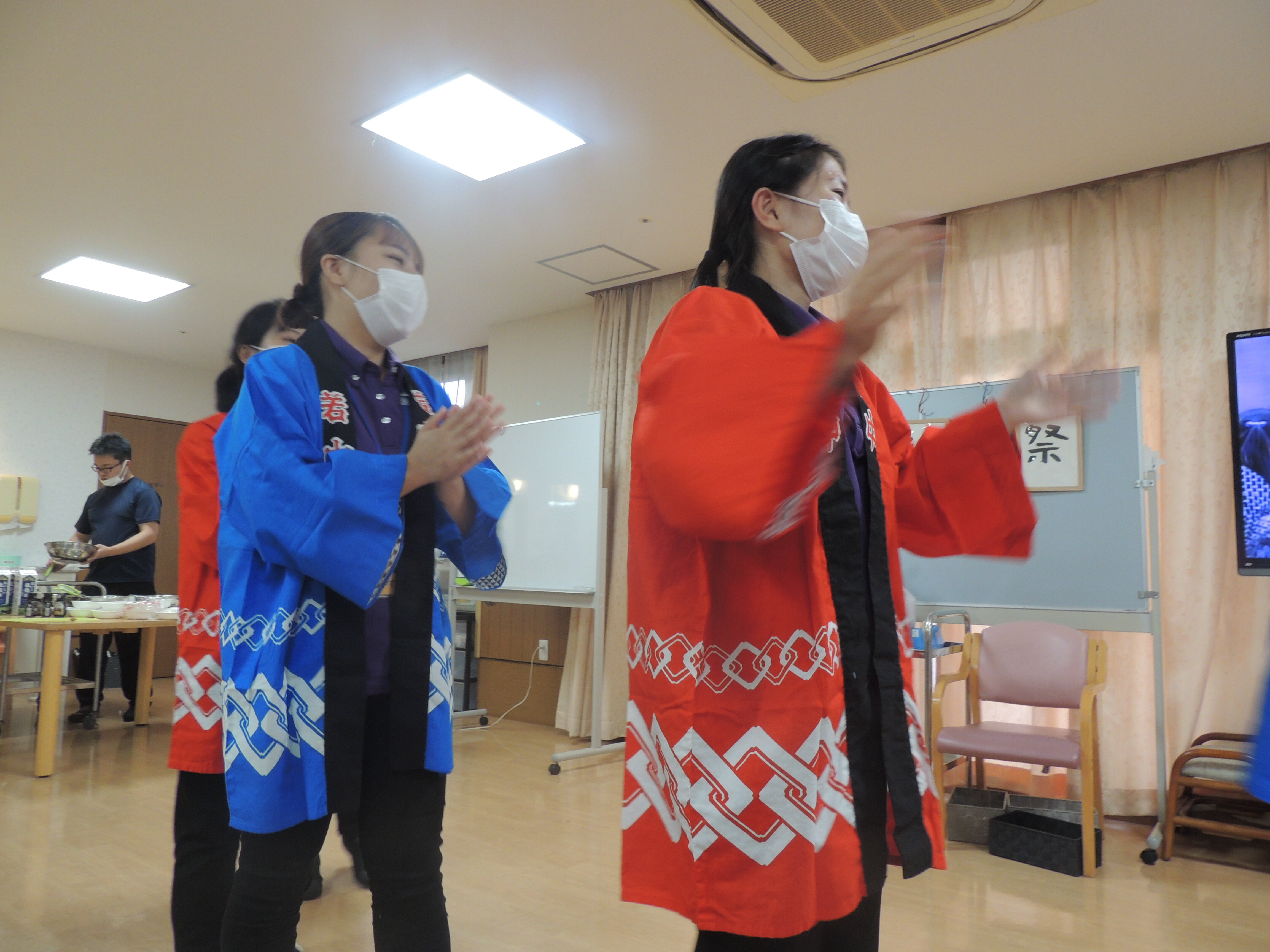 午後から、チョコバナナ、パンケーキの提供と職員による民謡と盆踊り、漢字ビンゴ大会をさせて頂きました。盆踊りは体操の時間に練習したこともあり、ご入居者の皆さんも手を動かされたり歌を口ずさんだりとされていました。