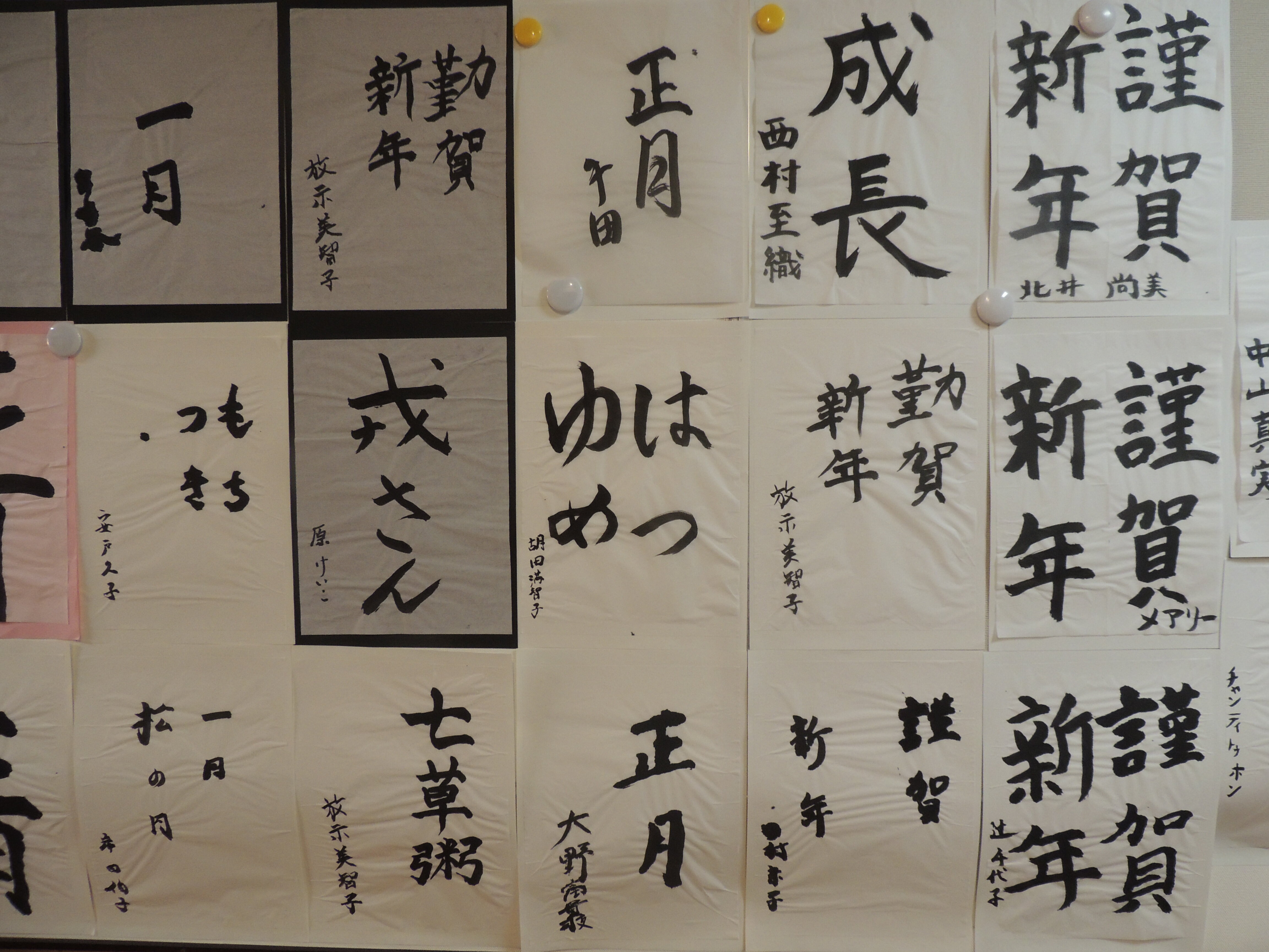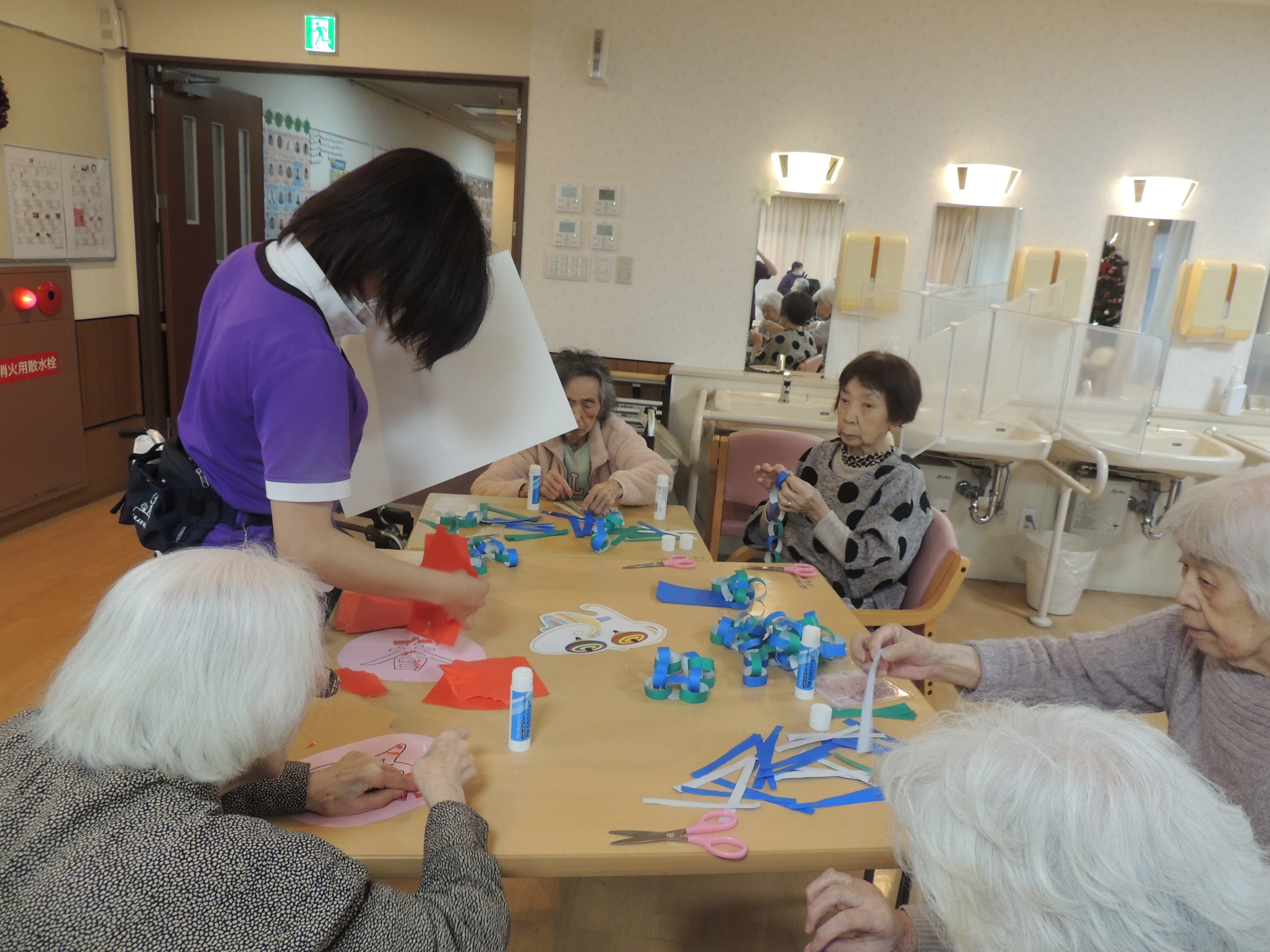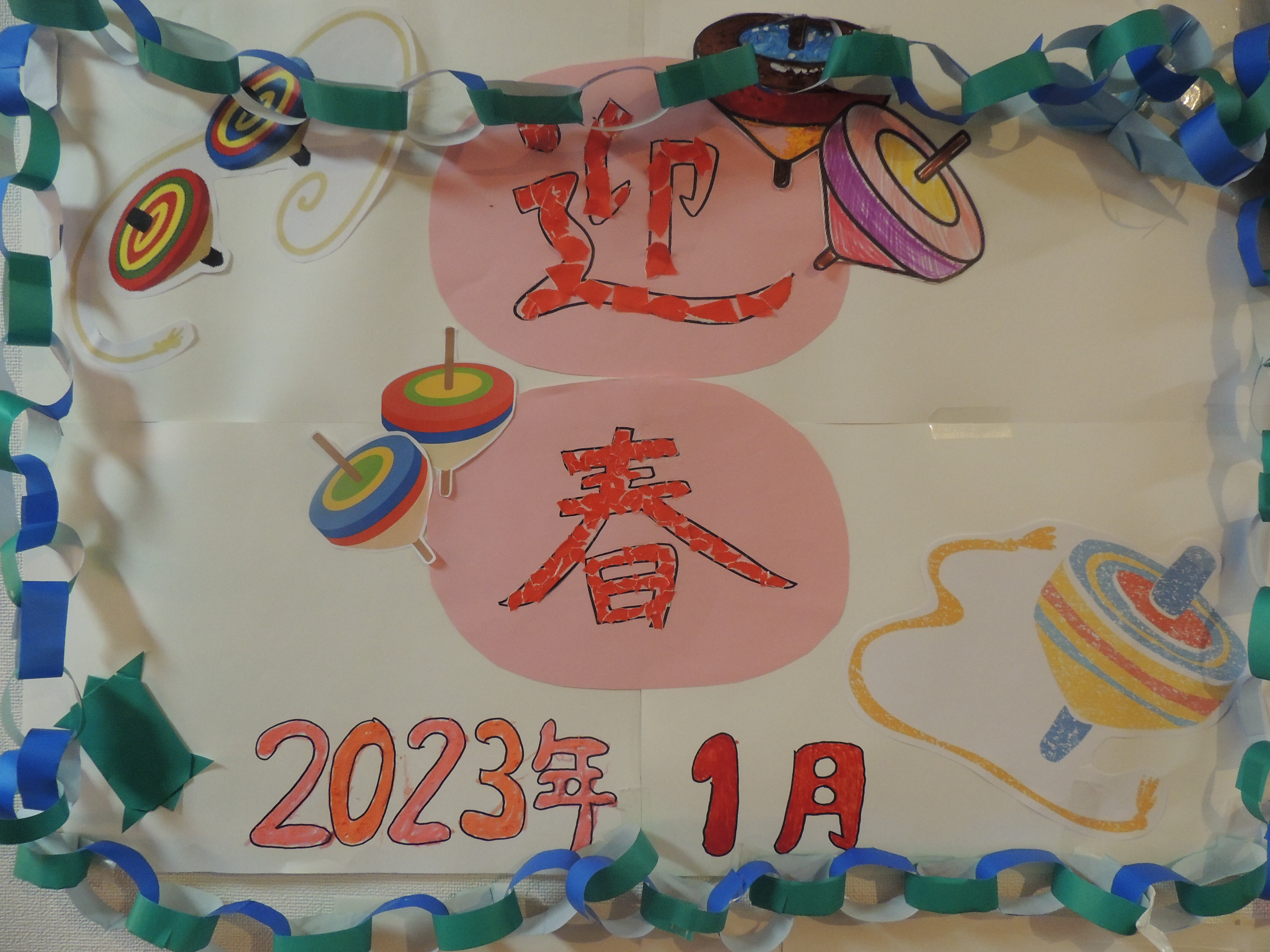 折り紙をちぎって文字に貼り付けたり、折り紙で輪っかを作ったり、駒のイラストを切って貼ったり、塗ったりして壁画を作成させました。
