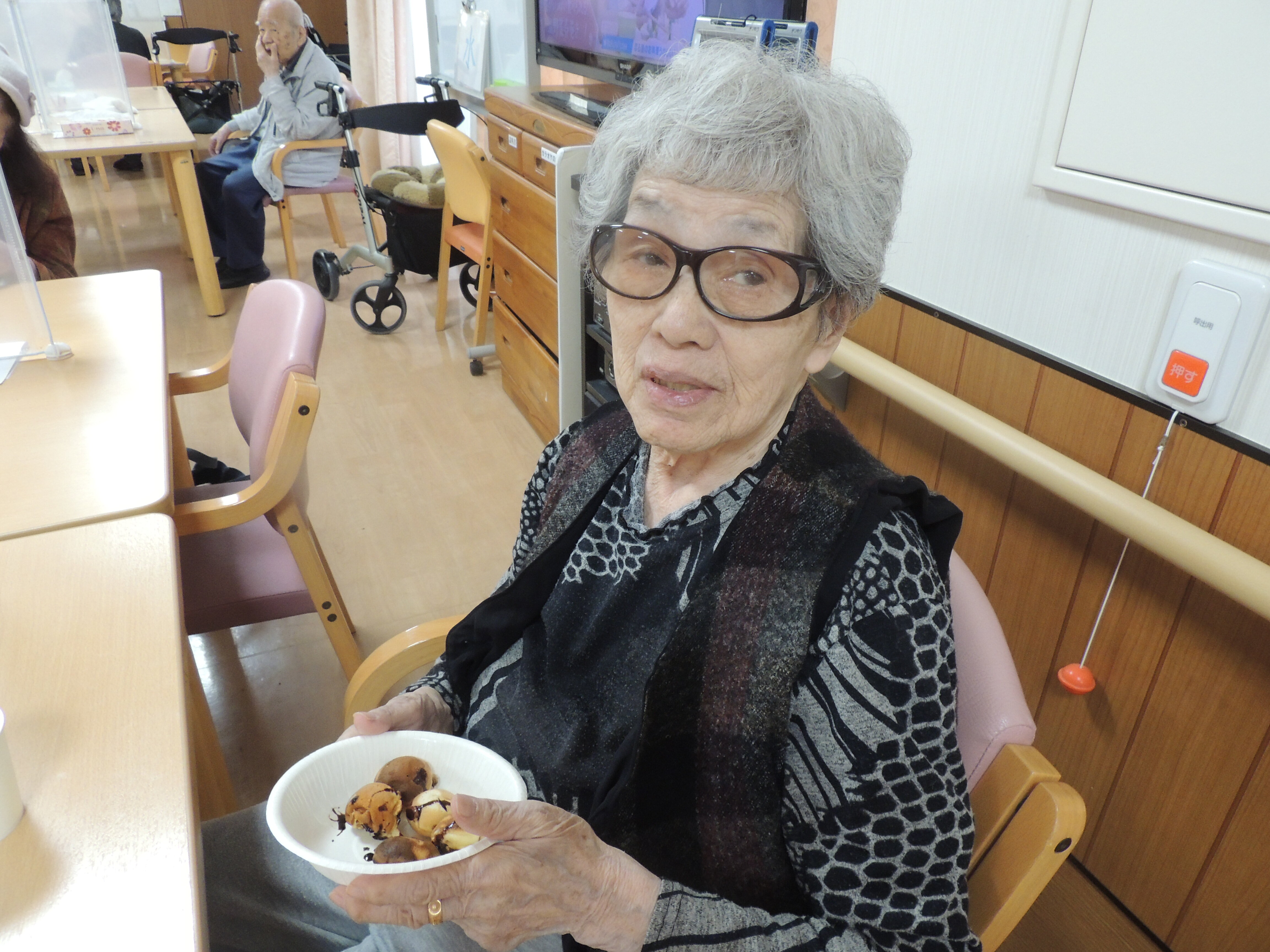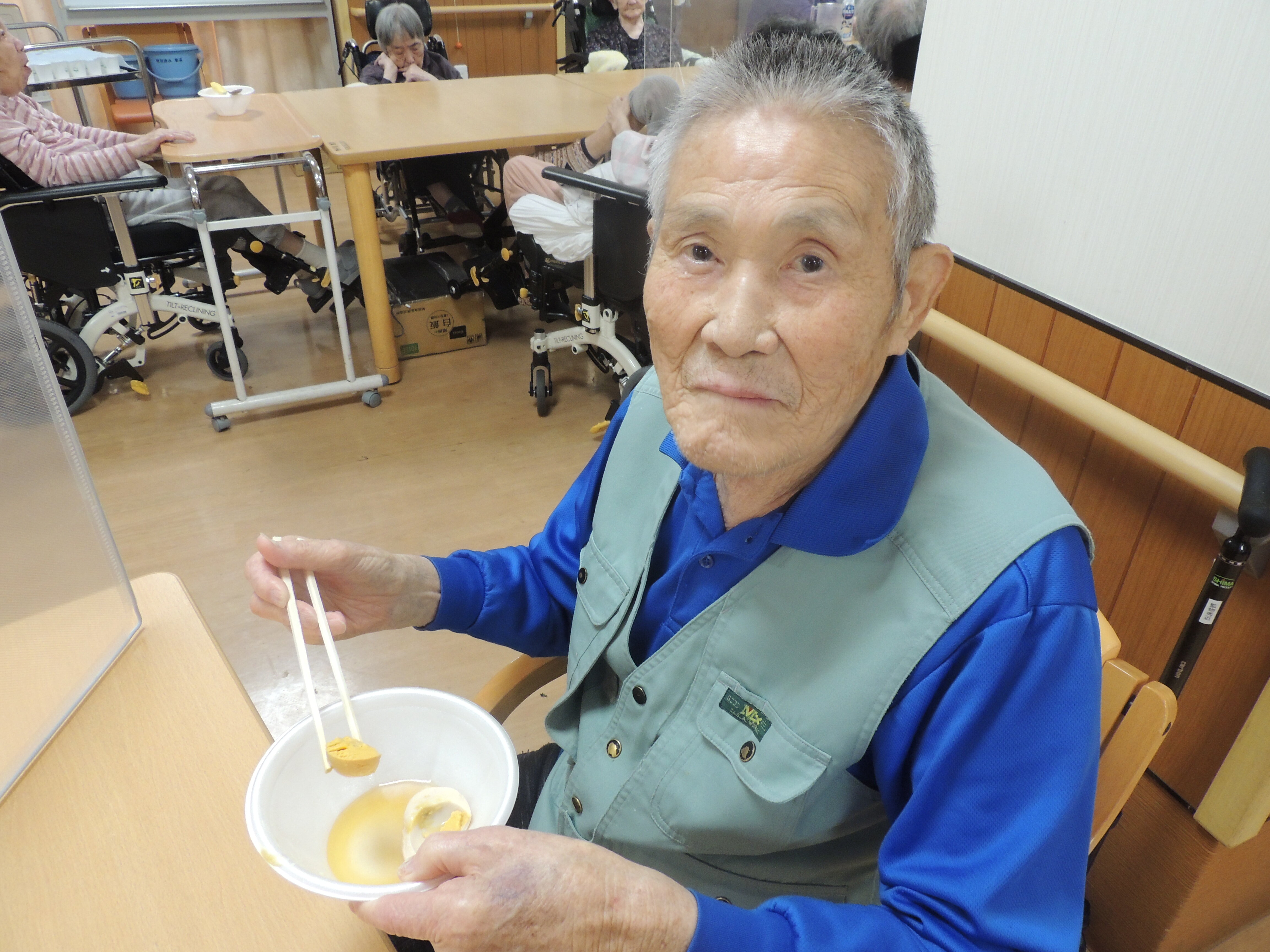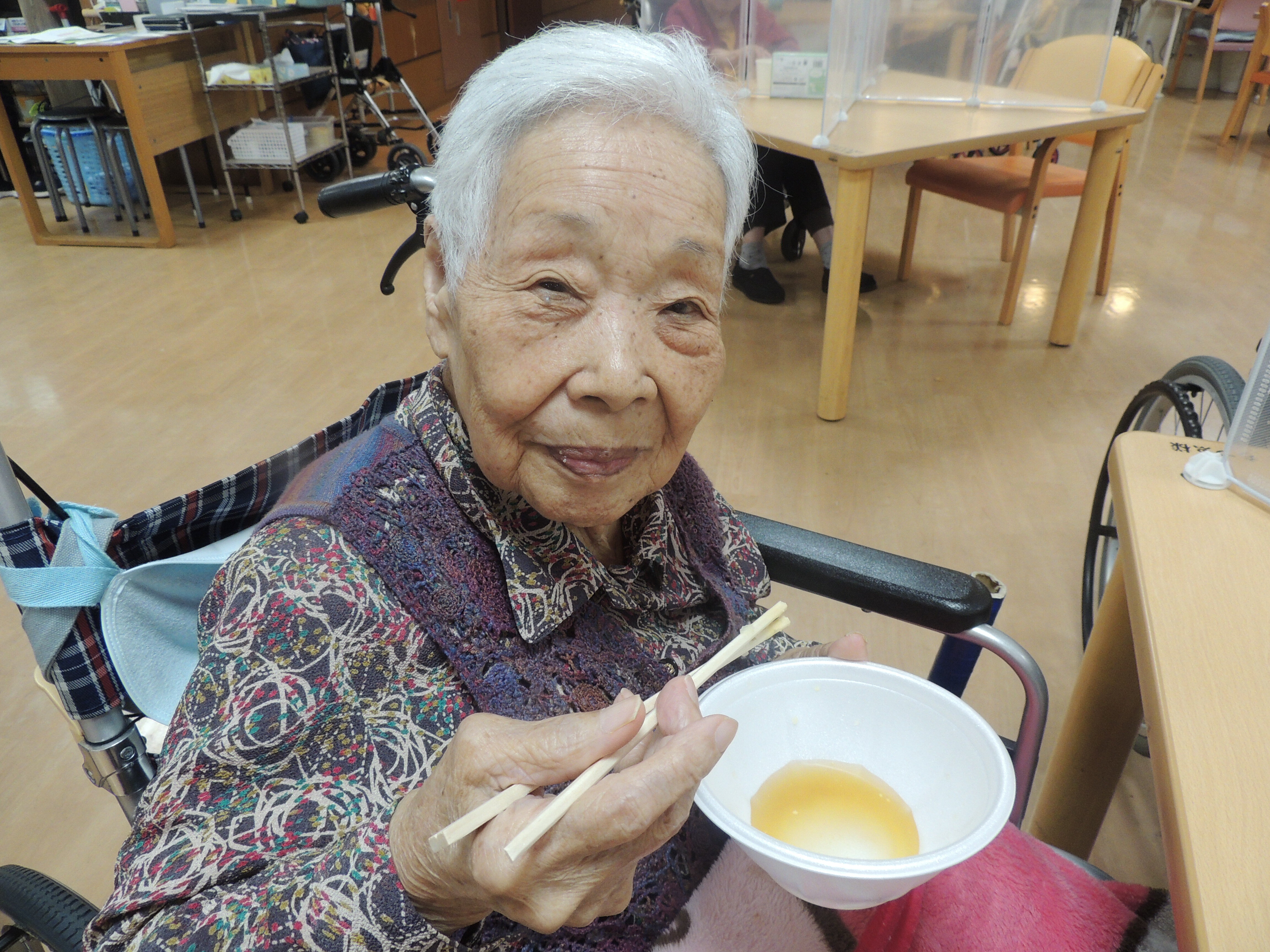 おでんの具は玉子・大根・じゃがいも・はんぺん・厚揚げ・小判焼きでした。ご入居者の皆さんに食べたい物を選んで食べて頂きました。