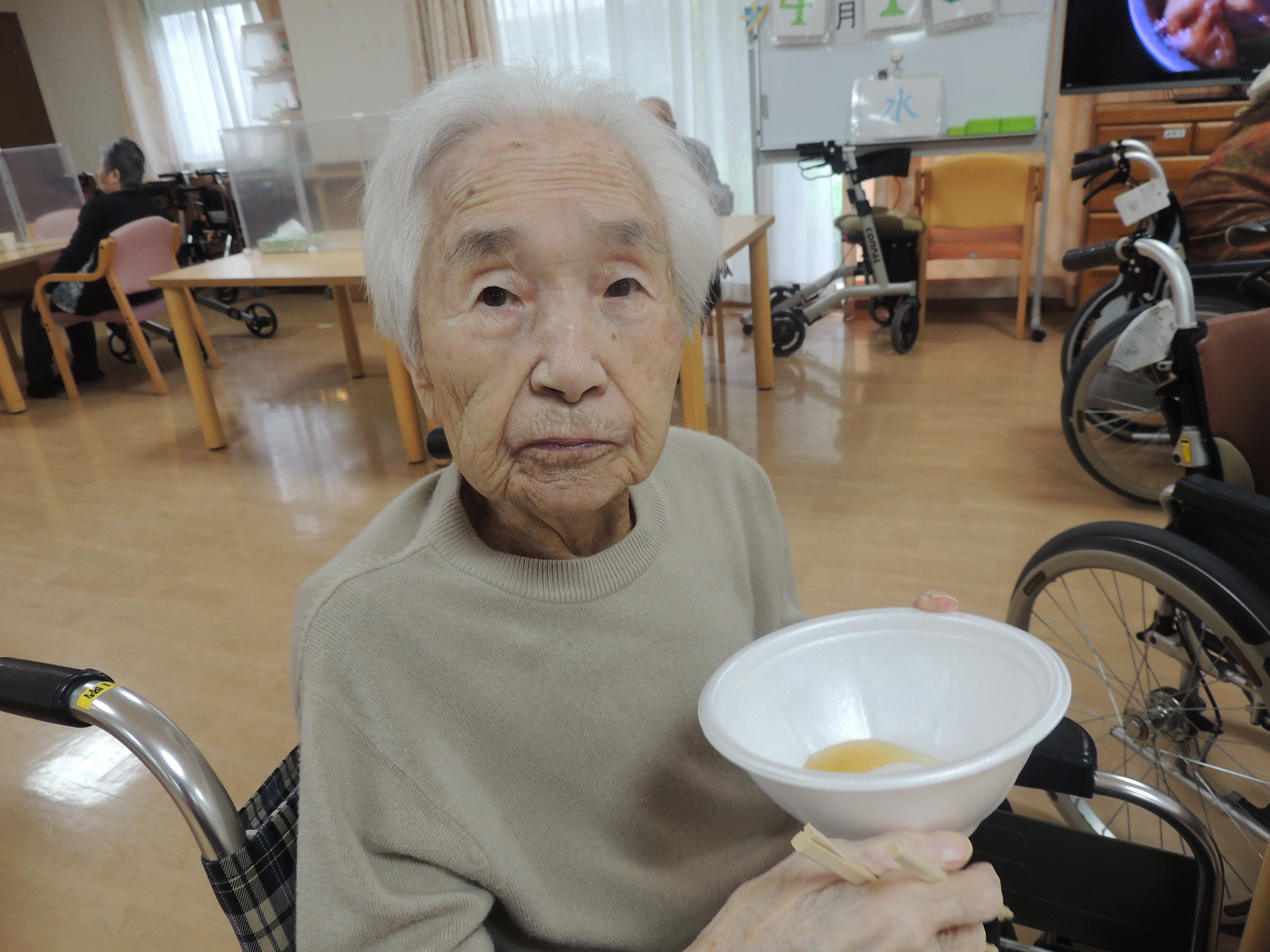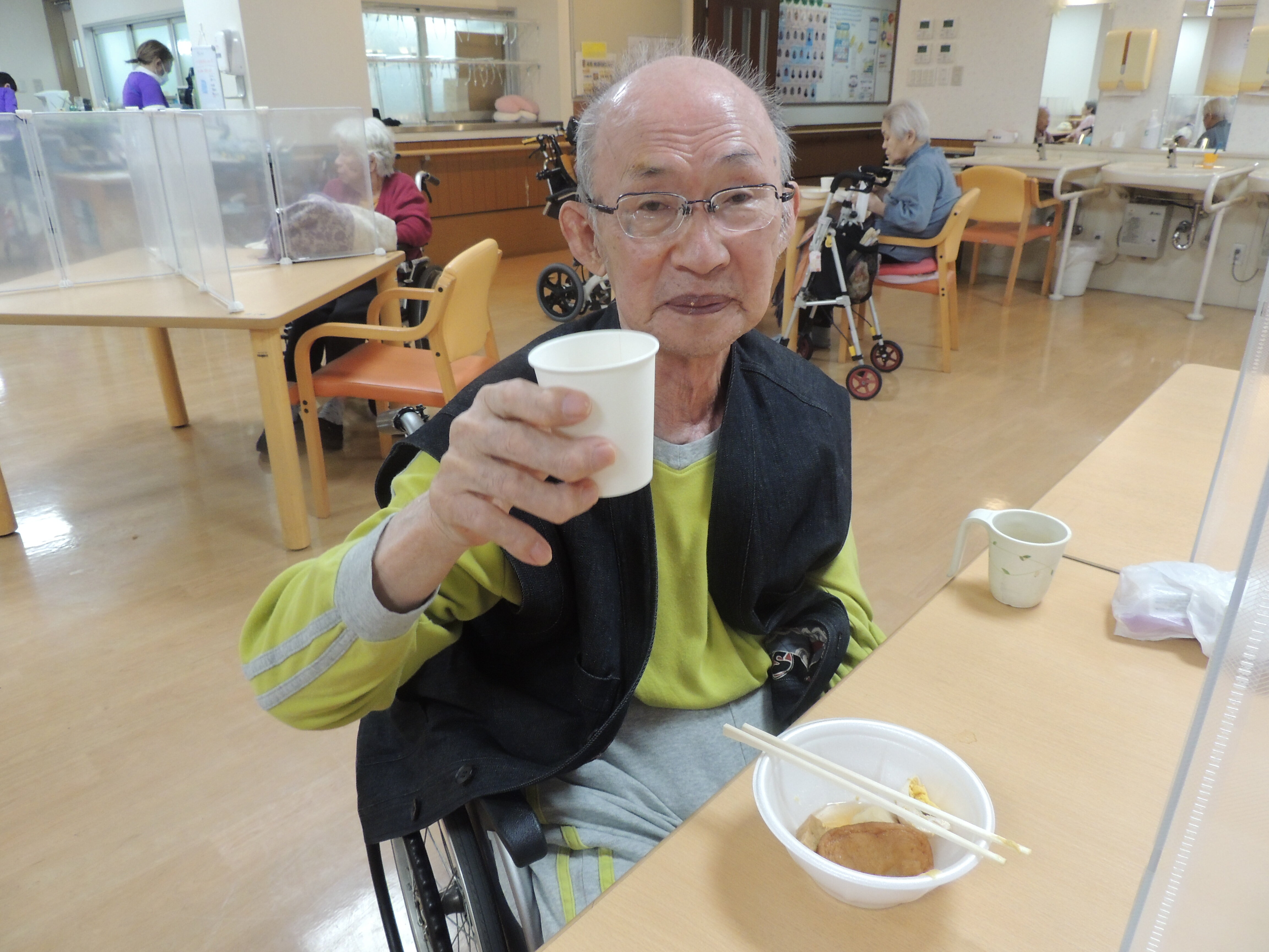お酒は飲めないですが、ノンアルコールビールで少しお酒を飲まれた気分になられ『美味しいわぁ~』と言われていました。写真は都合上お見せできないですが食席が同じ方で乾杯して楽しんでいる様子も沢山見られました。写真は施設の1階廊下に掲示していますので来館時に是非見て頂きたいです。