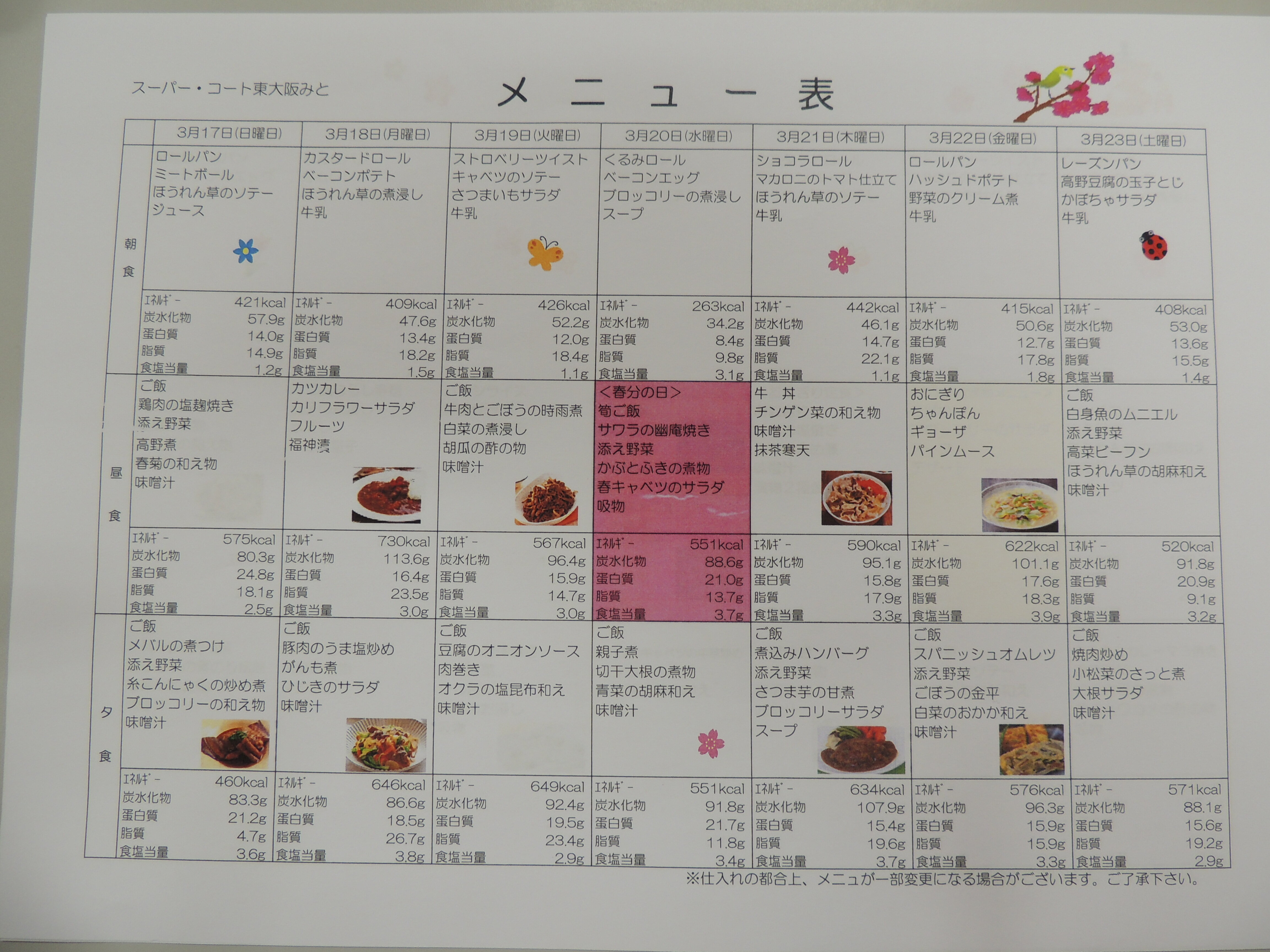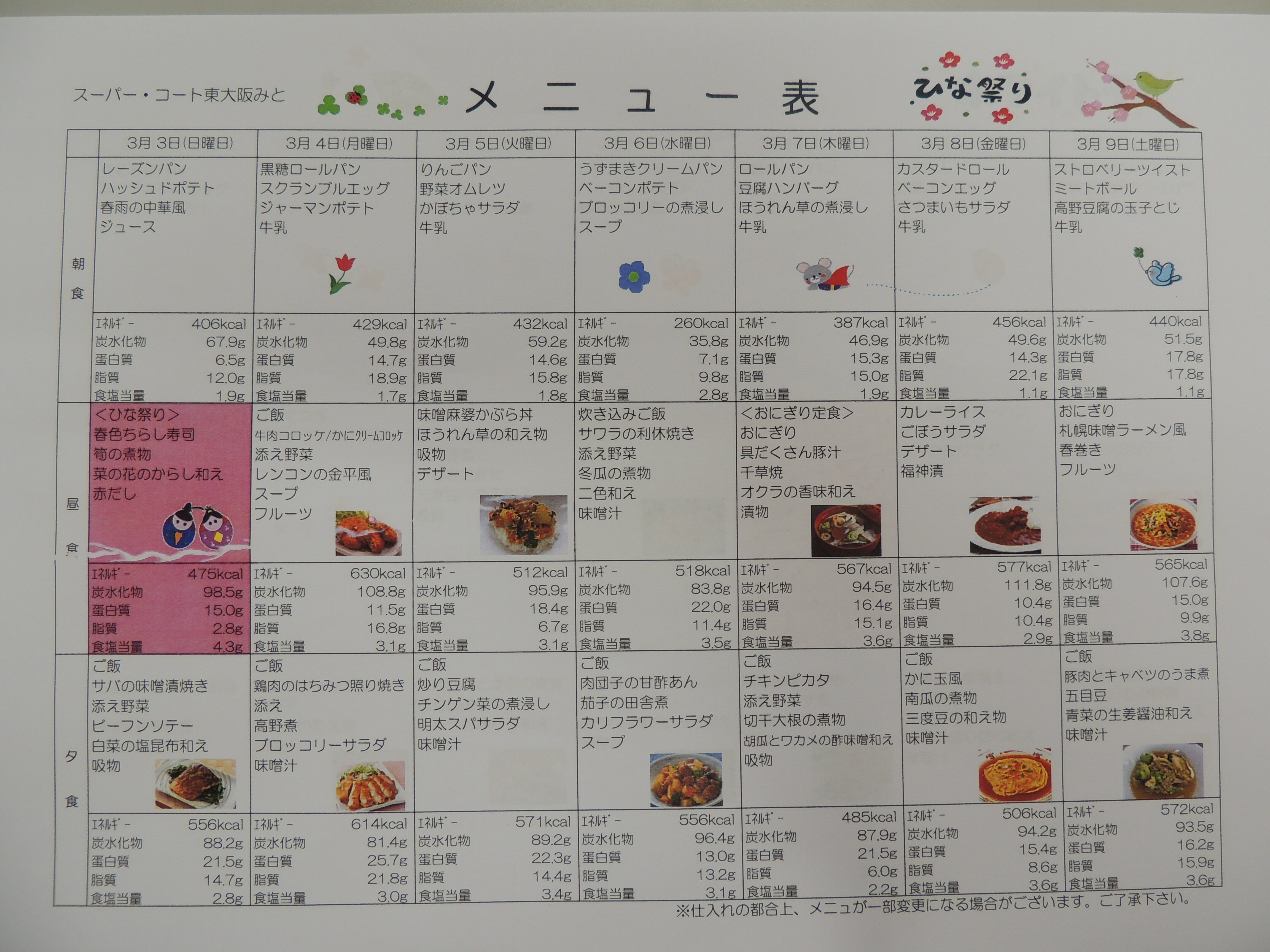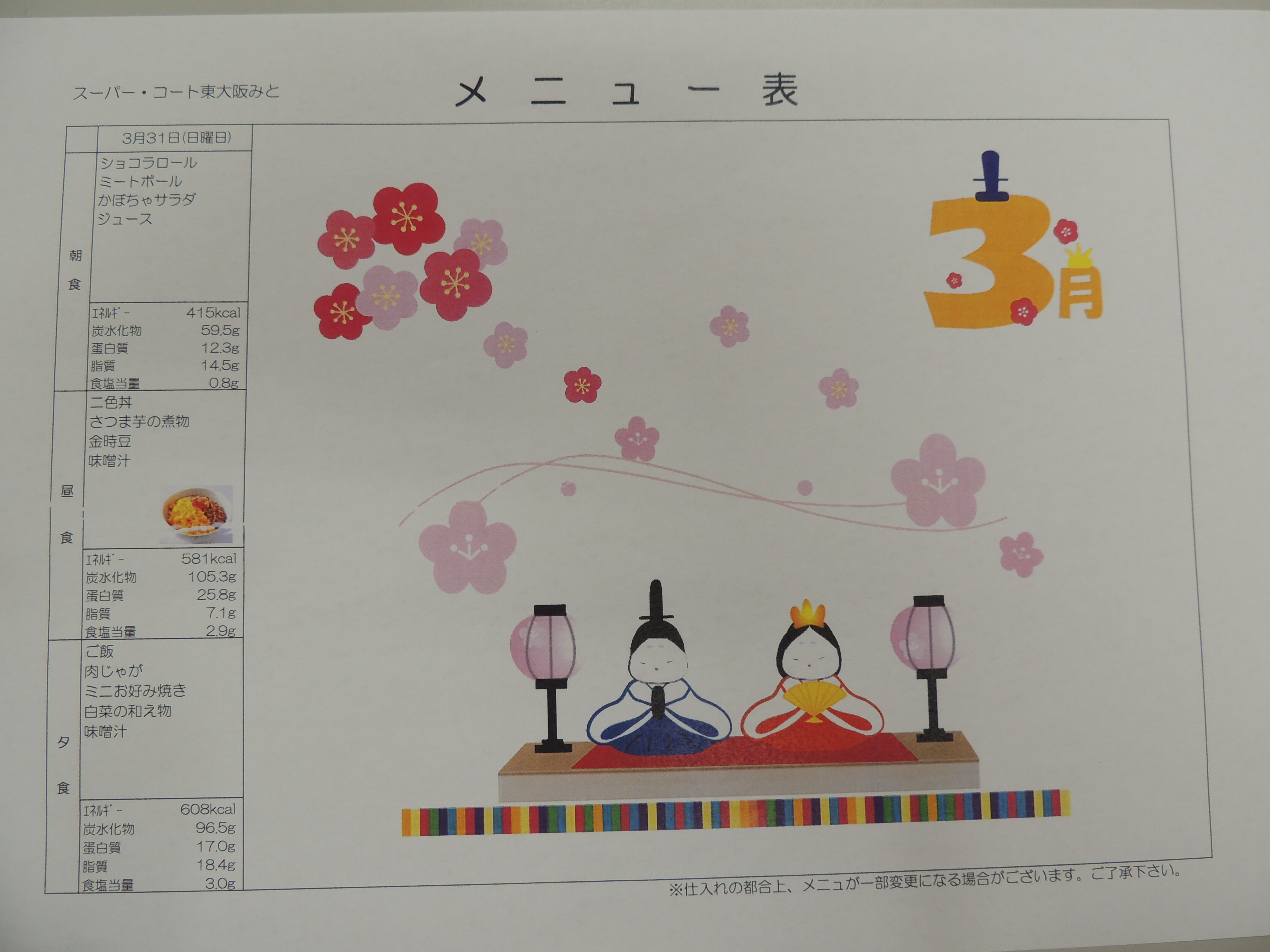 本日は3月の献立表をご紹介いたします。