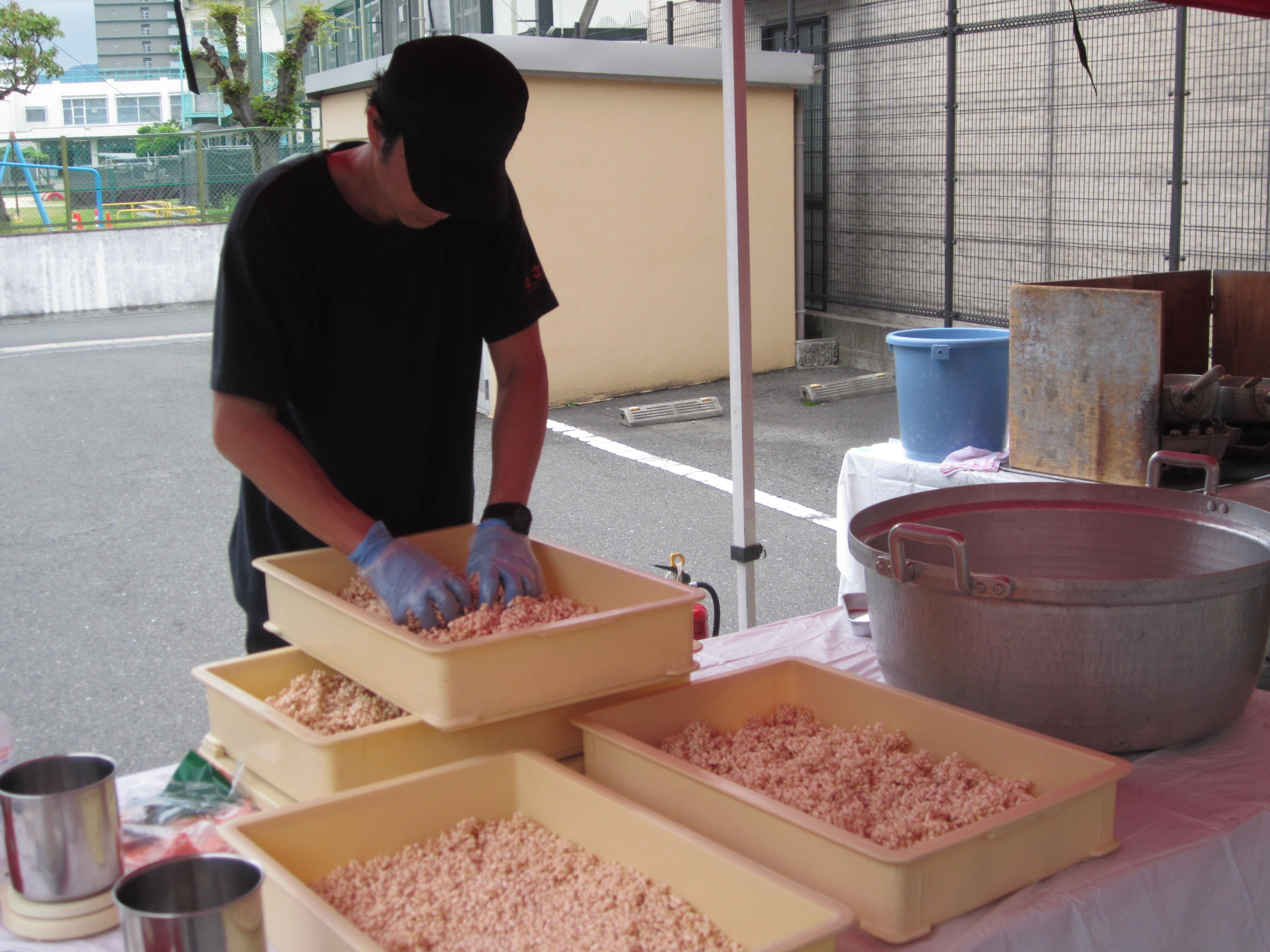 出来上がったポン菓子に煮詰めた砂糖を絡めていきます
