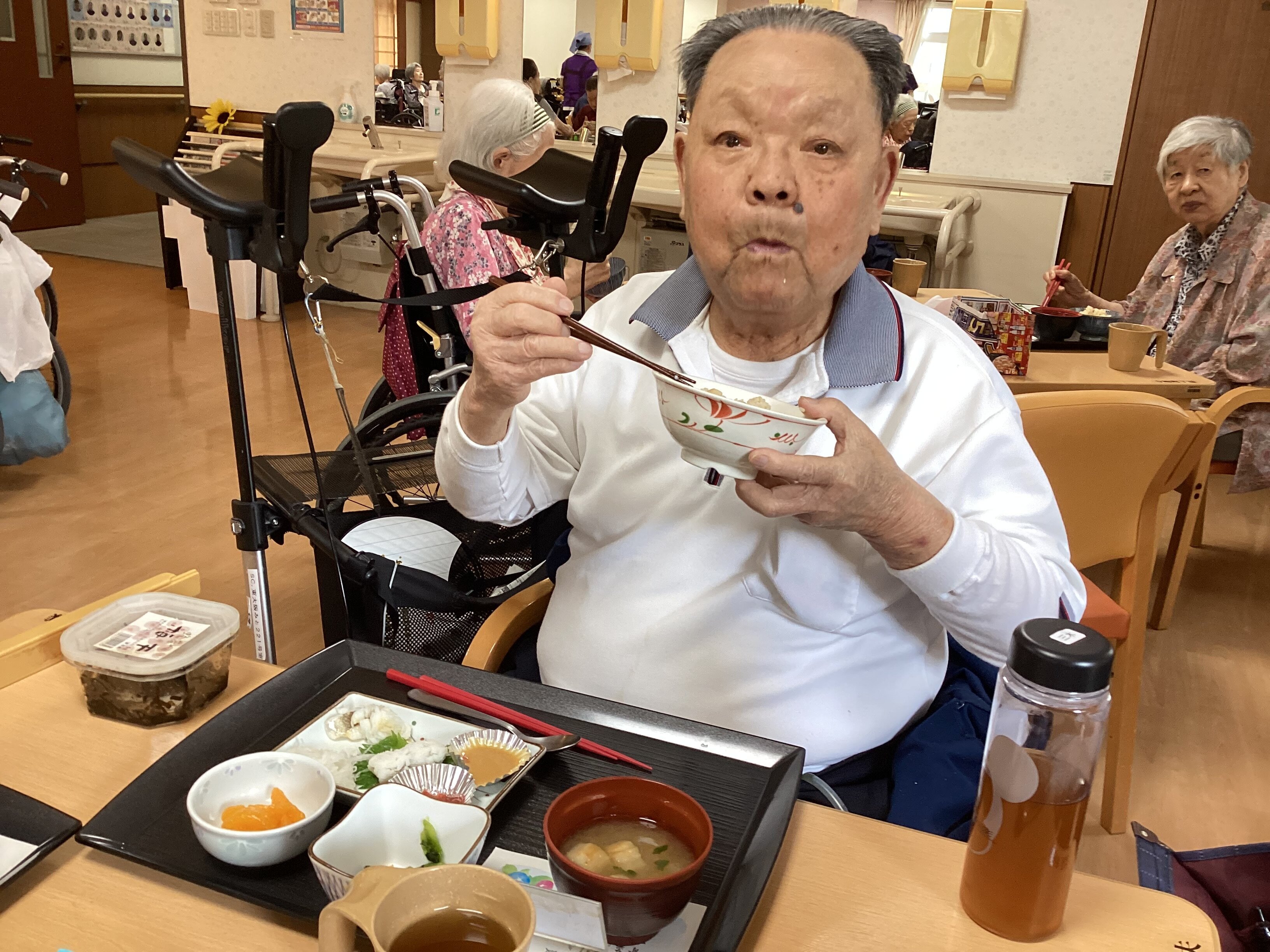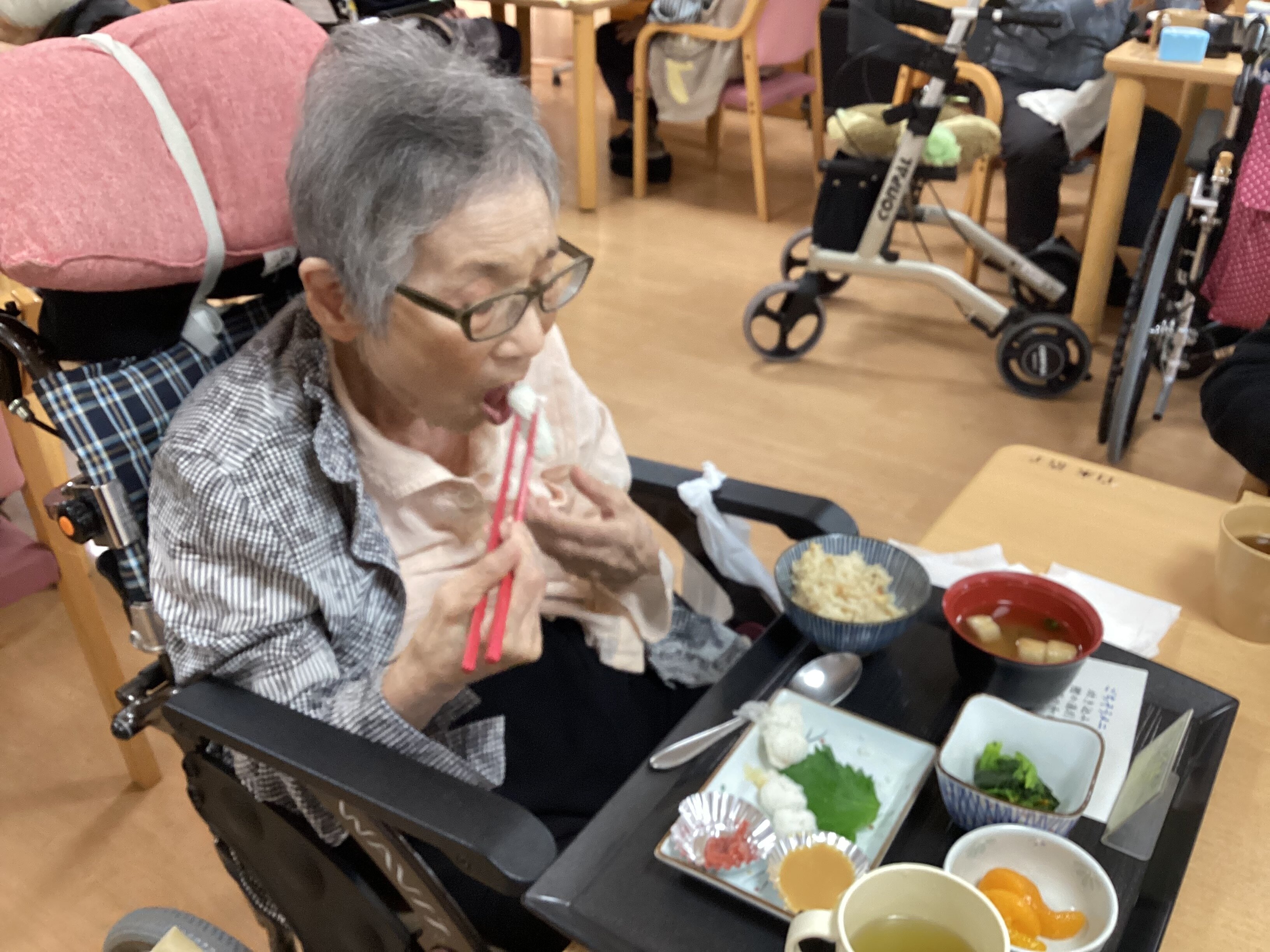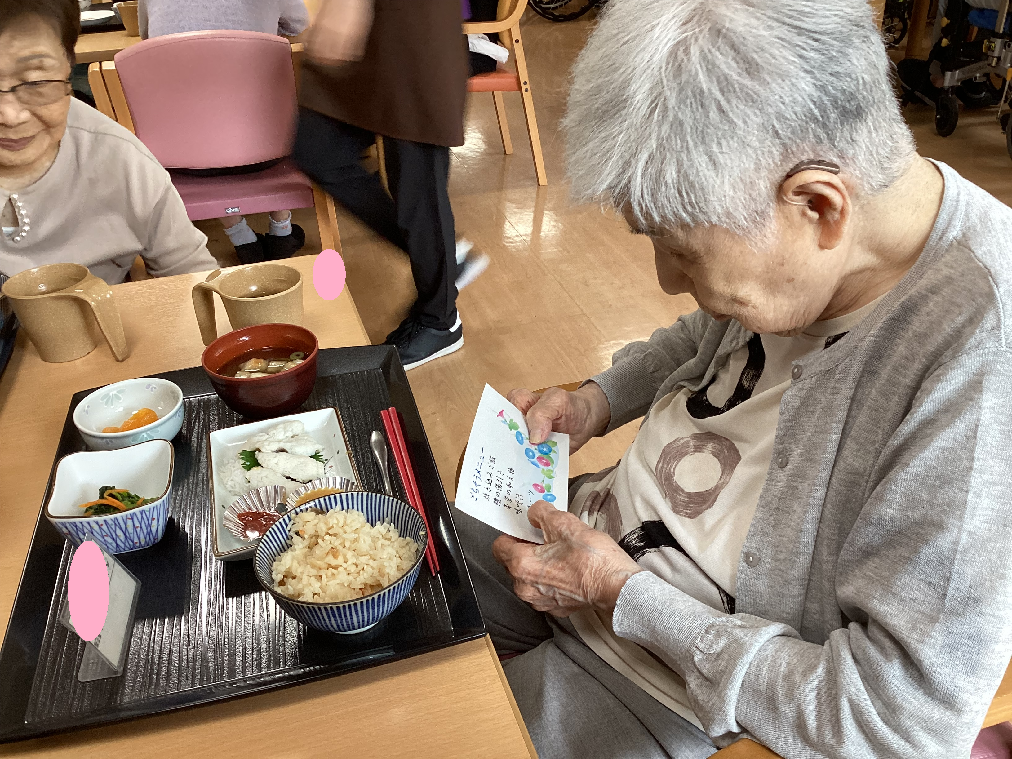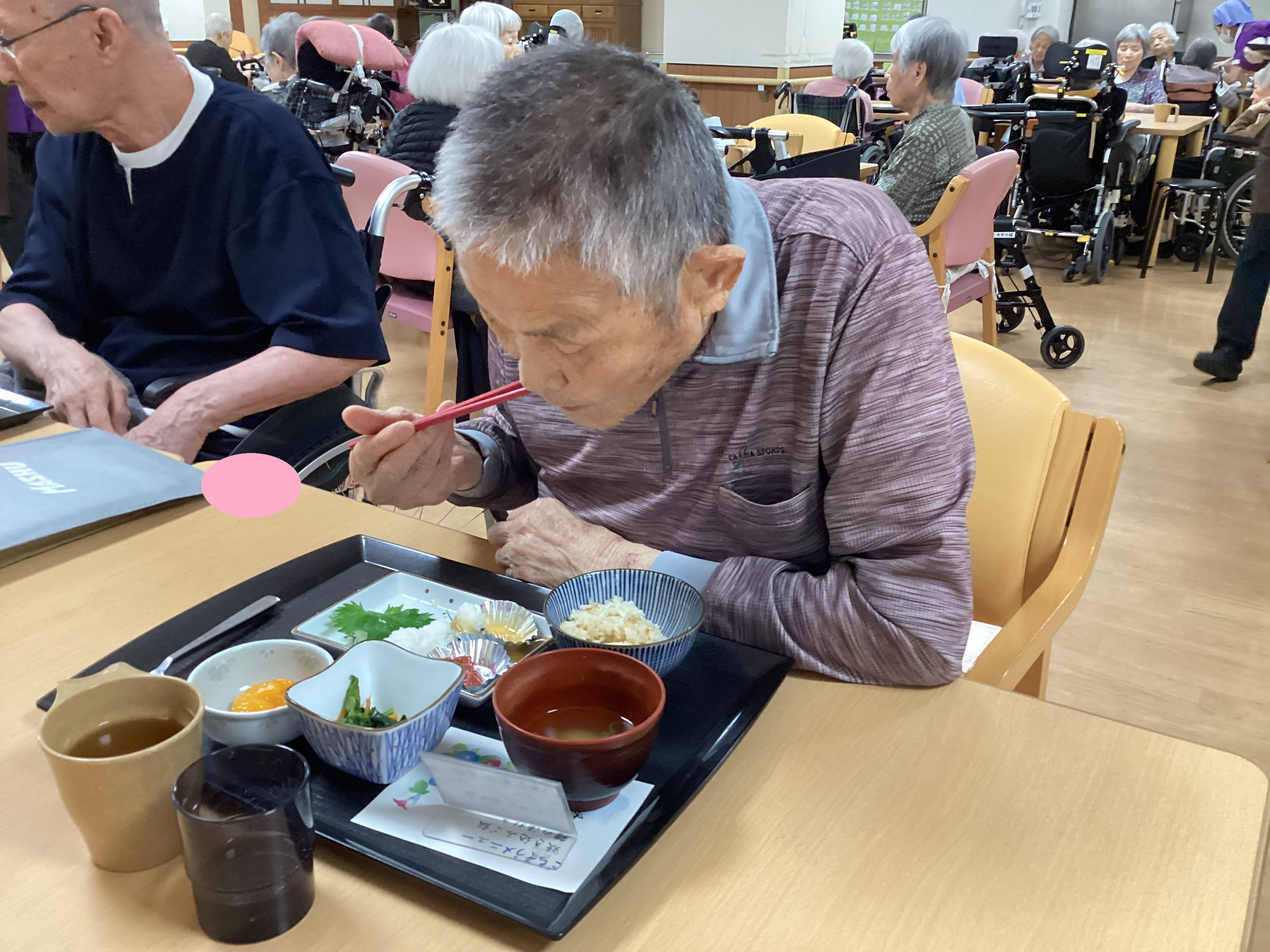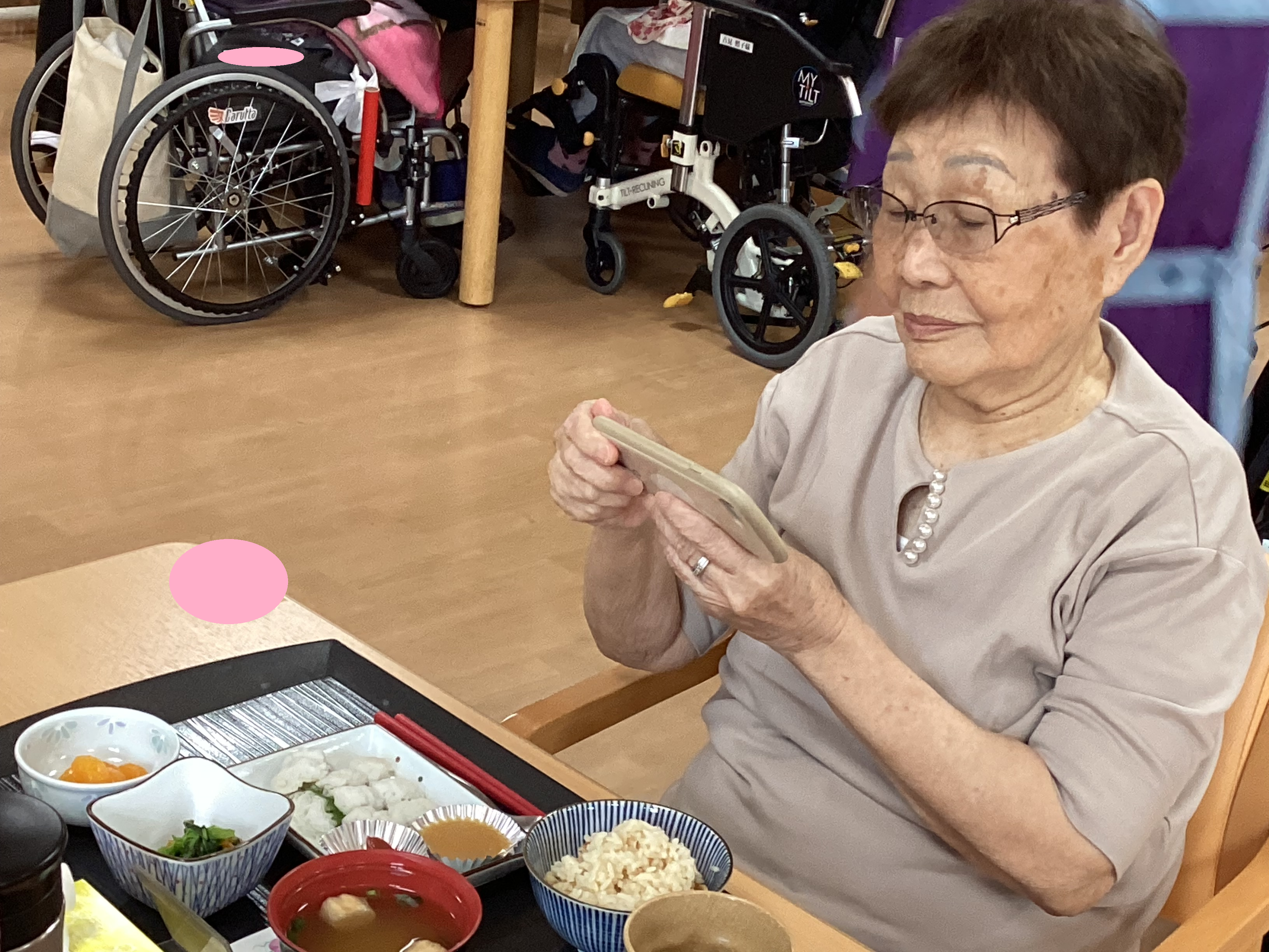 召し上がられる前に説明書きの用紙を熱心に読まれてご入居者同士でも