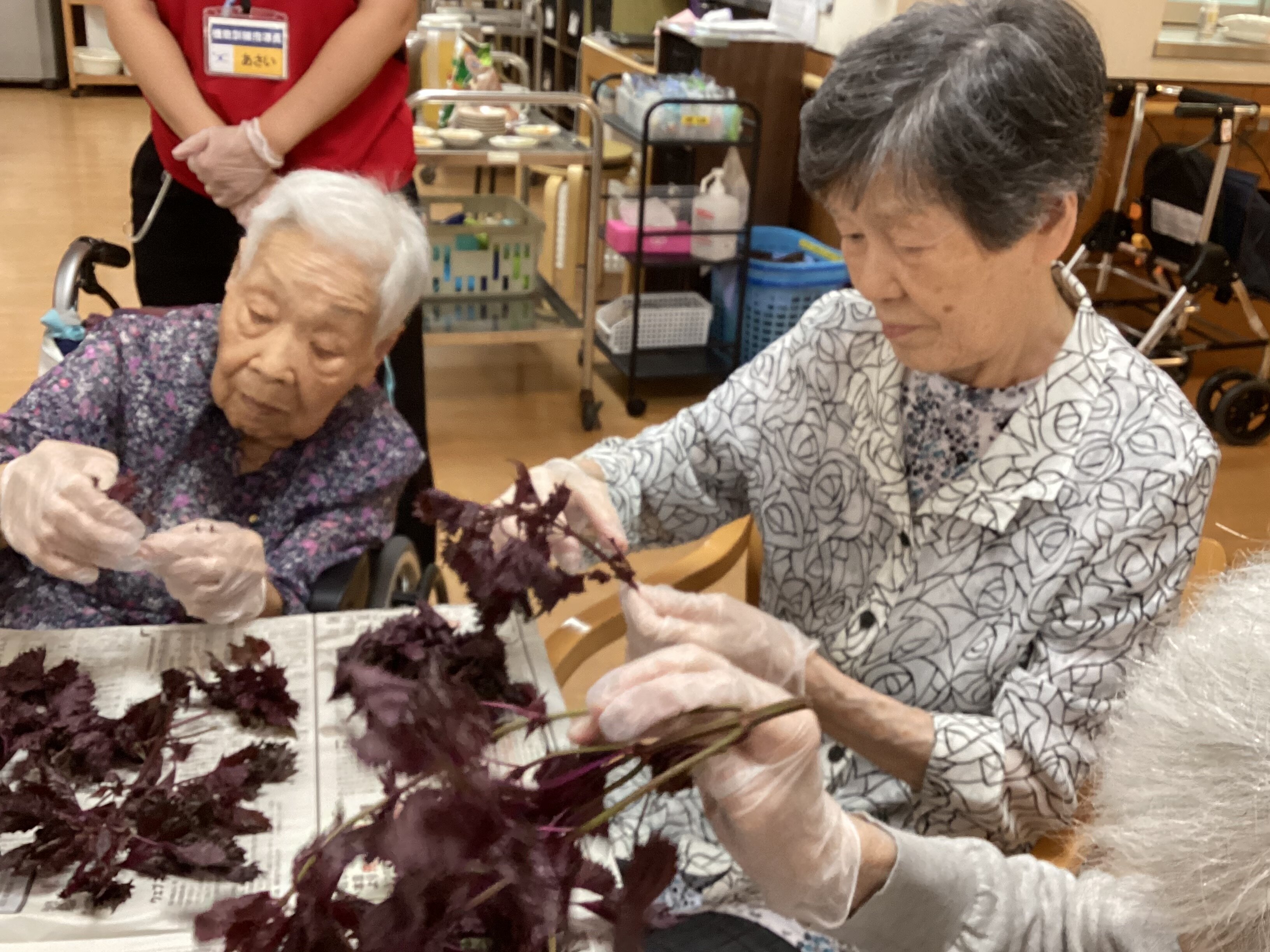 赤紫蘇は枝に付いた葉っぱをご入居者様に取ってもらいました。