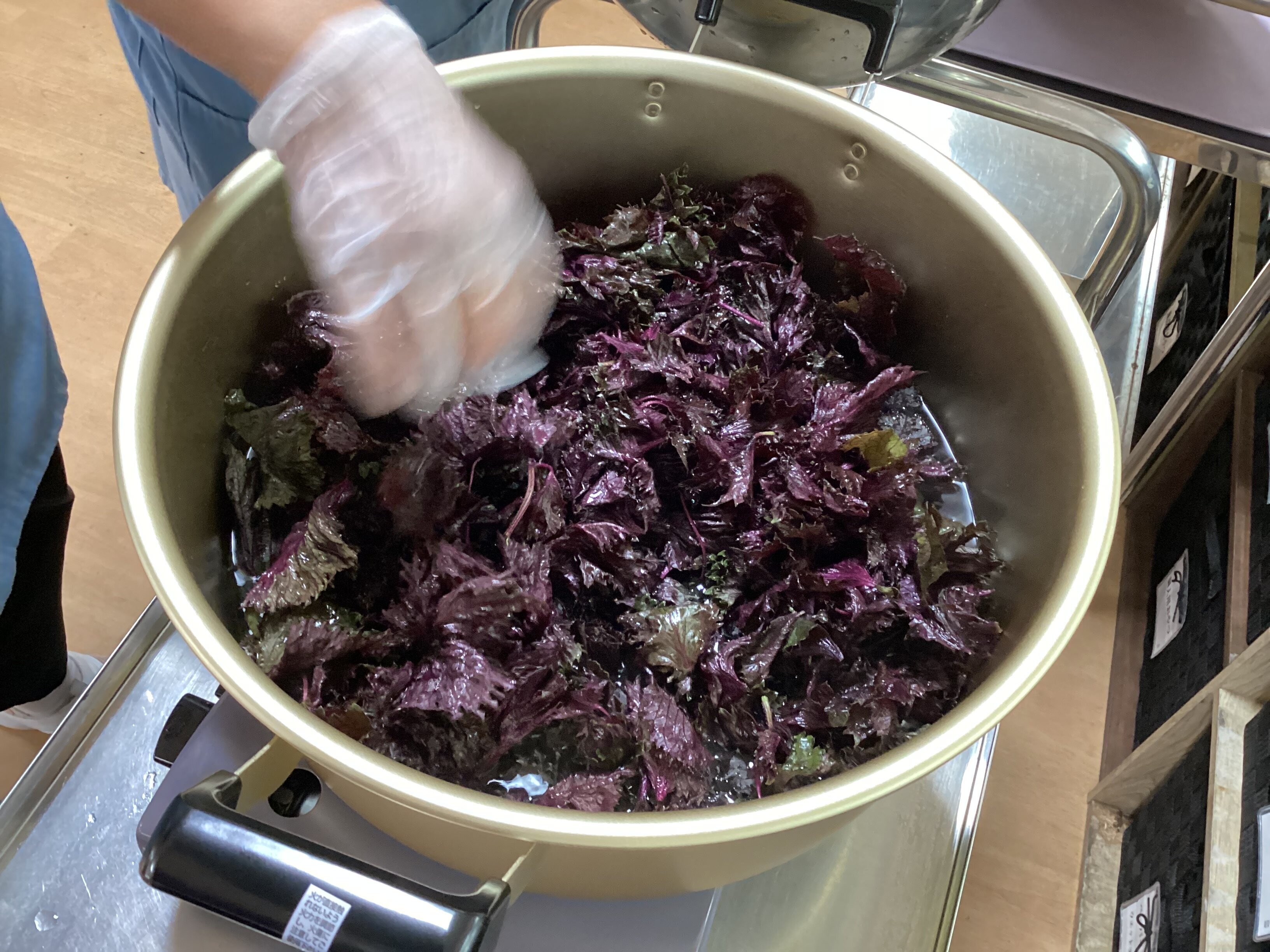だんだん煮汁に色がついて、しそのにおいもしてきました(*^-^*)