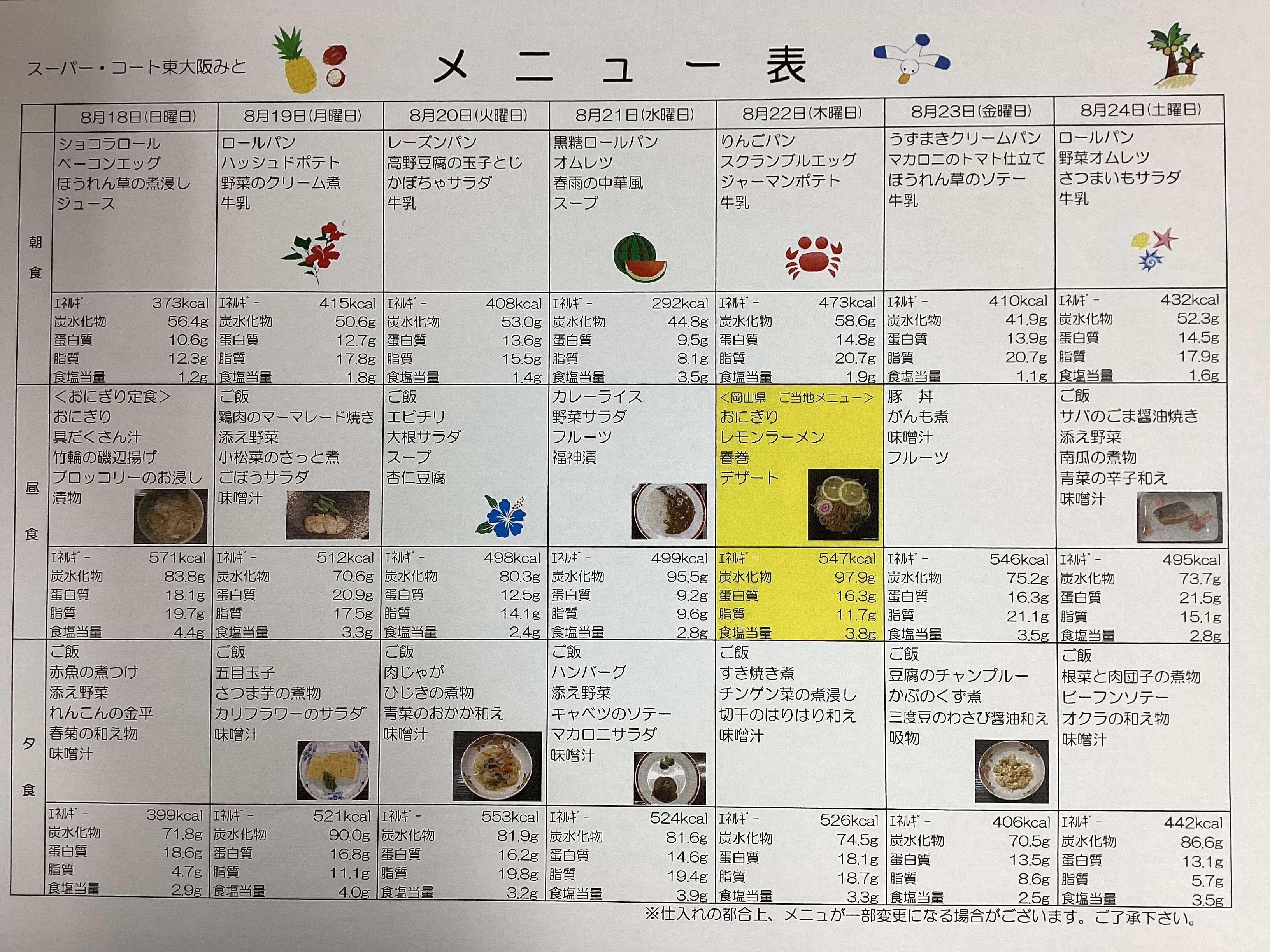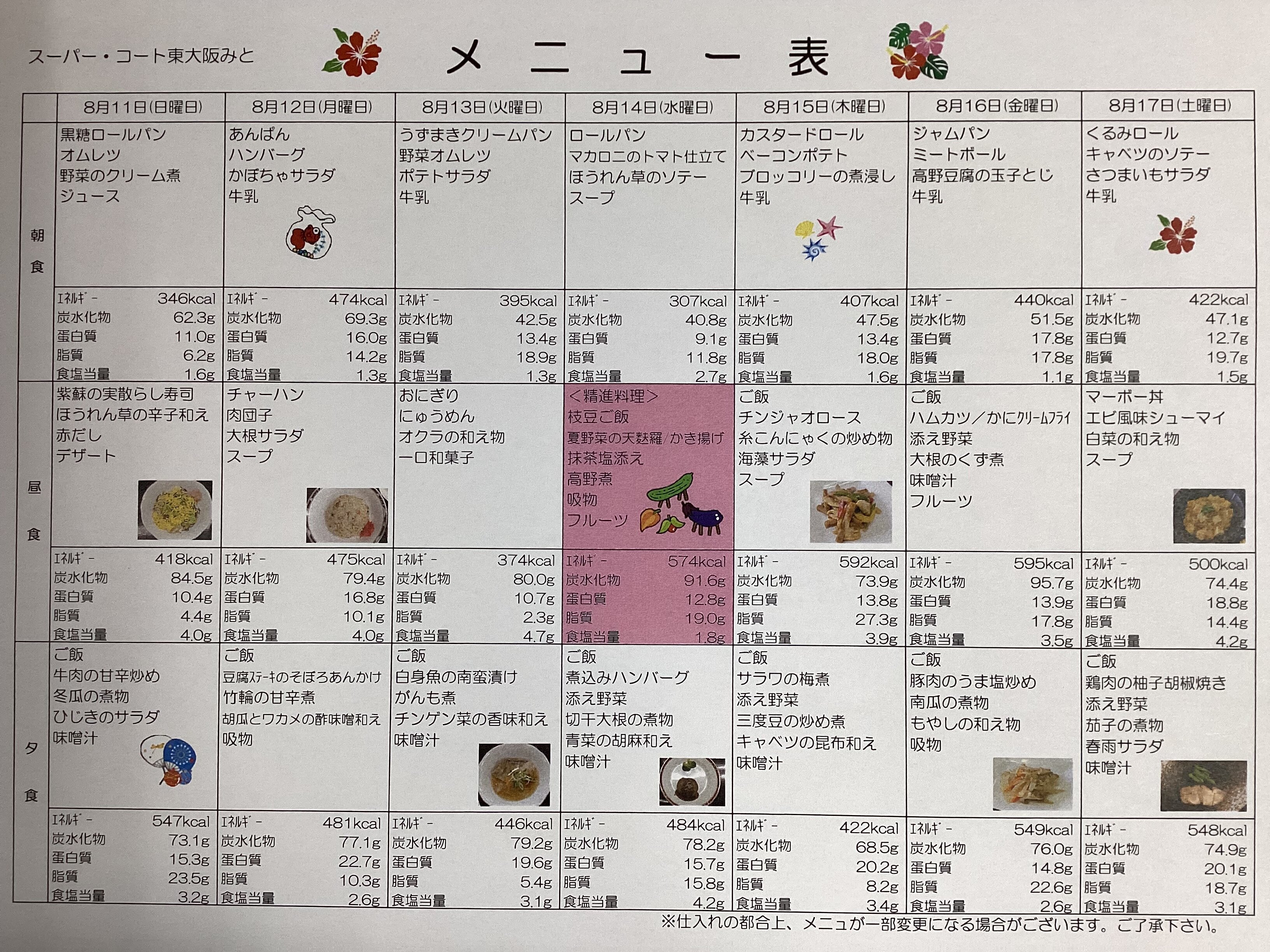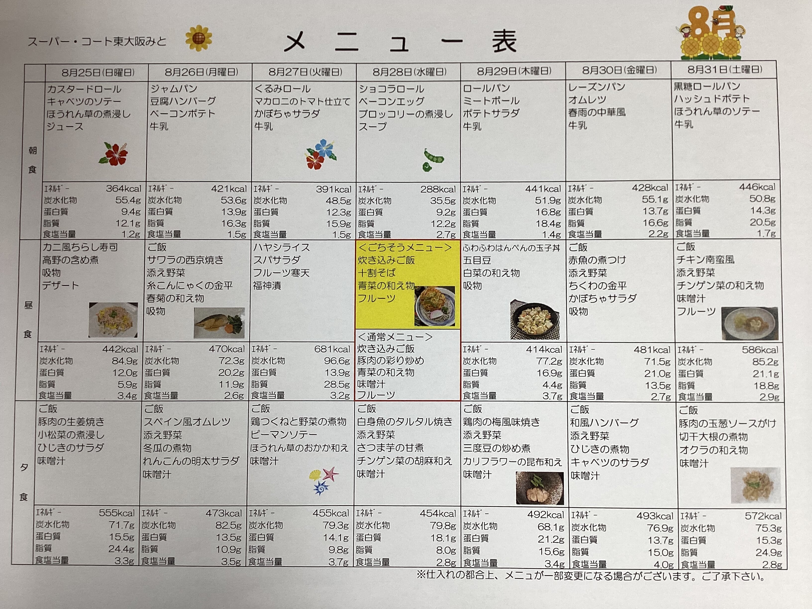 今回は8月後半の食事メニュー表を紹介します!(^^)
