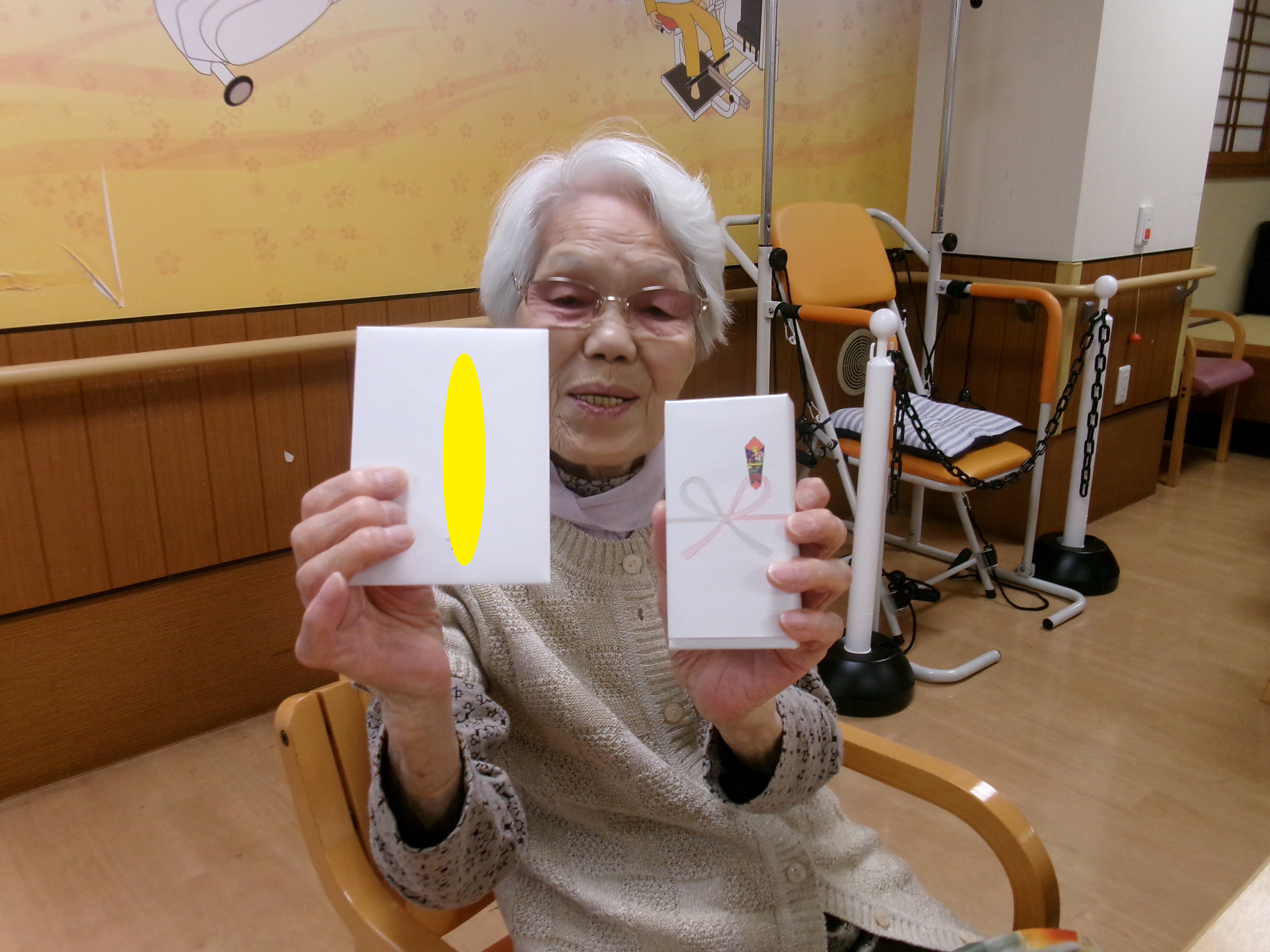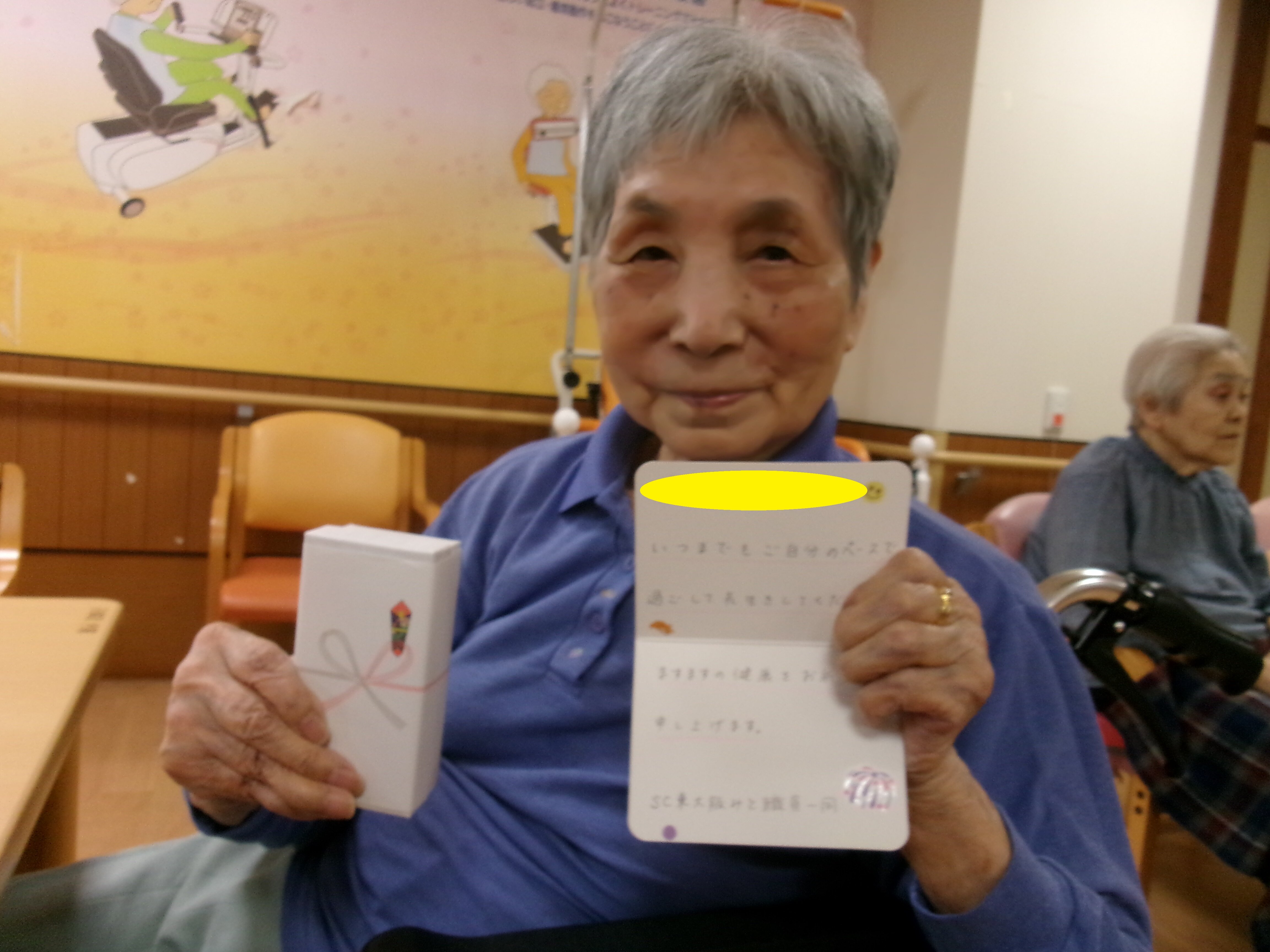 全入居者様に紅白まんじゅうとメッセージカードを用意しました(食事形態に合わせてプリンも用意させていただいてます)。