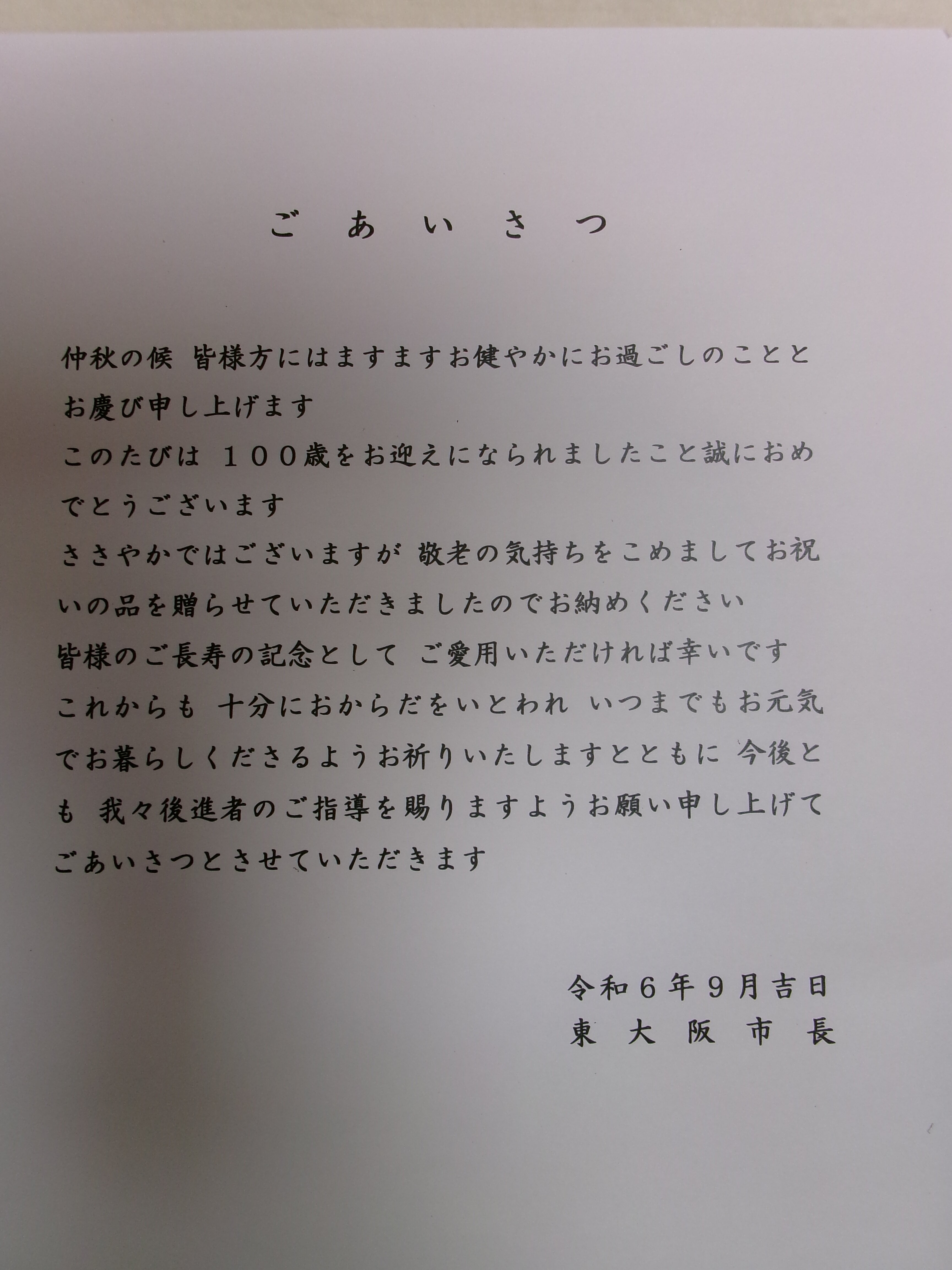 先日東大阪市からの米寿のお祝いをご紹介させて頂きましたが、