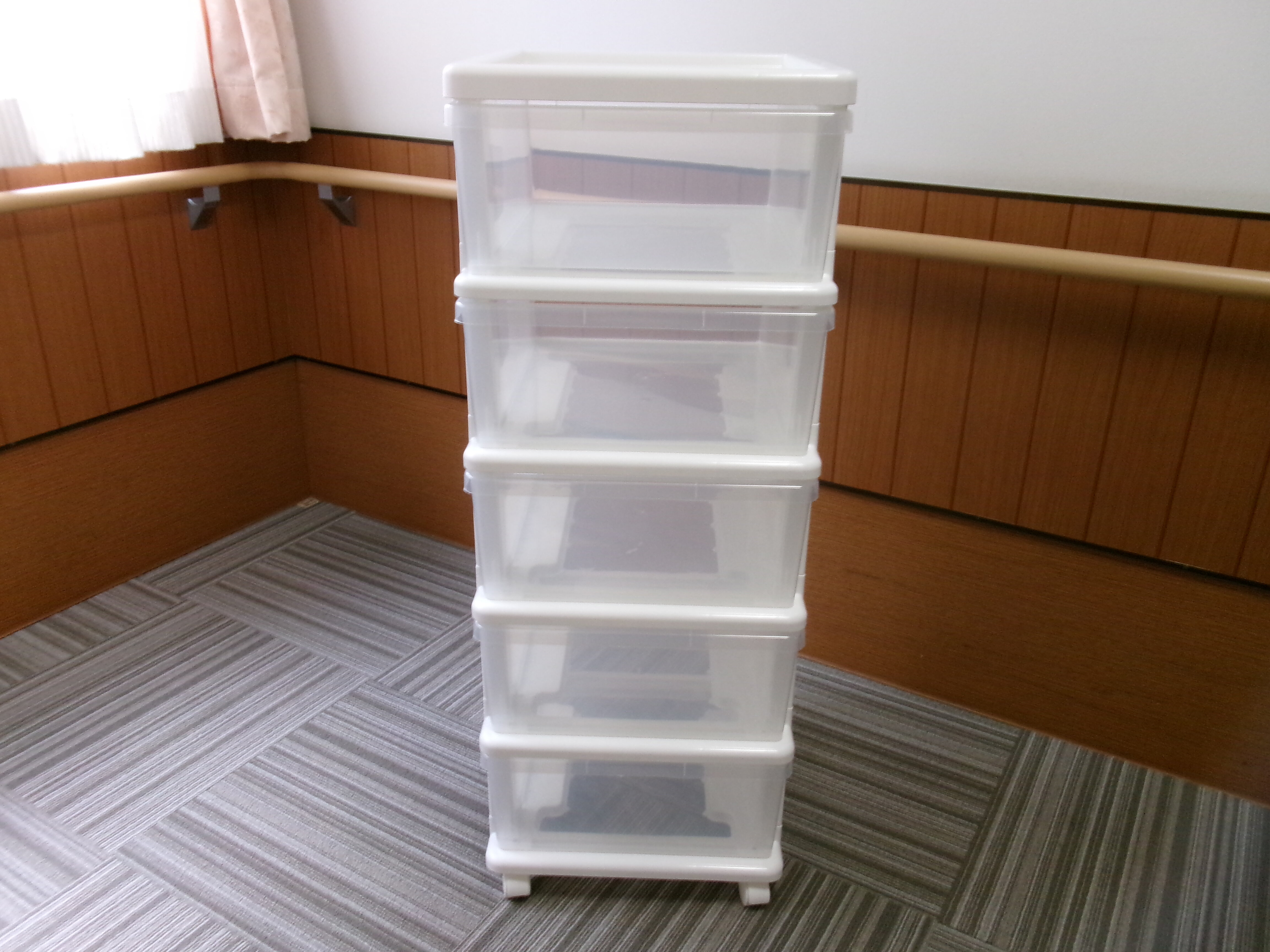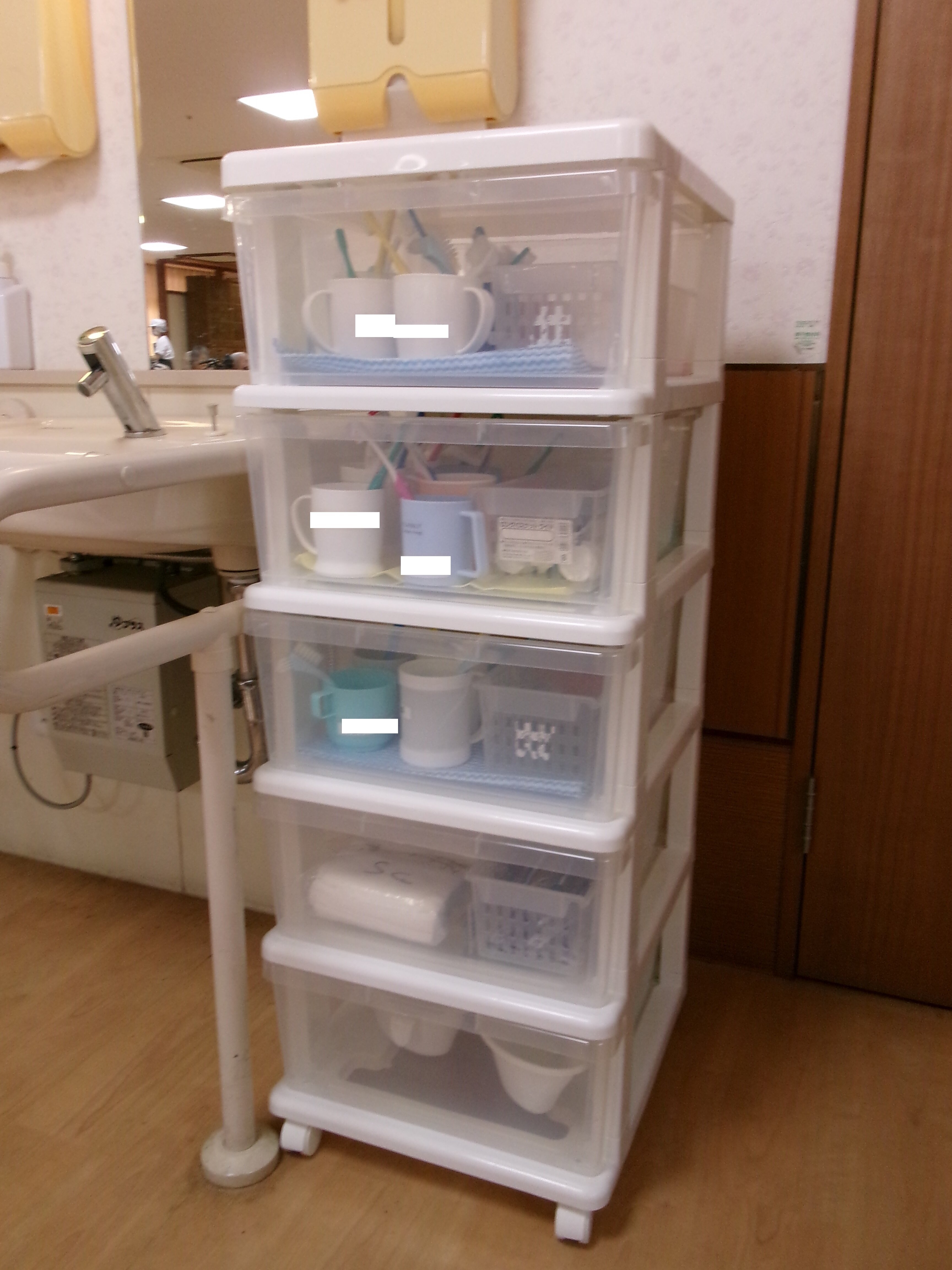 クリアボックスを購入して組み立て、食堂に置いているご入居者の口腔セットを整理しました!
