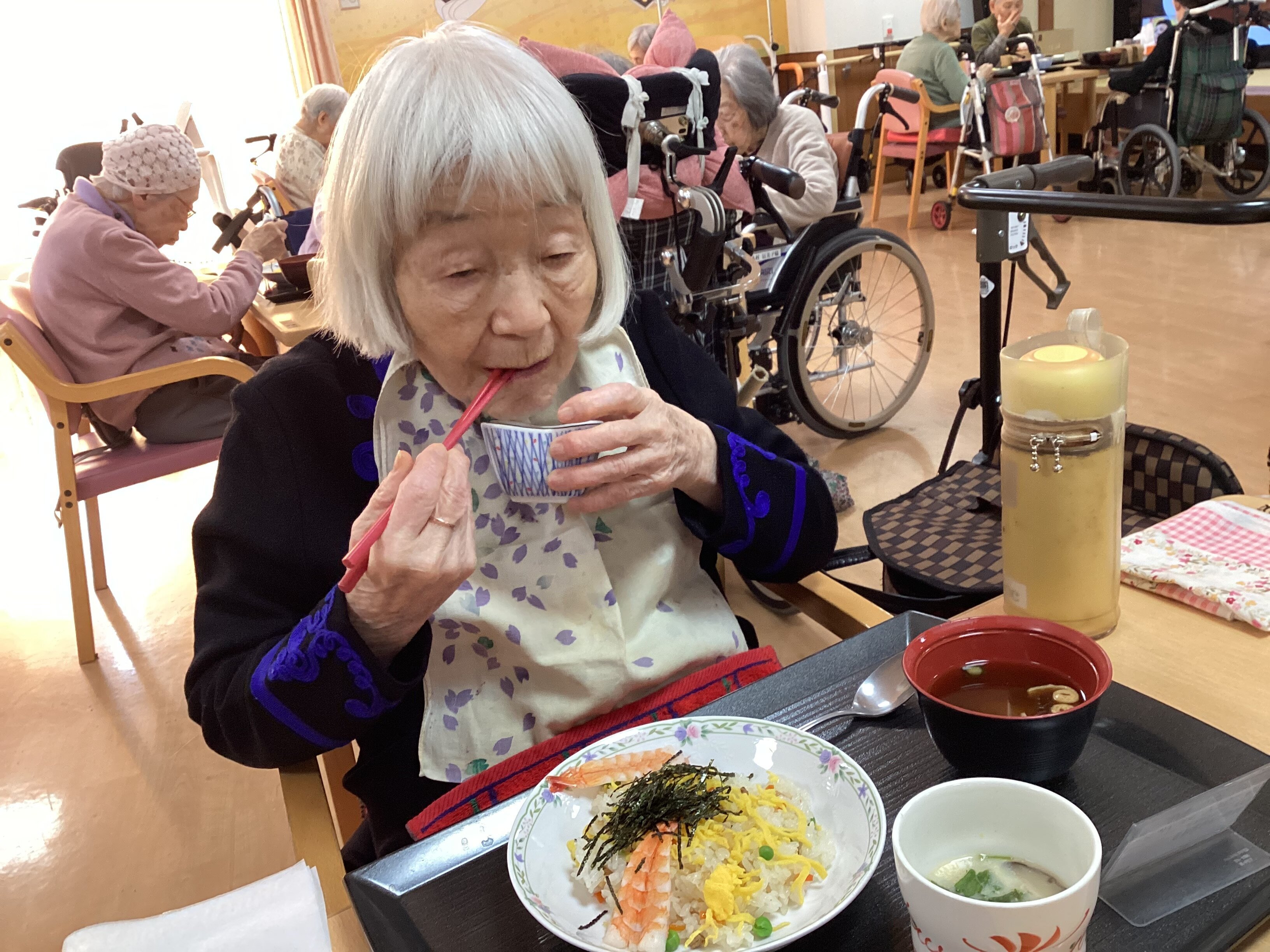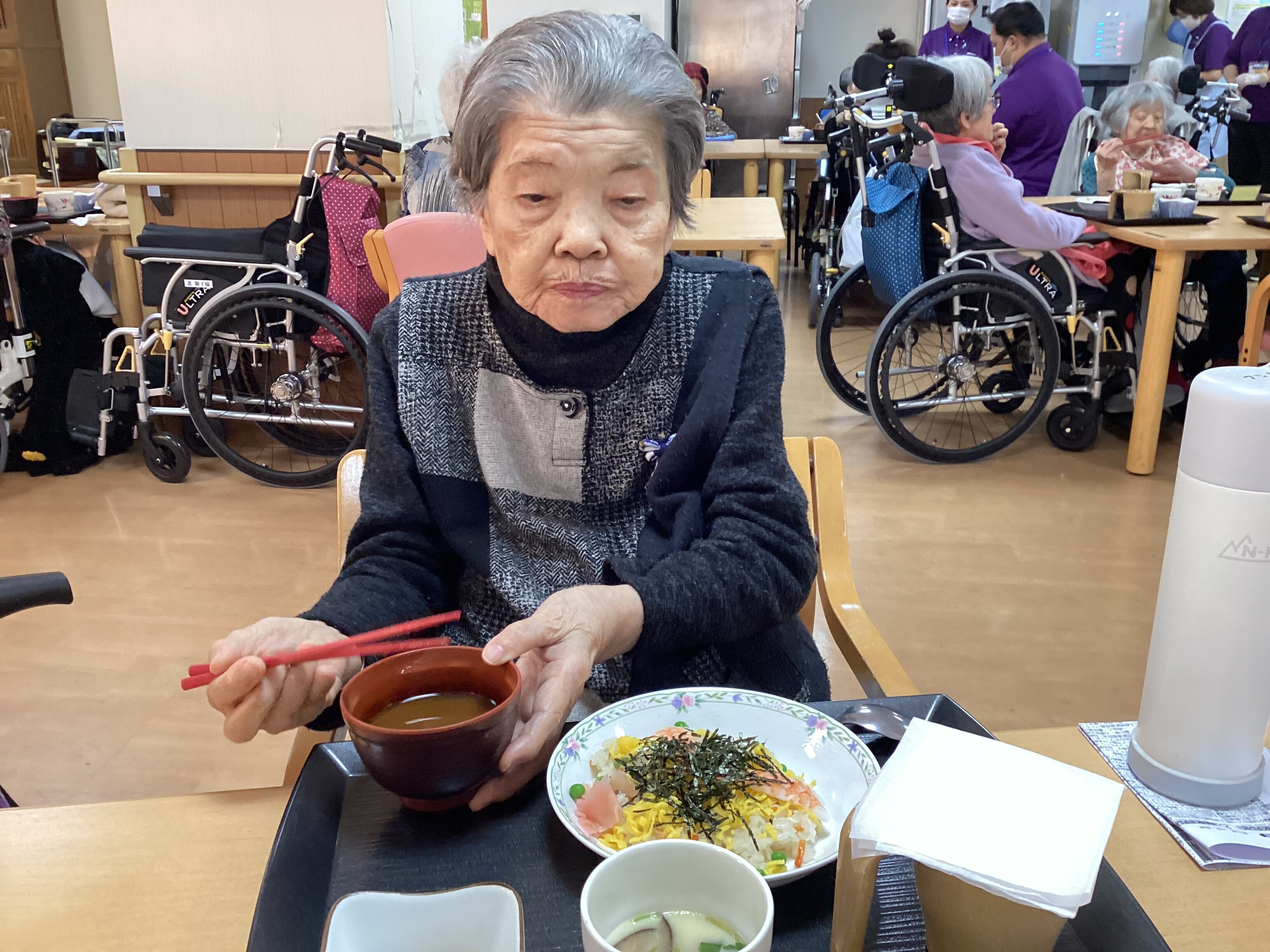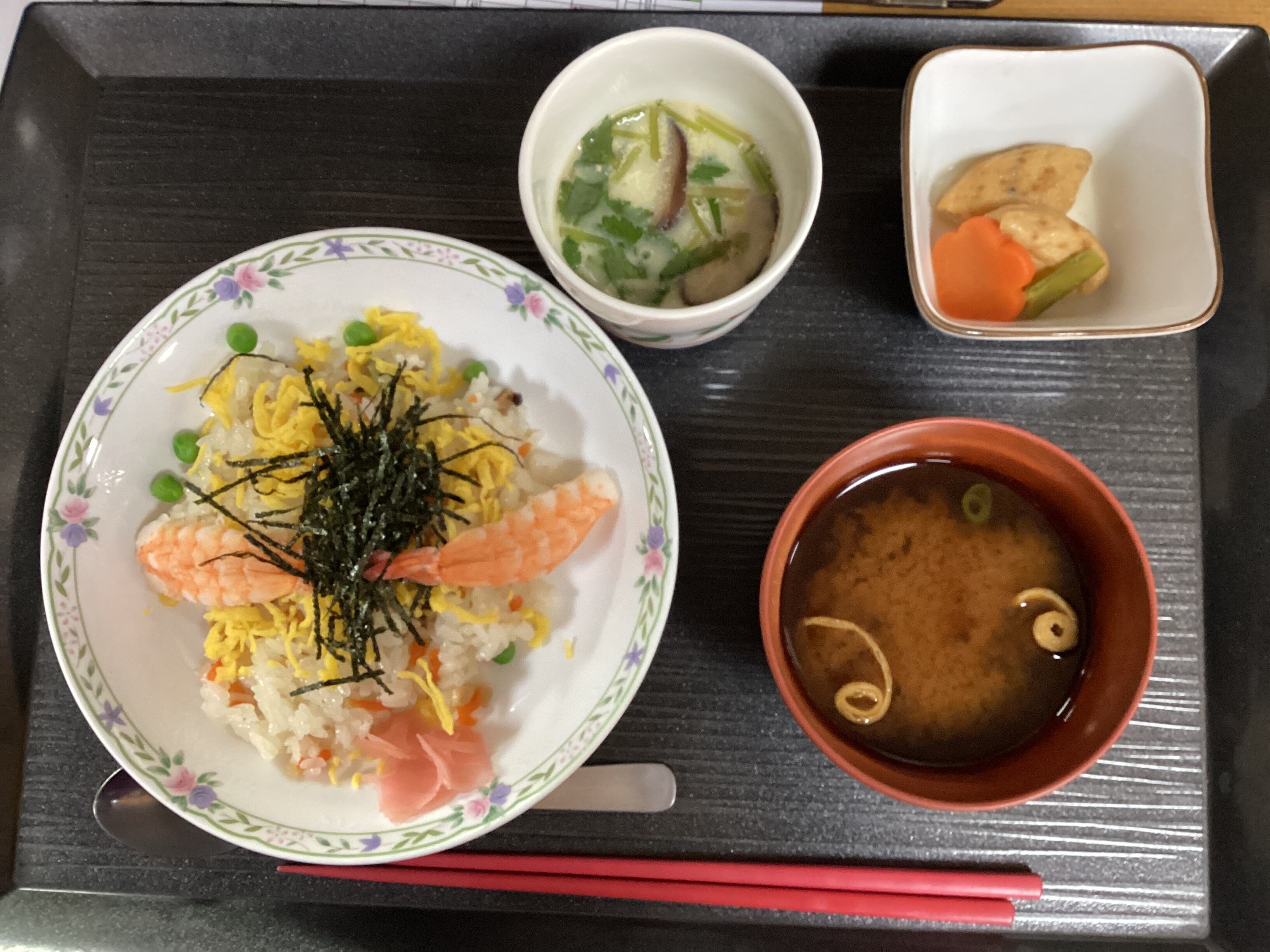 昼食はえびちらし寿司・茶碗蒸し・がんもの煮物・赤だし