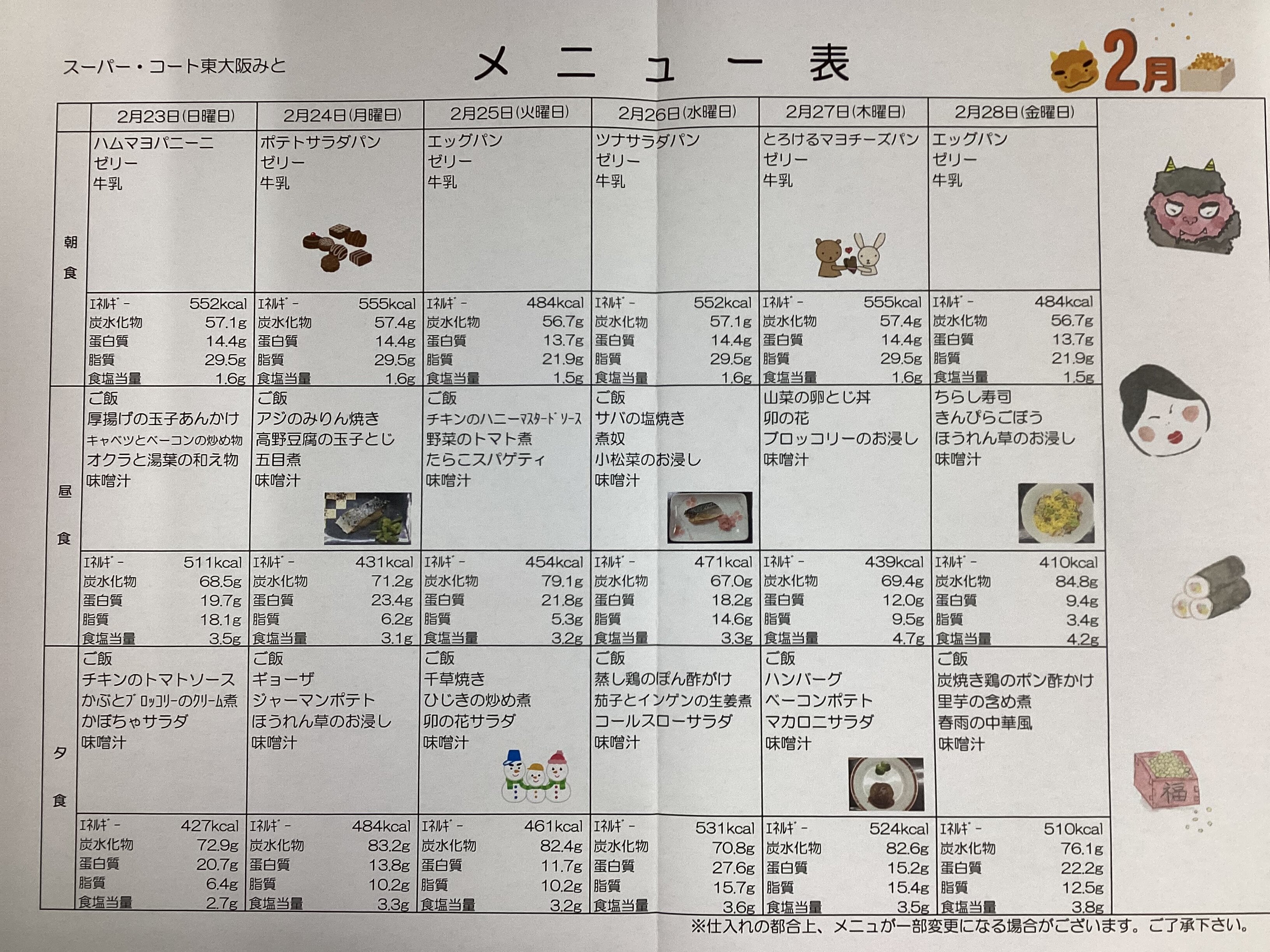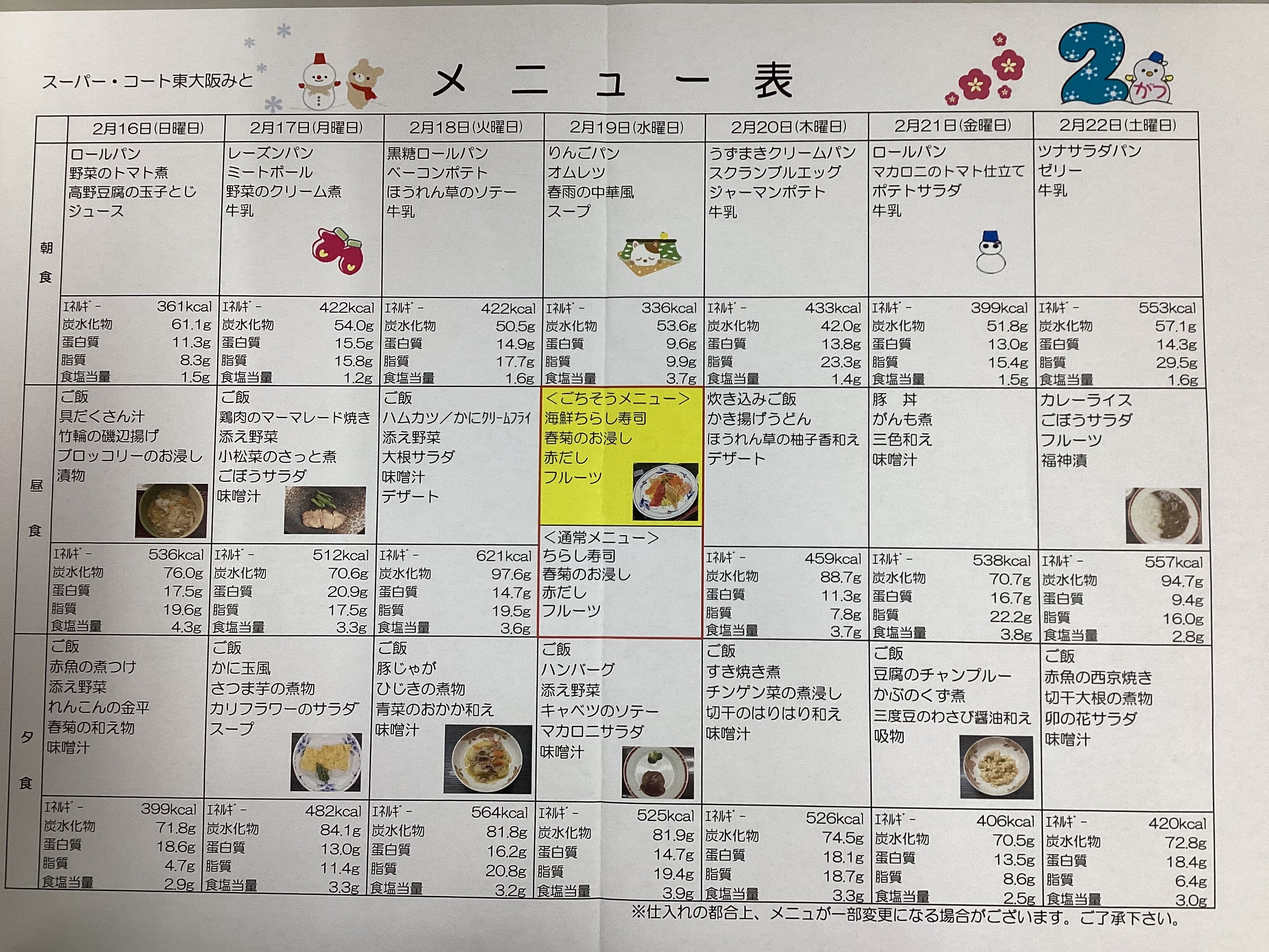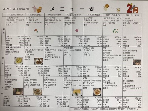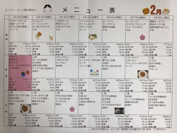遅くなりましたが2月後半のメニュー表をご紹介いたします♪