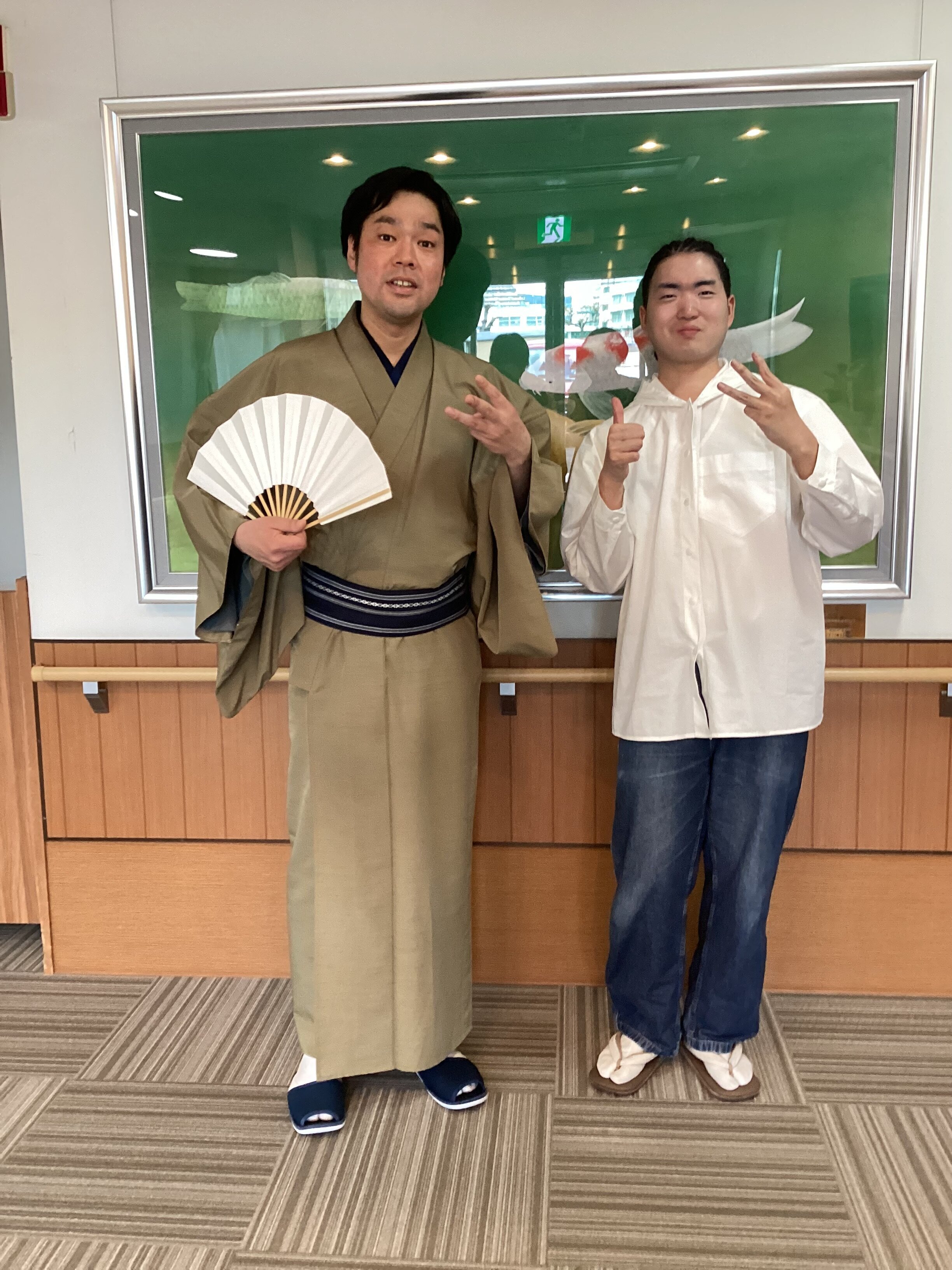 食堂の畳コーナーに高座を設え、お囃子が流れる中登場~