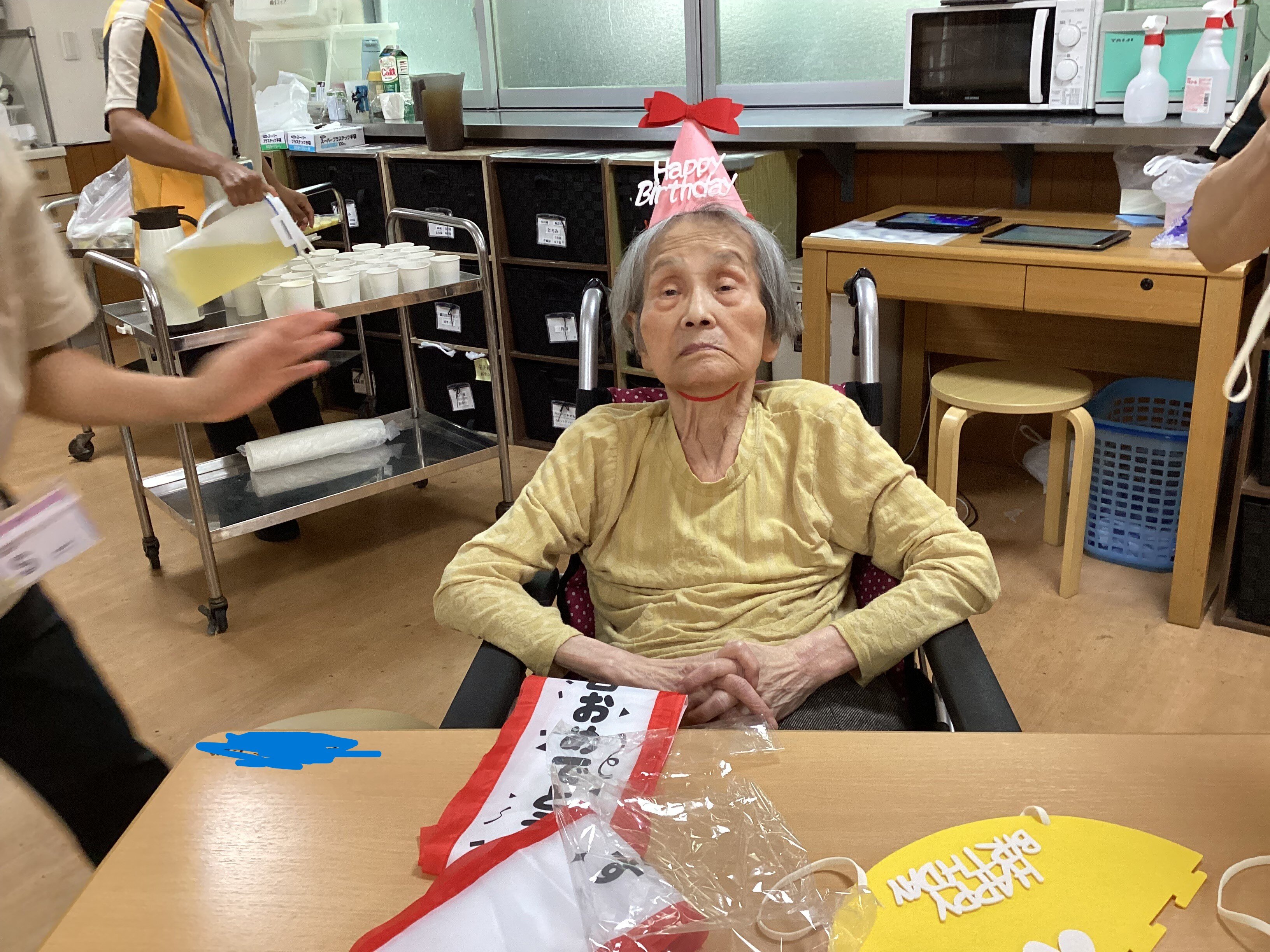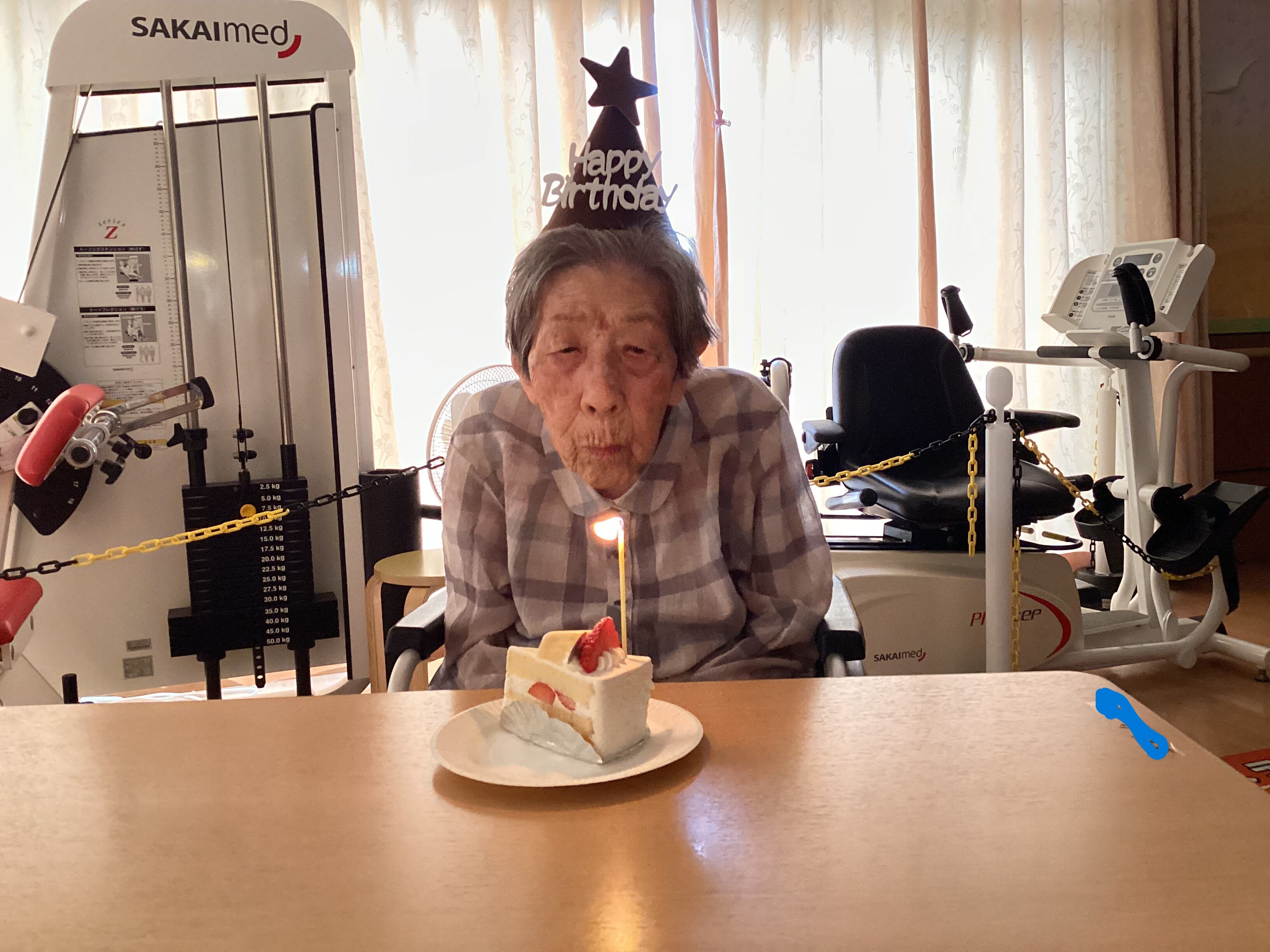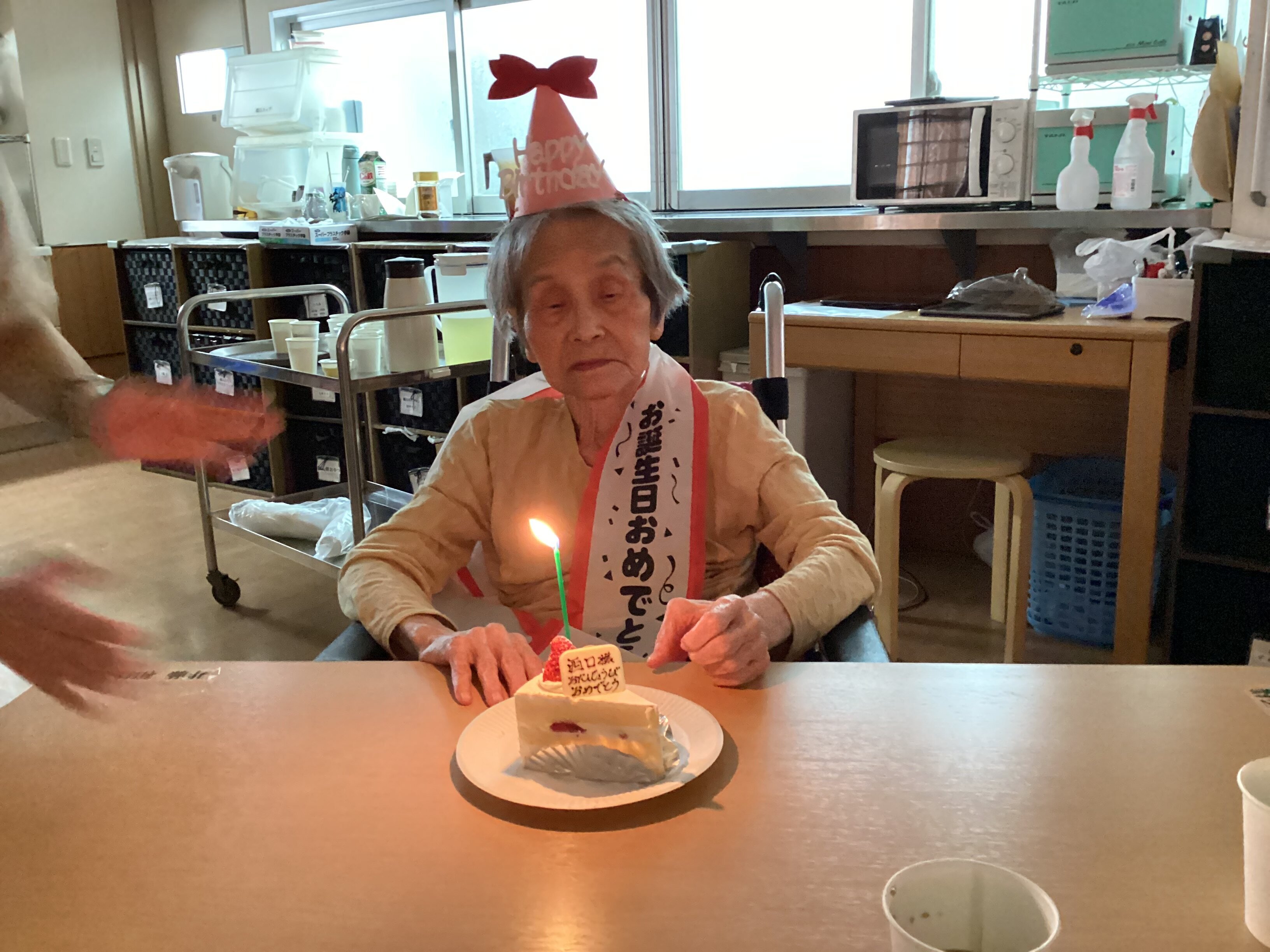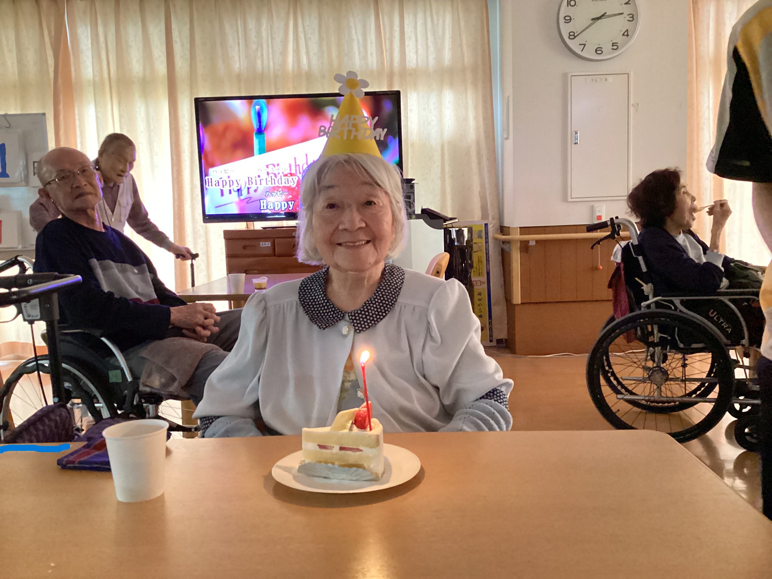 ロウソクの炎を一回で吹き消す方や、中々消えない方もいらっしゃいましたが、他の入居者の方から盛大な拍手が起こりました。「ありがとうございます」「皆様のお陰です」等のお言葉を頂きスタッフもジーンと胸が熱くなりました。