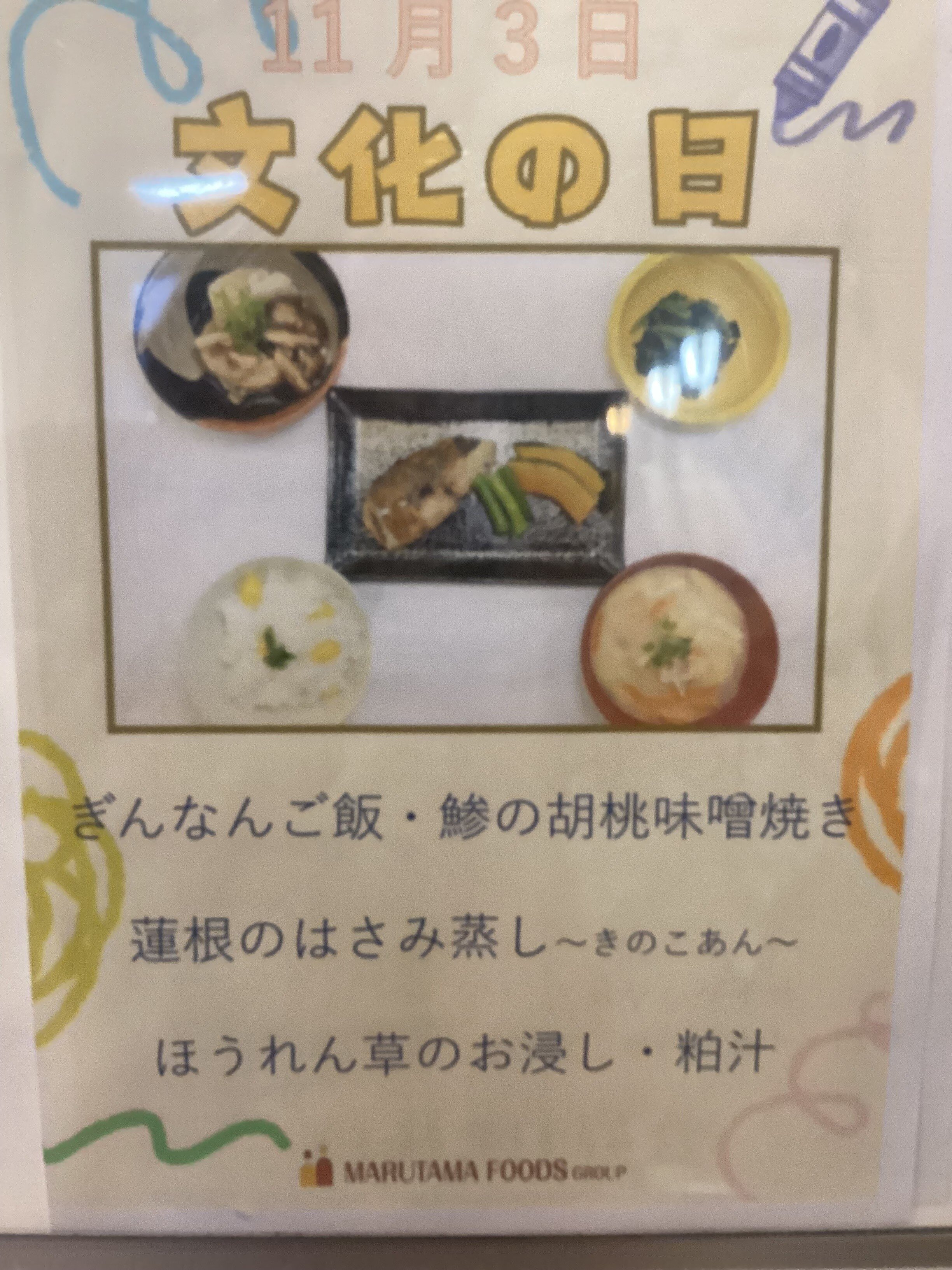 施設では文化の日メニューの提供がありました。秋の味覚満載の内容です。