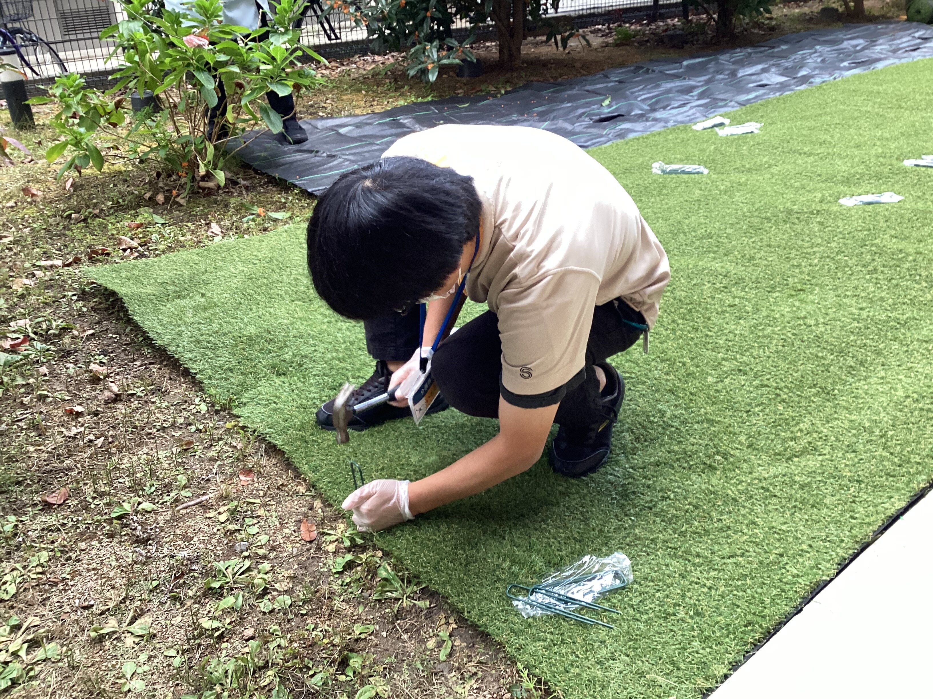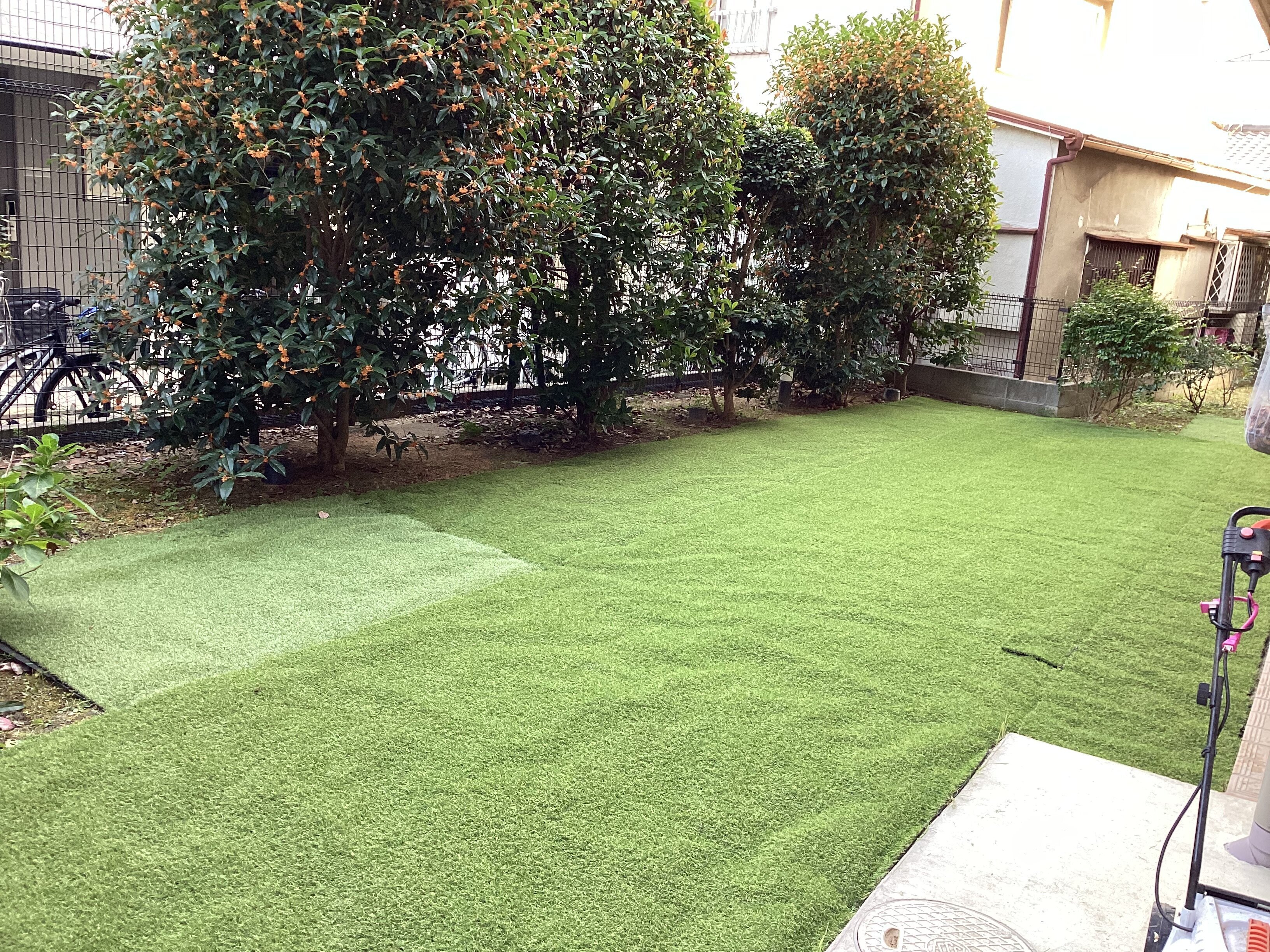 この度、中庭に人工芝を敷く事になり、まずは雑草引き、除草剤散布、人工芝敷きを行いました。
