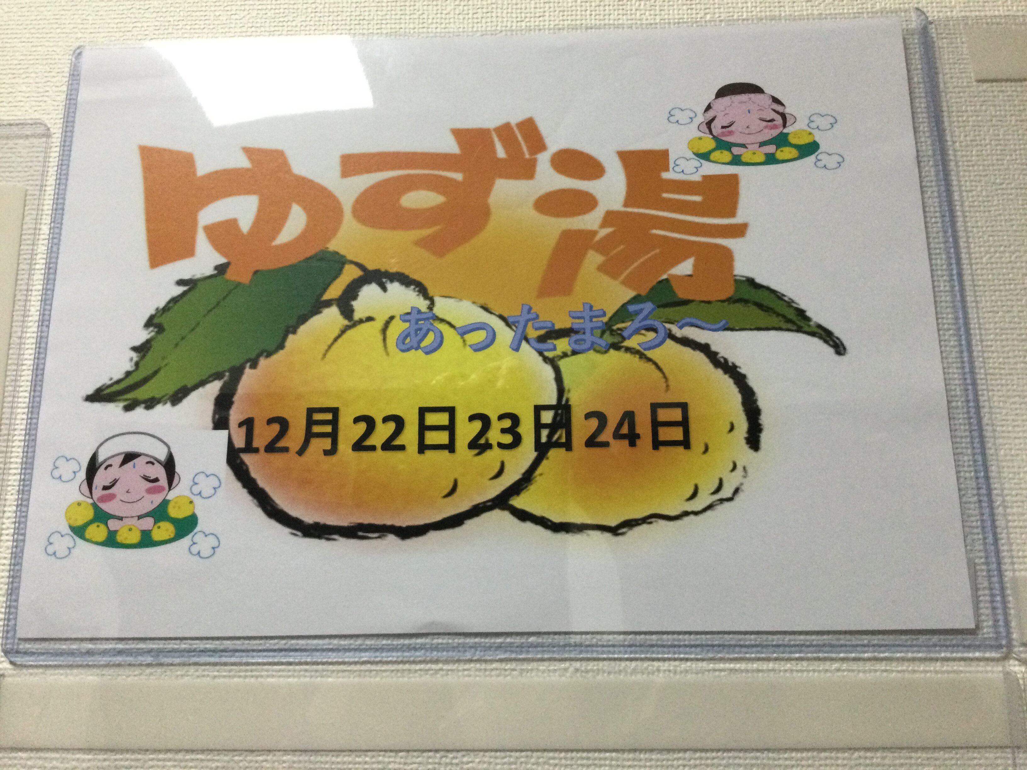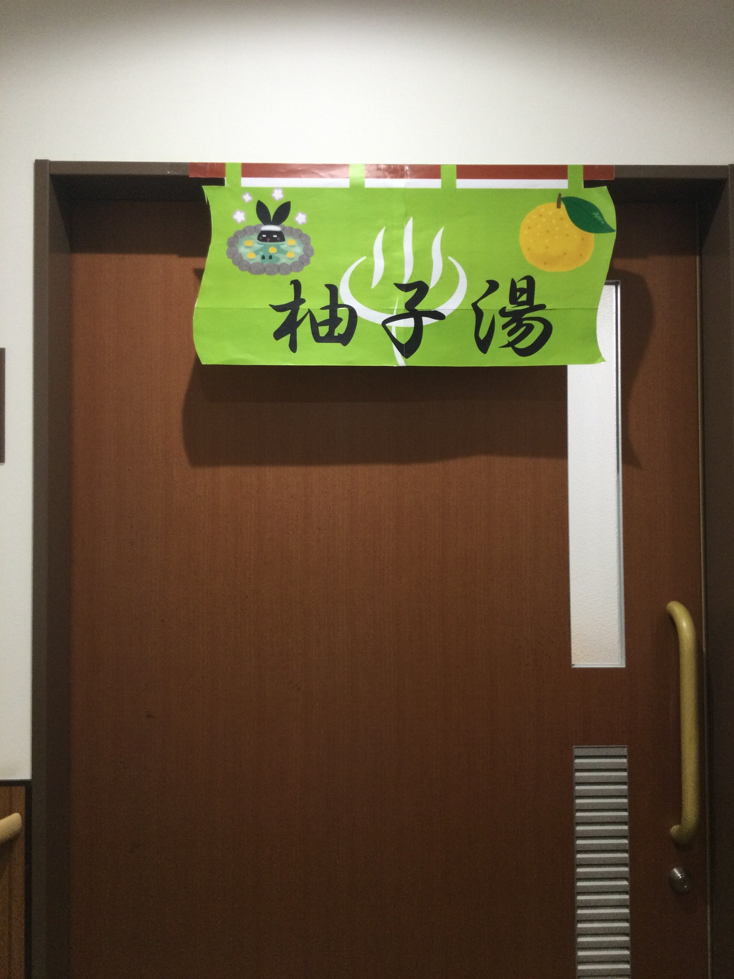 ゆず湯はシンプルにゆずを湯船に浮かせるのみでとっても良い香りに包まれ、香りだけでリラックスできそうです。ゆずは施設近くの八百屋さんに30個配達して頂きました。「いい匂いやね」「温まったわ」と喜んで頂けたようで良かったです。