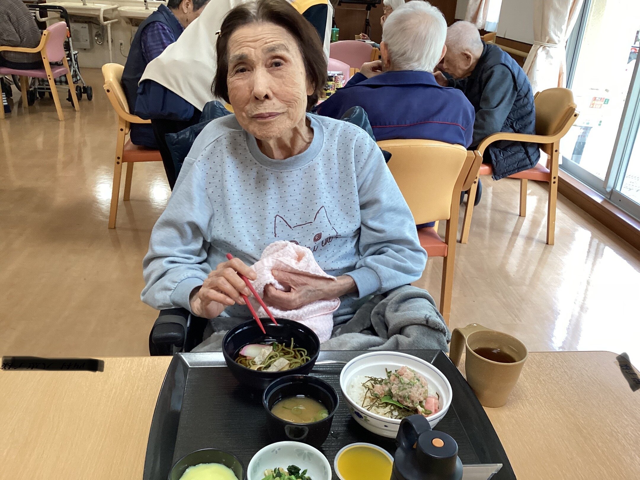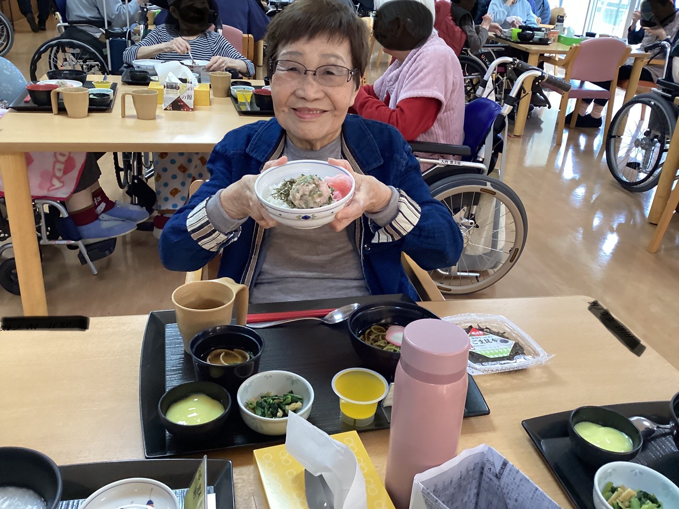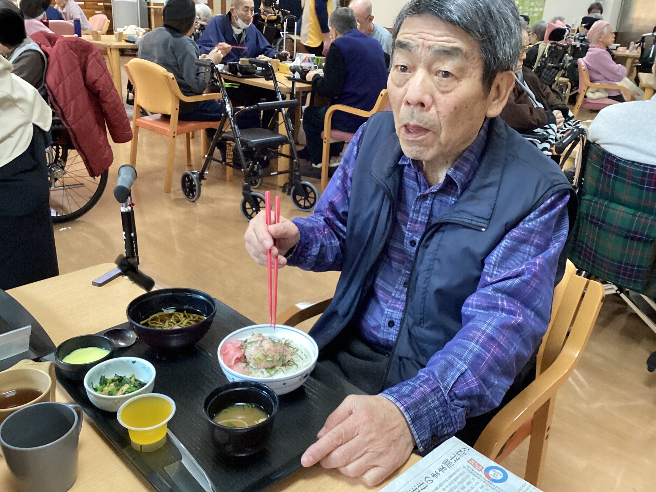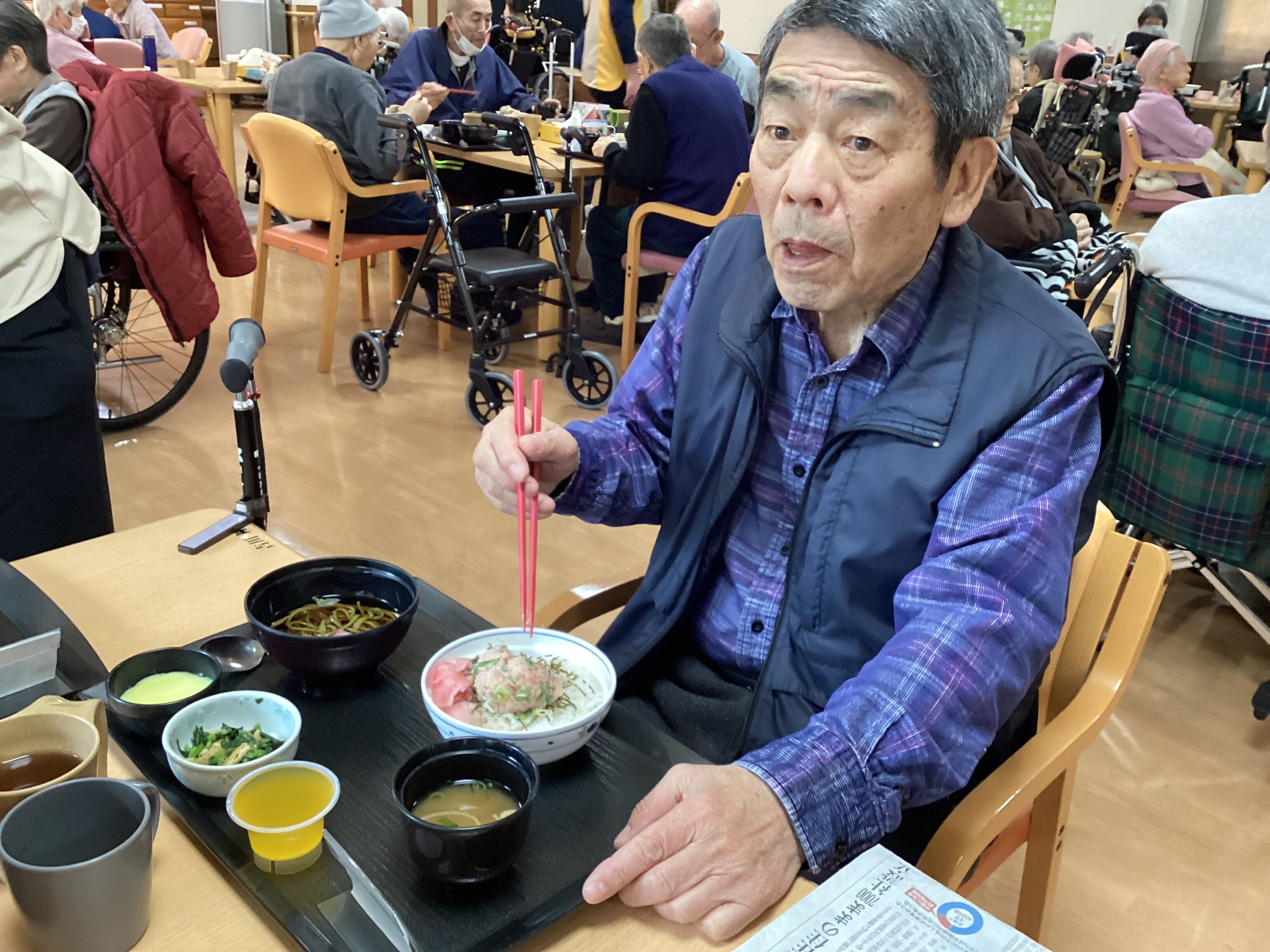 こんにちわ\(^o^)/本日の昼食はご馳走メニュー【ネギとろ丼】でした★茶そばも付いて満腹で食べきれないとのお声が多く聞かれました★完食されている方もたくさんいらっしゃいました(^^)次回もおたのしみに☆彡