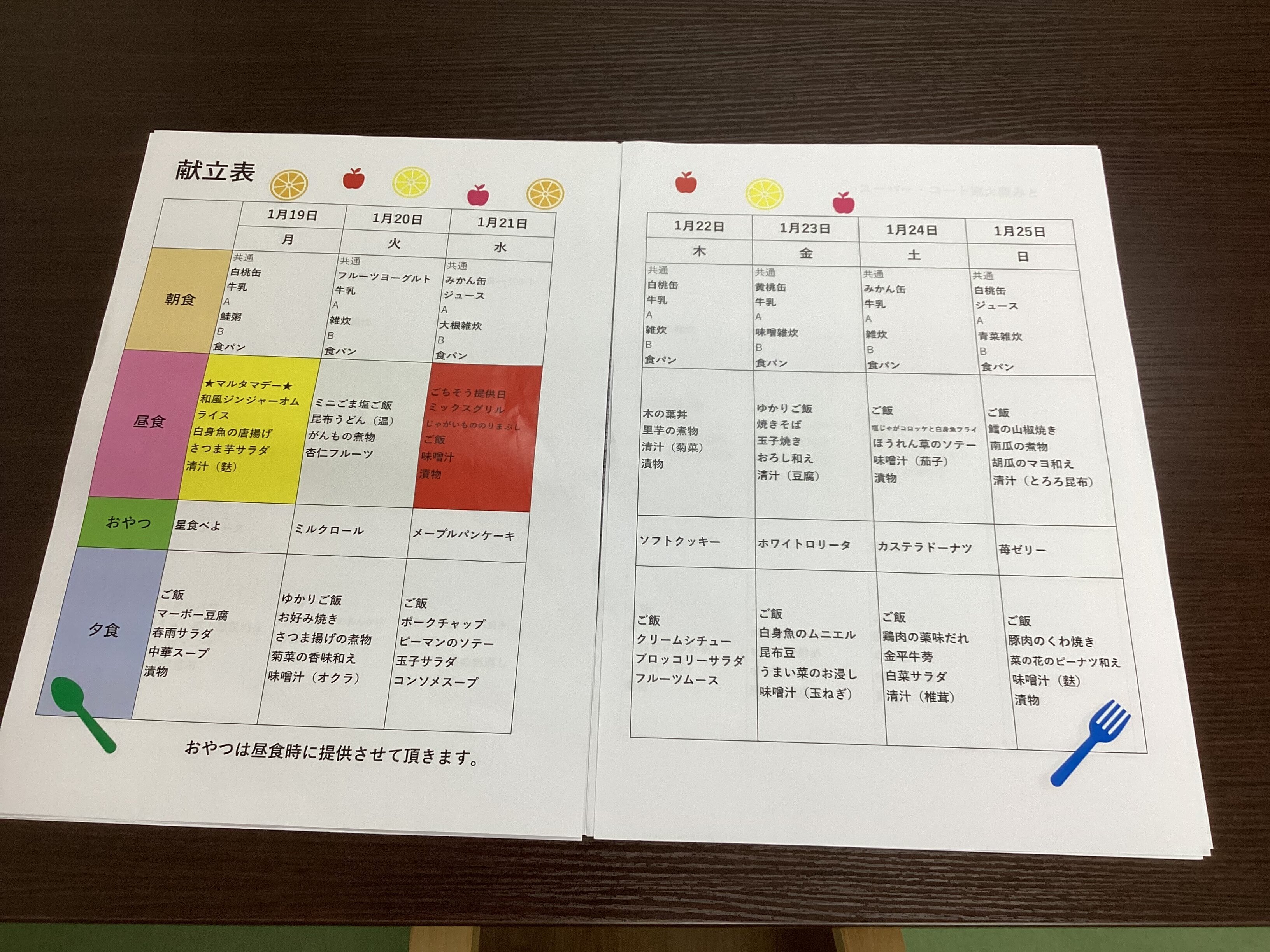 こんにちは(^_^)1月後半献立表のご紹介です☆彡1/15(木)小正月★ 【あずきご飯】1/19 ★マルタマデー★【和風ジンジャーオムライス】1/21(水)ご馳走提供日 【ミックスグリル】