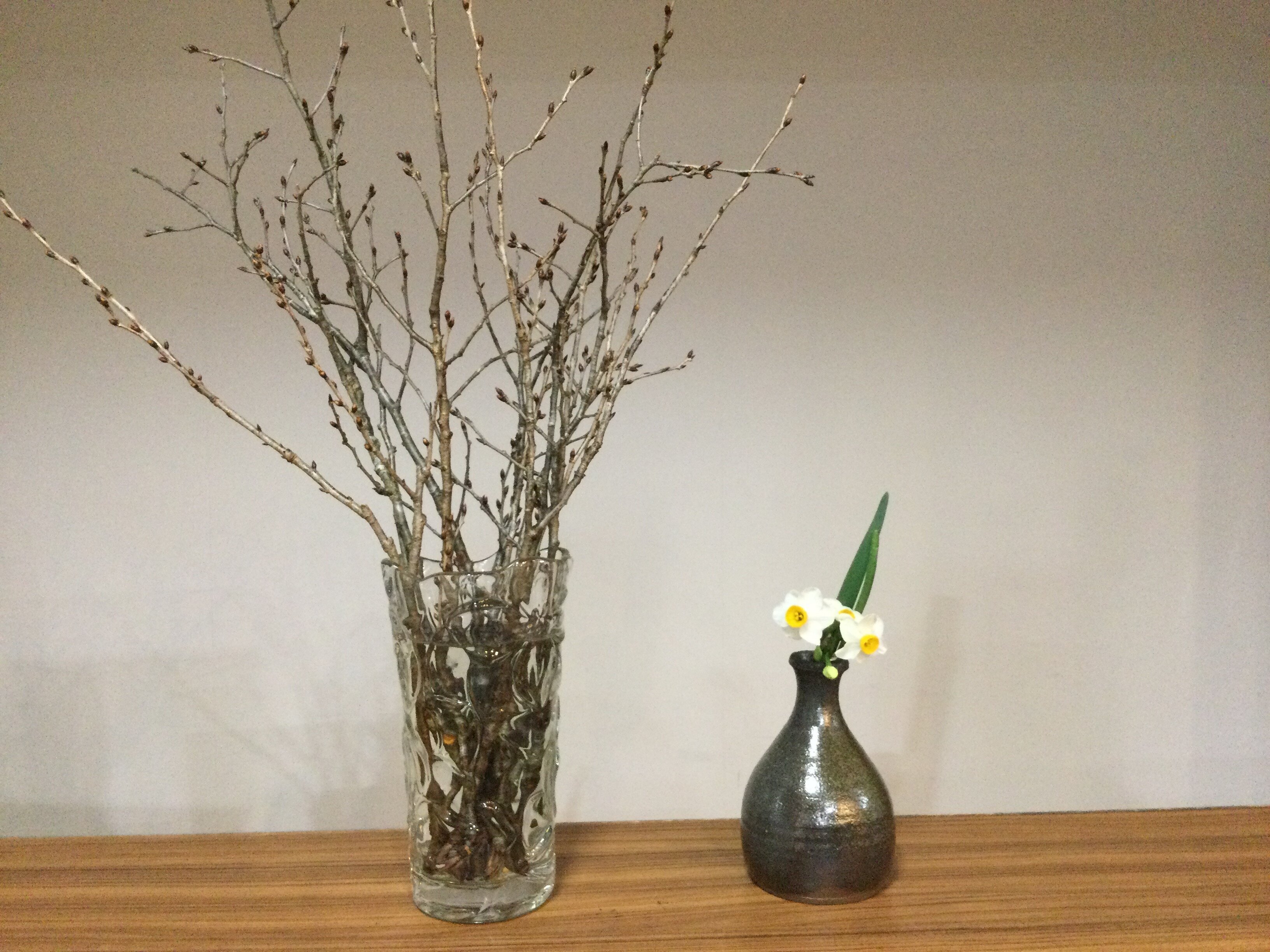 写真左はスタッフが持ってきてくれた山桜です。枝には沢山の蕾が付いていて何色の花が咲くのか楽しみです。