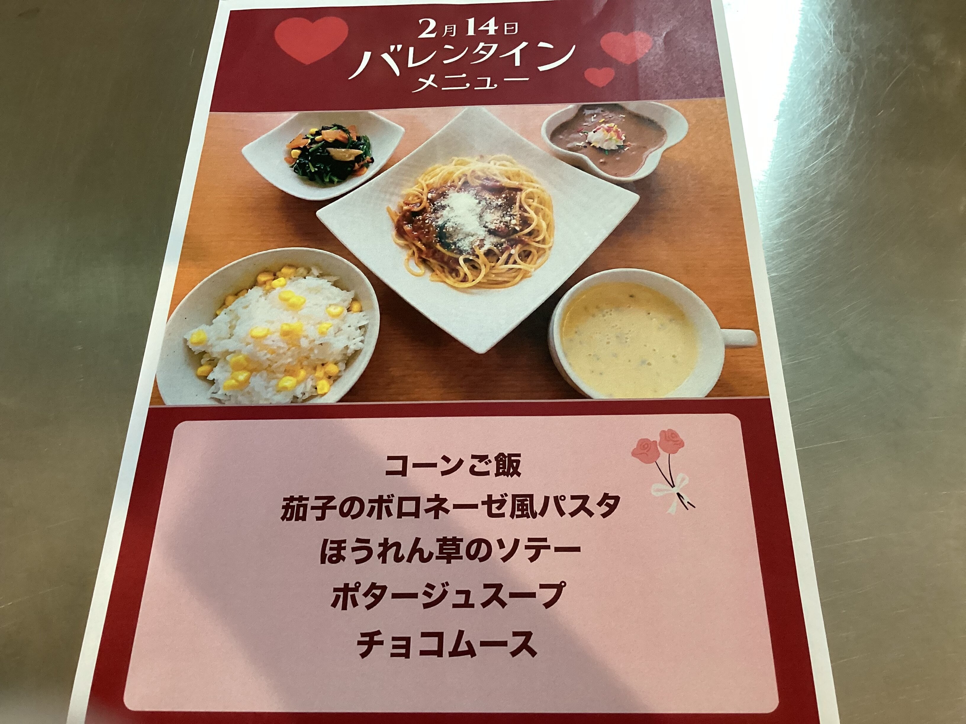 こんにちは(^_^)2/14の昼食はバレンタインメニューでした☆彡チョコの代わりにチョコムースがついていました☆彡次回もお楽しみに(^^)