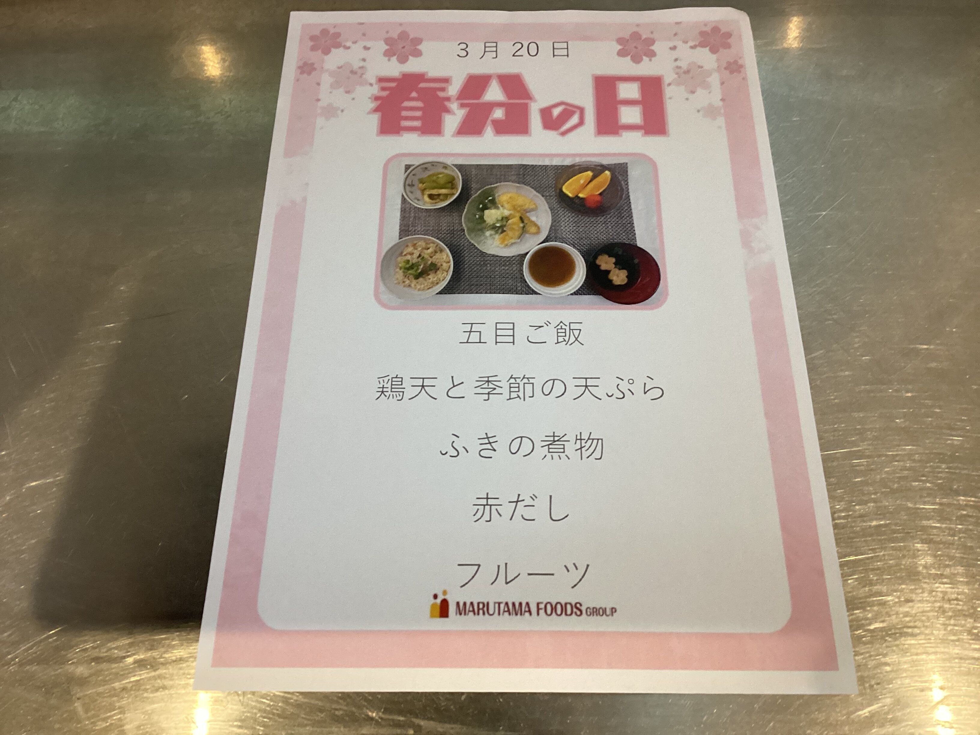 こんにちは(^^)/本日の昼食は【春分の日メニュー】でした(^-^)今日は【春分の日】とお伝えすると、「季節感がある献立で嬉しい、とても美味しい」とのお声沢山いただきました☆彡ブログを見ていただきありがとうございます次回もお楽しみに(^^)/