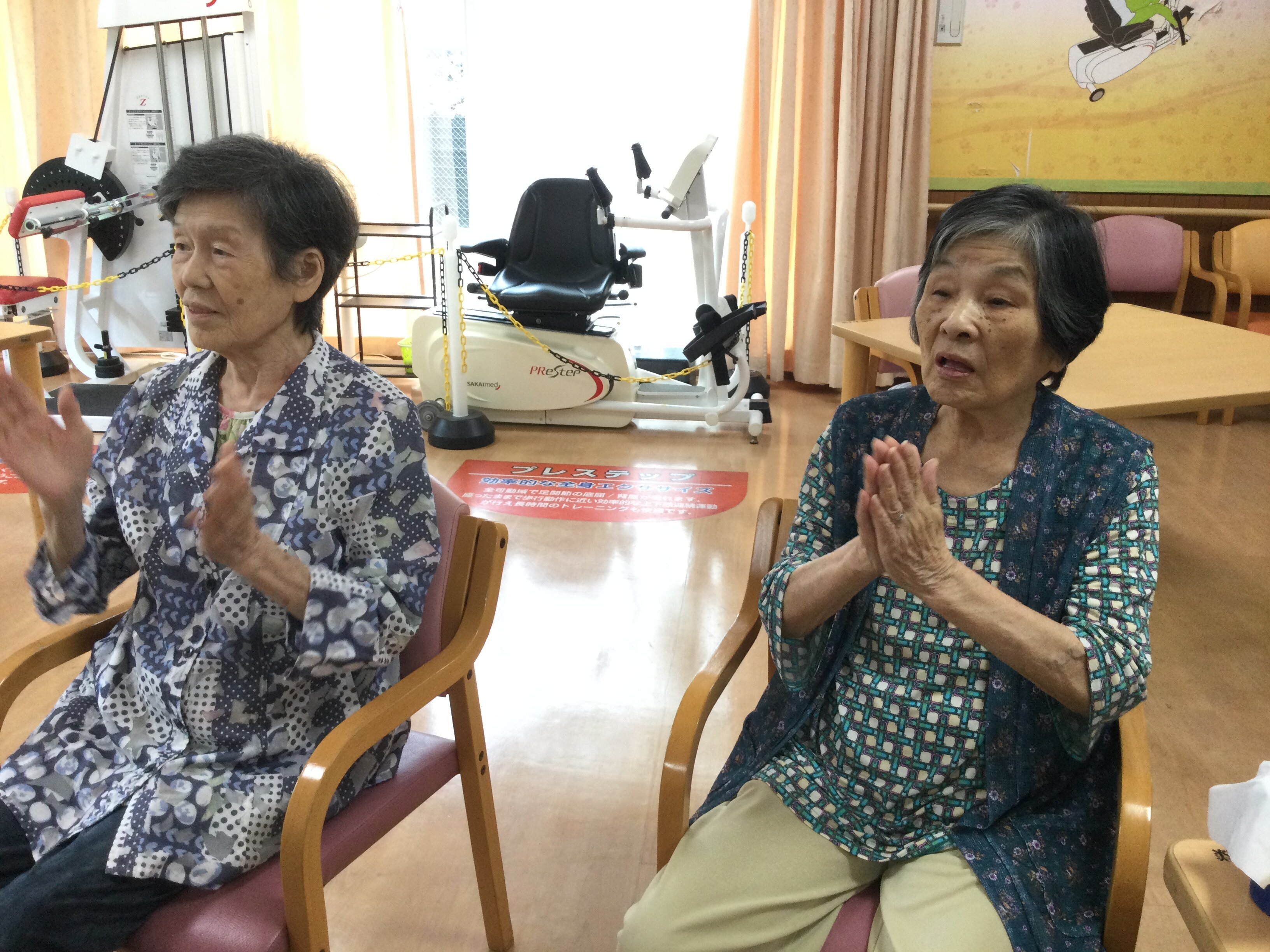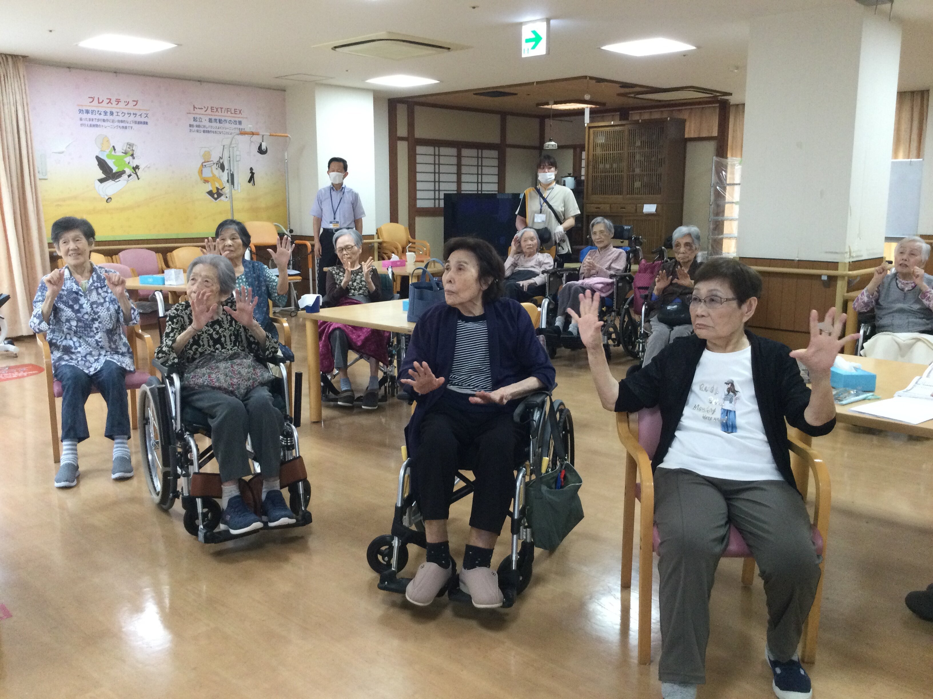 喉や上半身の運動から始まりました。ワンちゃんとの散歩映像に合わせ歌いながら600歩散歩したり、懐かしのイントロドンクイズでは「何の歌やった?誰やった?」歌謡曲を皆で歌ったりと皆さまに楽しんで頂けたようです。