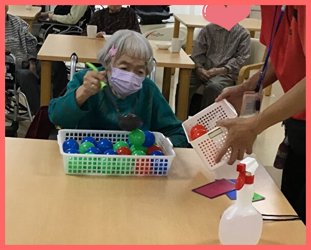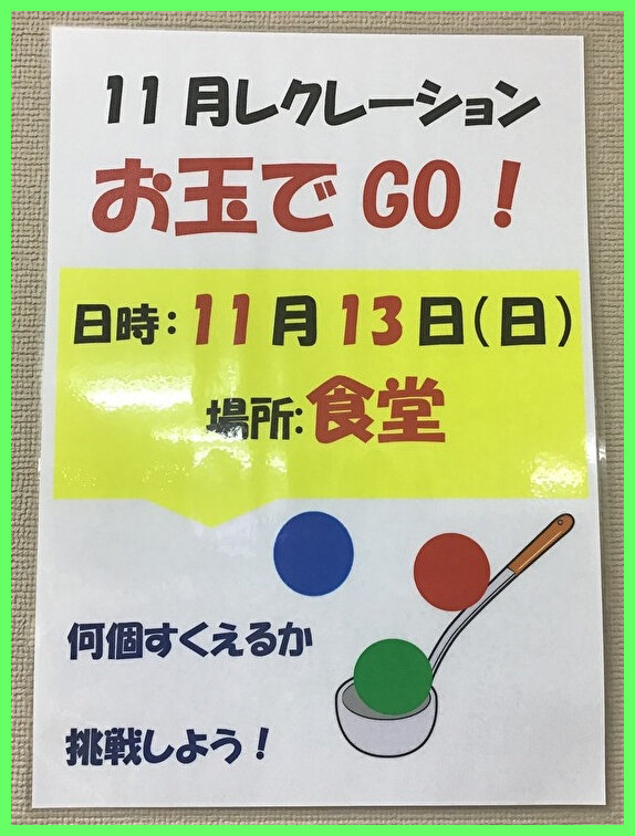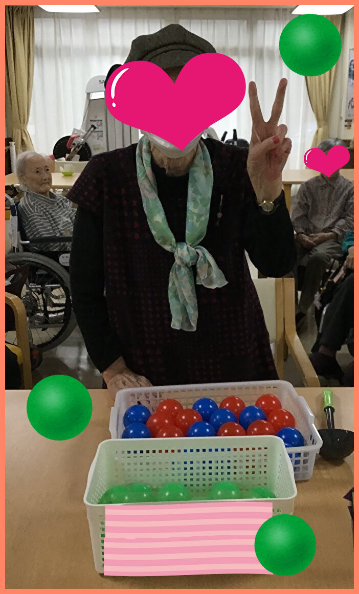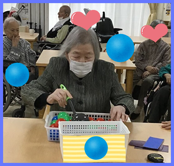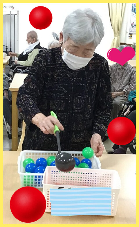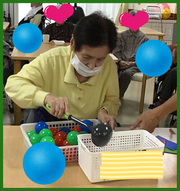 カードに書かれている色と同じ色のボールをお玉ですくい別のかごへ移すというものです