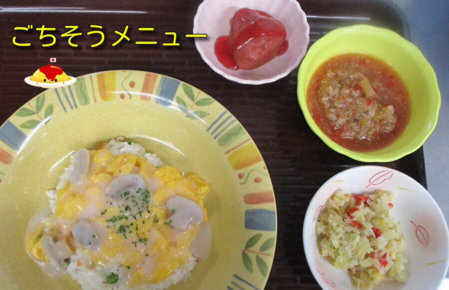 メニューはクリームソースのオムライス、彩野菜のケチャップ煮、コールスローサラダ、イチゴのゼリーでした。