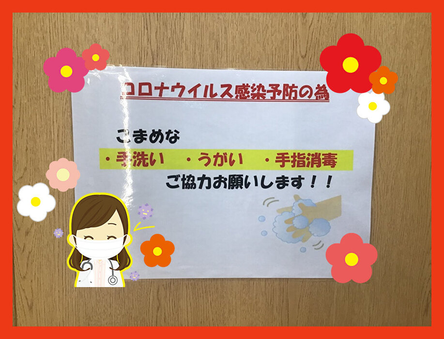 施設では予防策としてみなさんに手洗い・うがい・手指消毒をご協力いただいています。