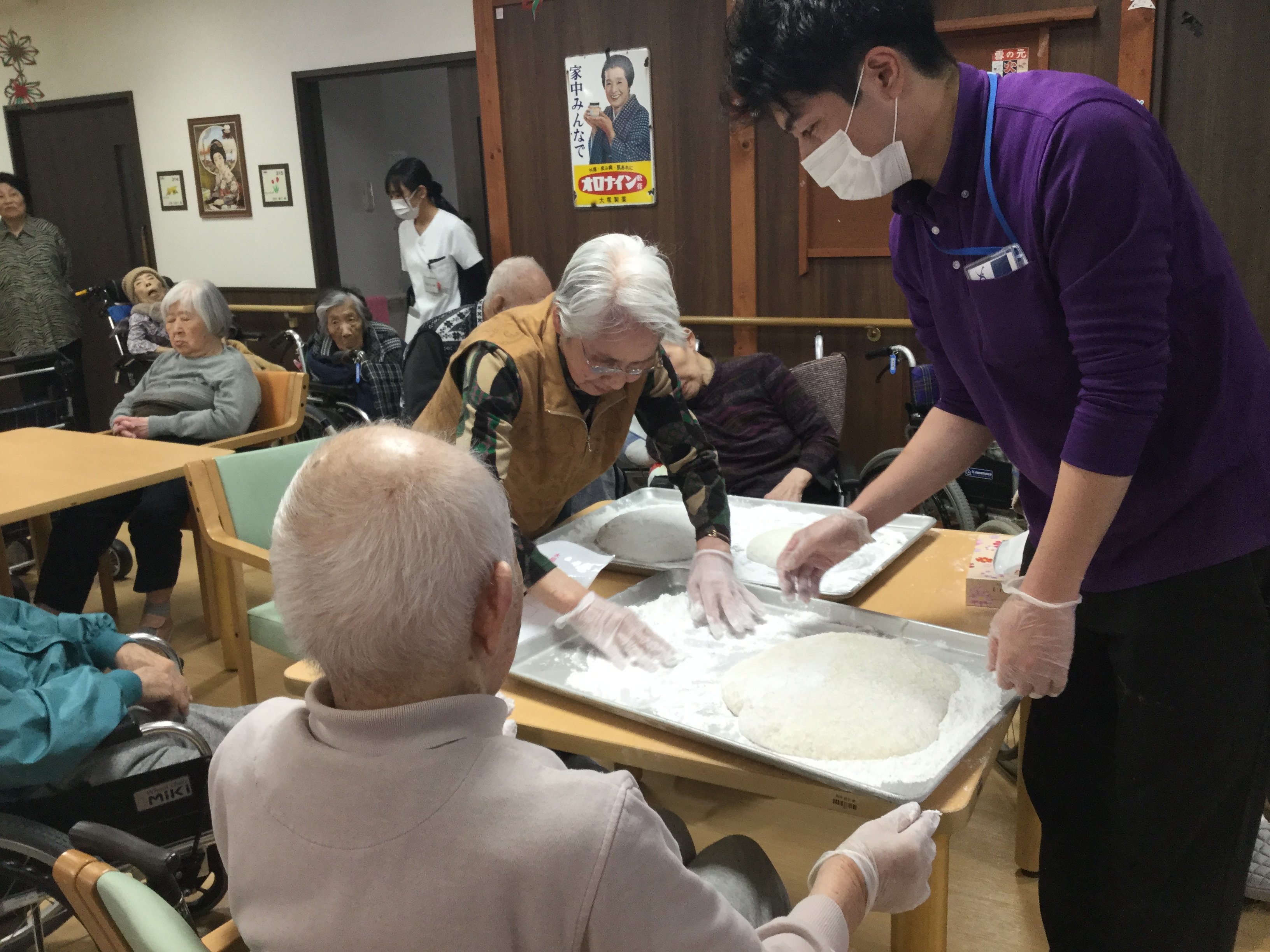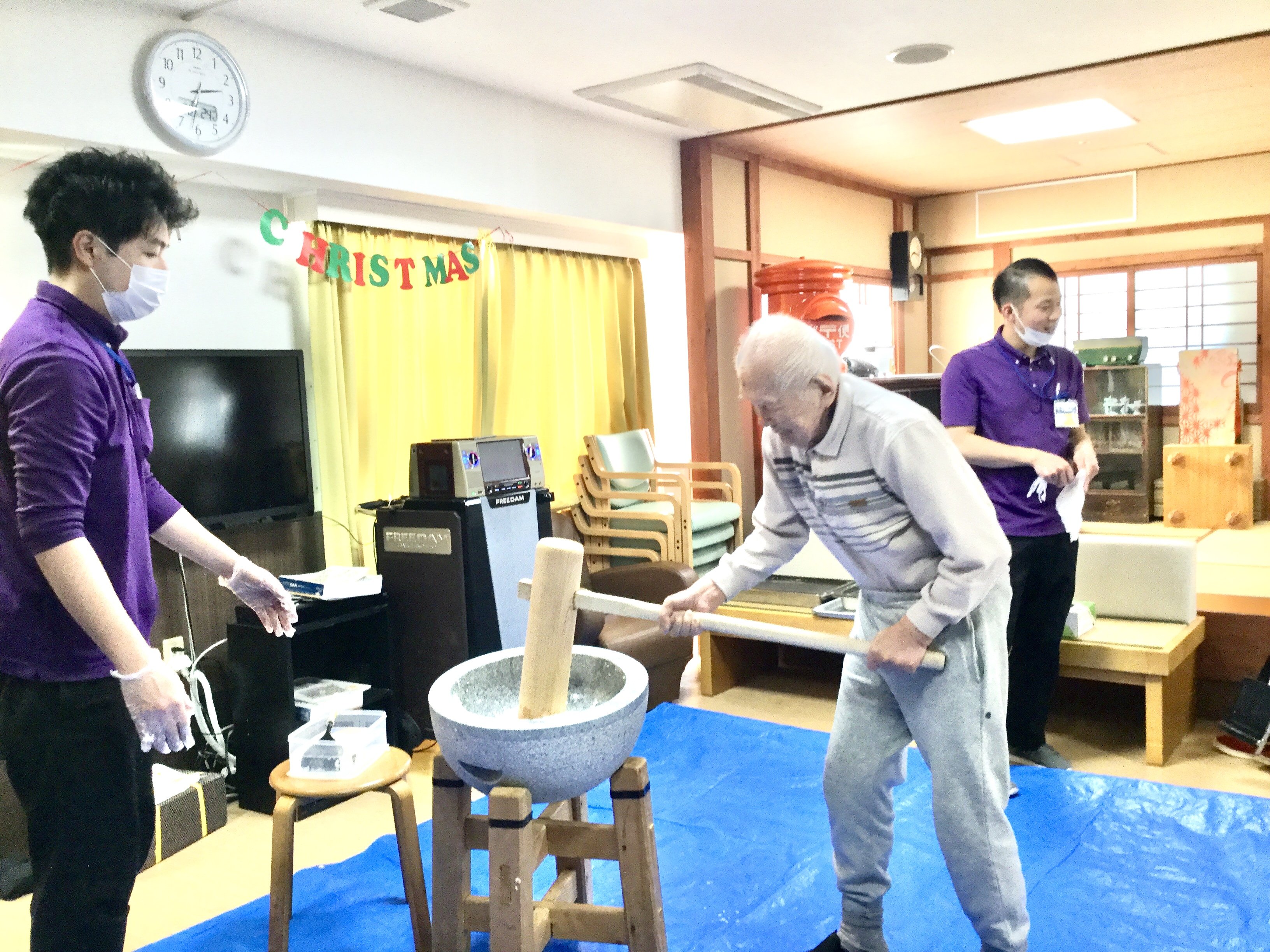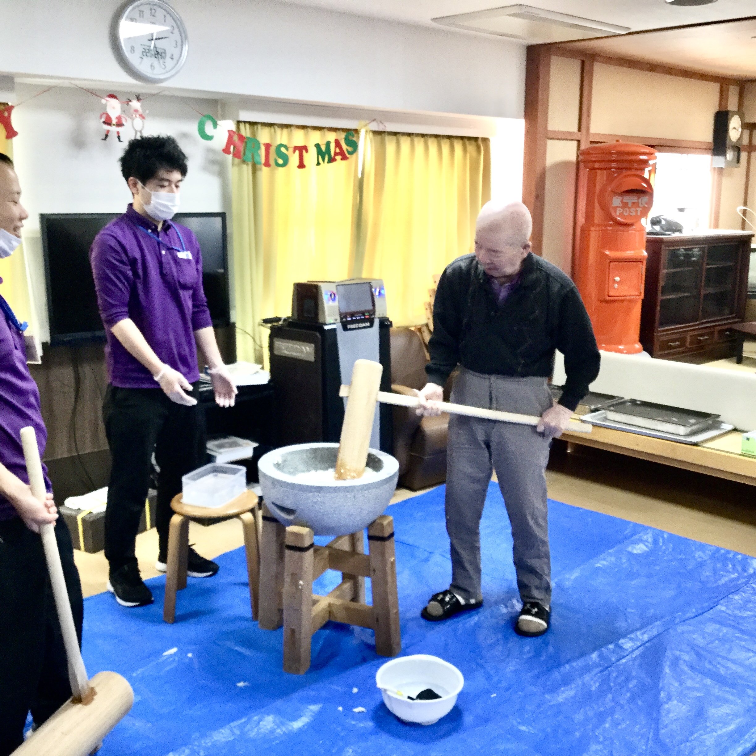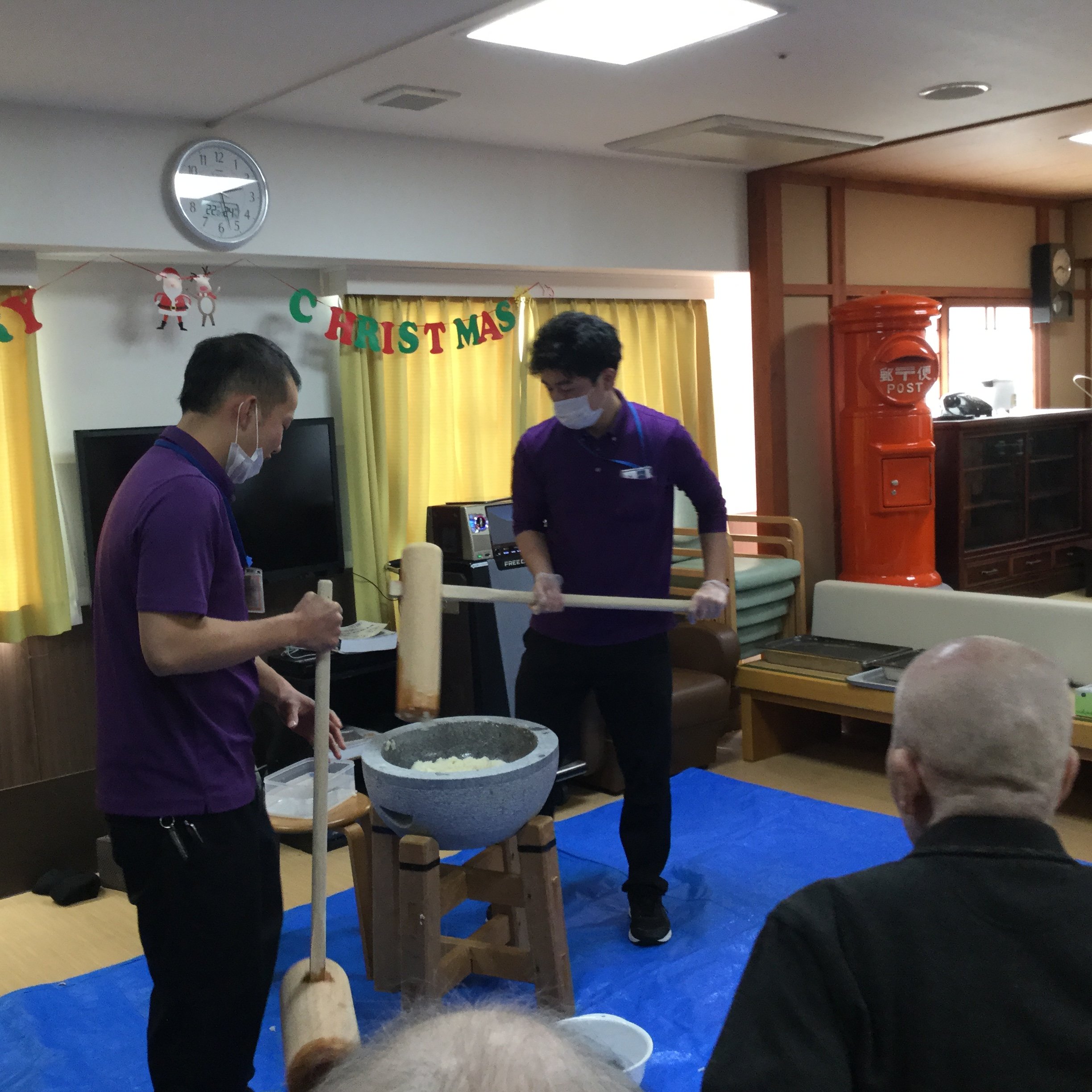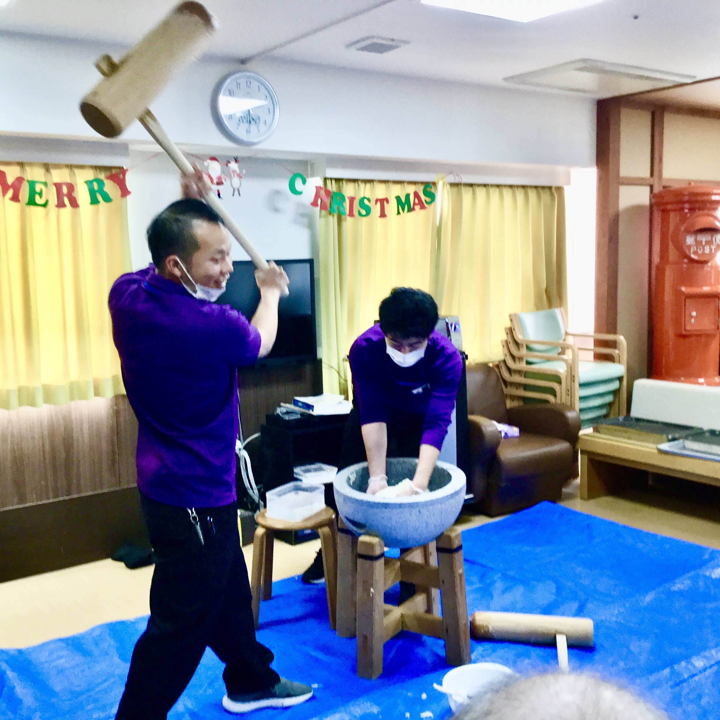今回は、施設内で鏡餅用の餅を作る為に餅つきをしました