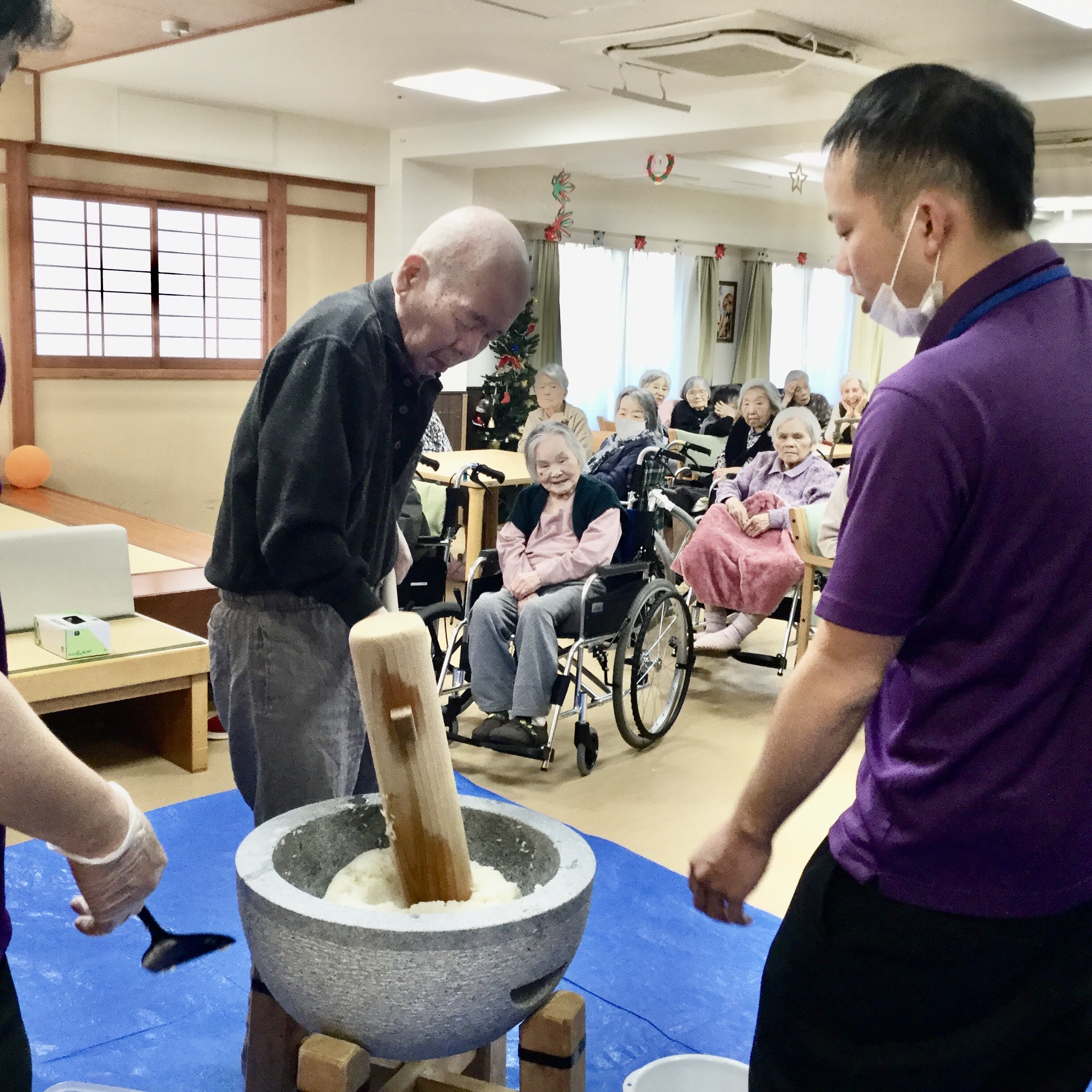 お次は、ご入居者にも、餅つきを体験して頂きました