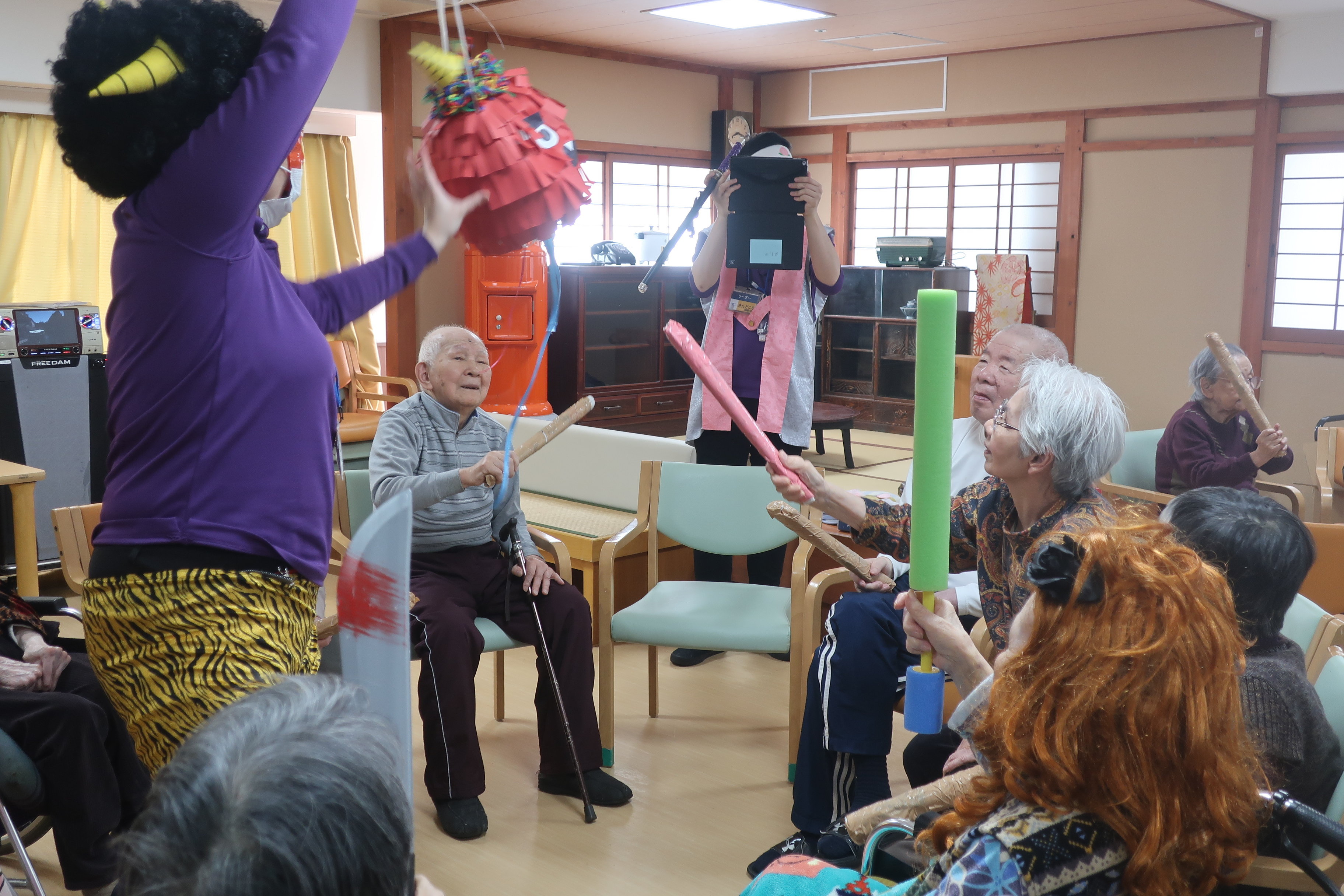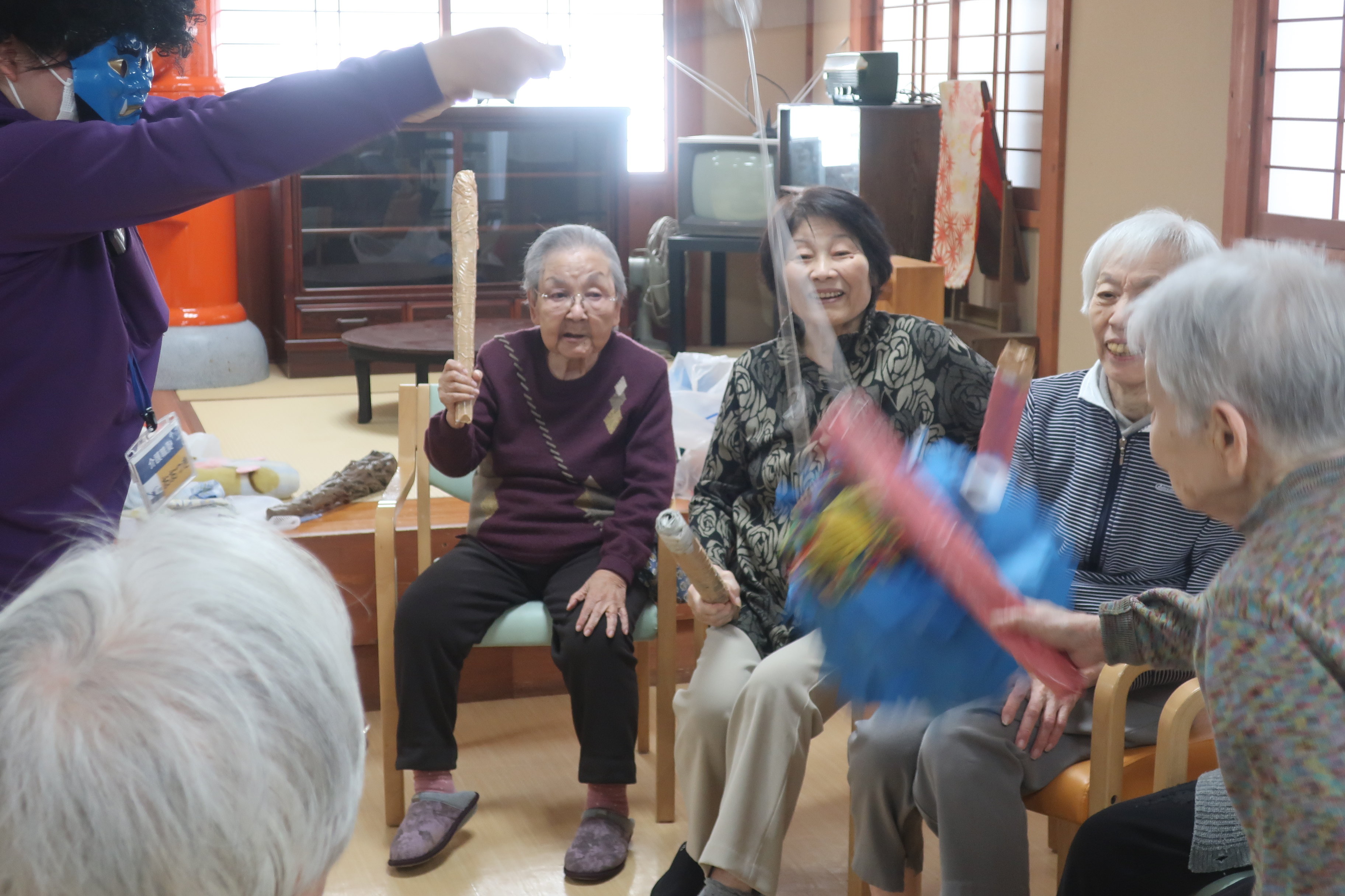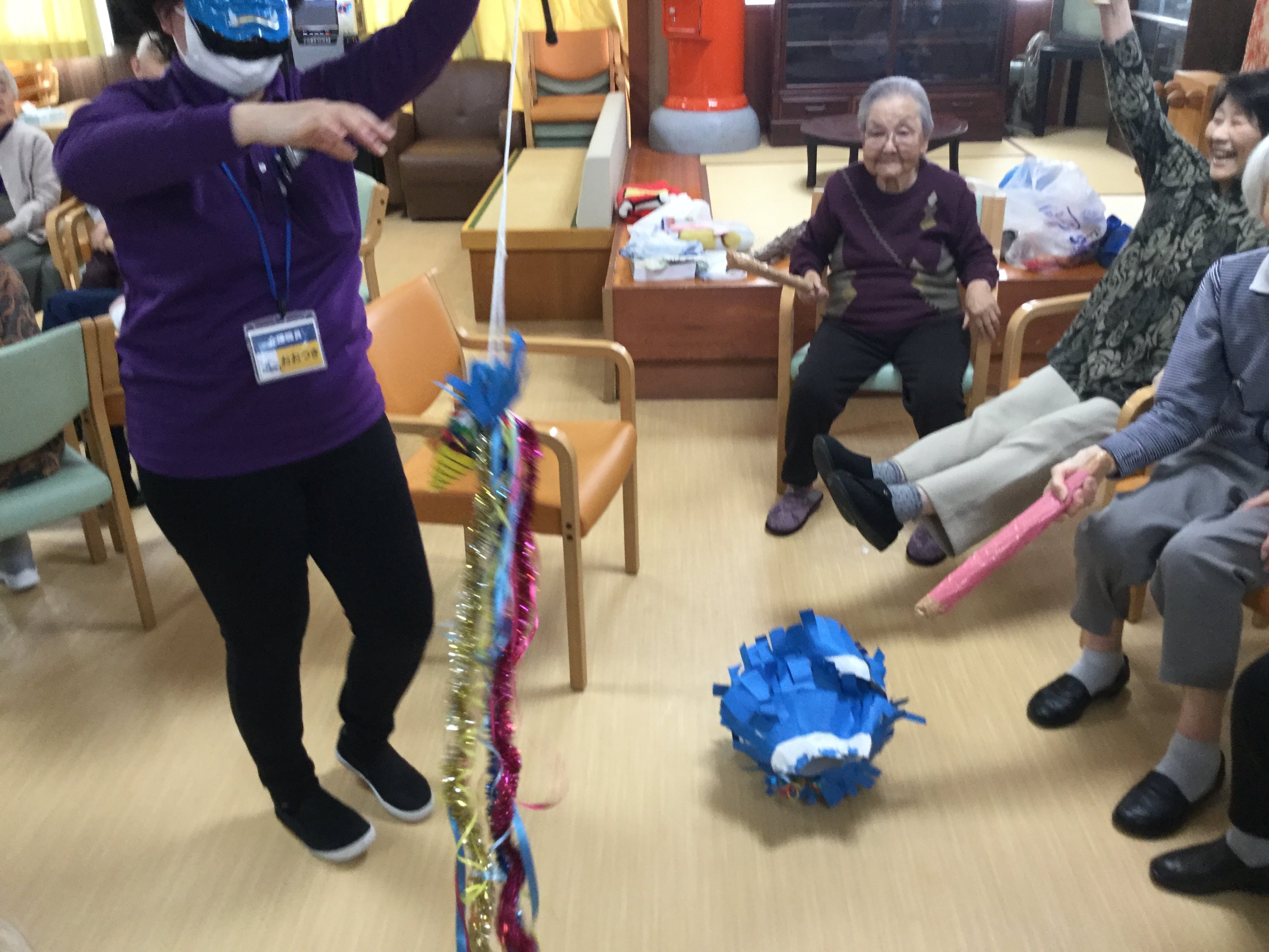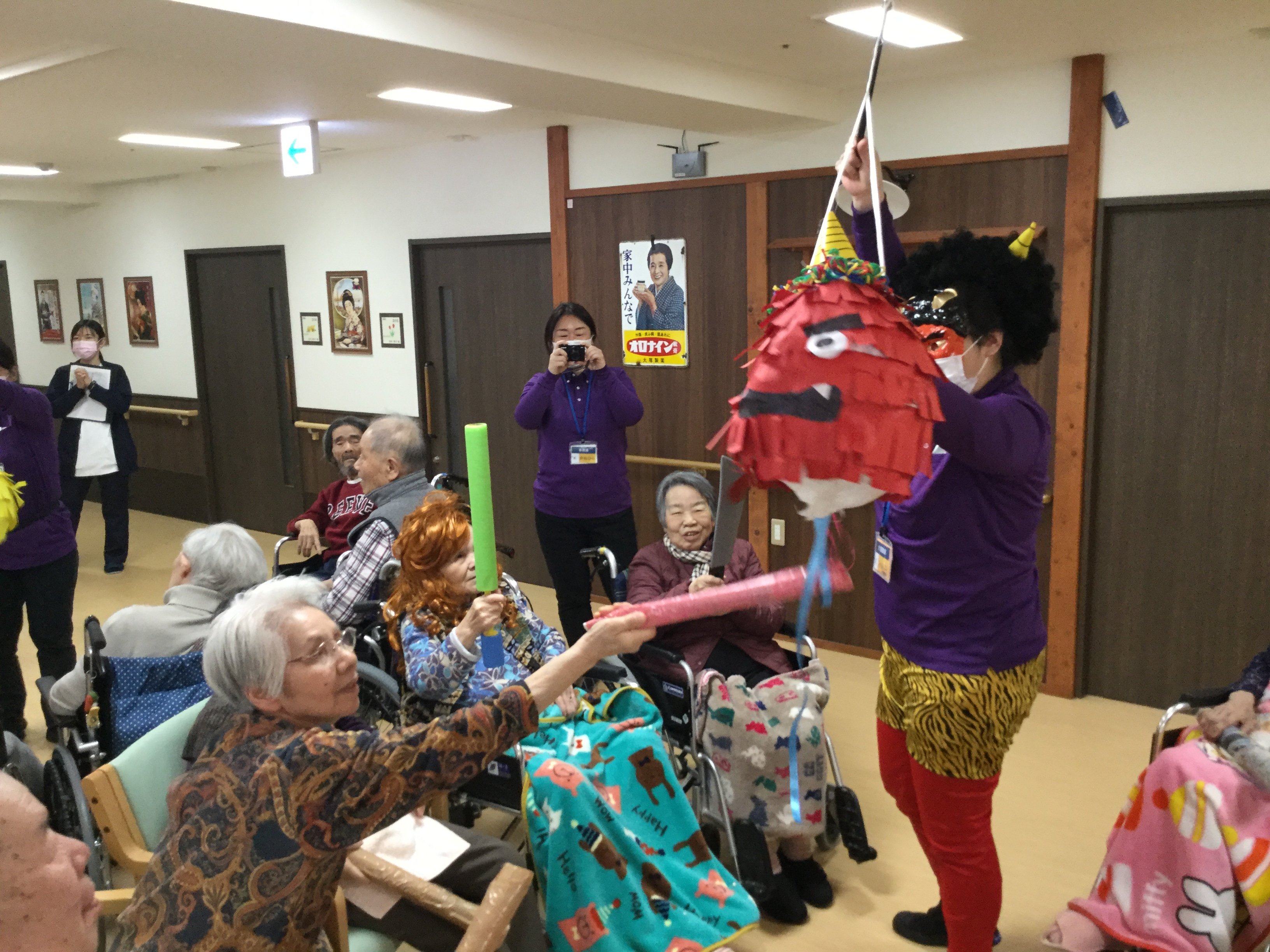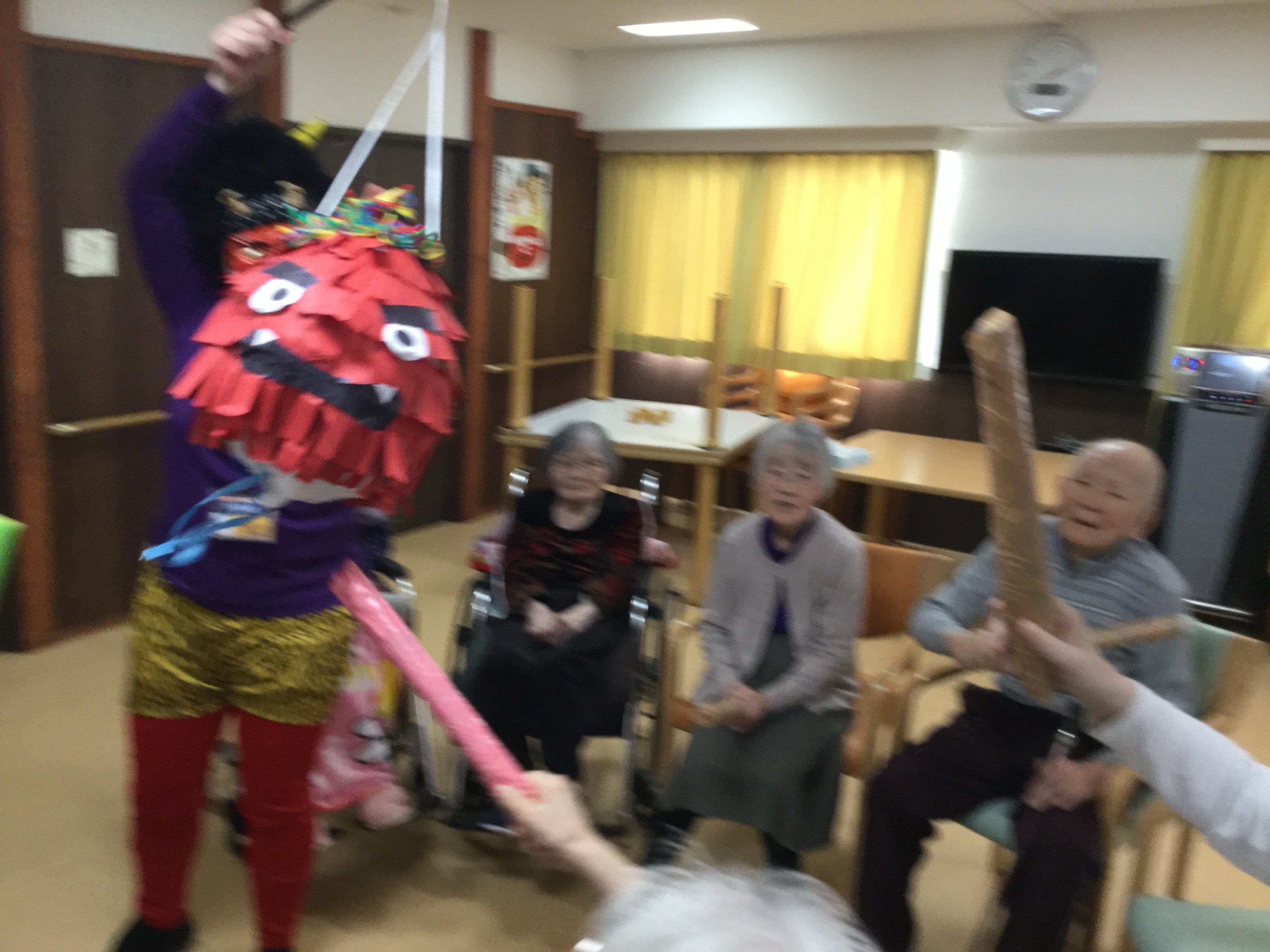 鬼のくす玉割、楽しそうですね!鬼がぐるぐる回転してご入居者の勢いもすごそうです。鬼モチーフのお菓子もおいしそうです。
