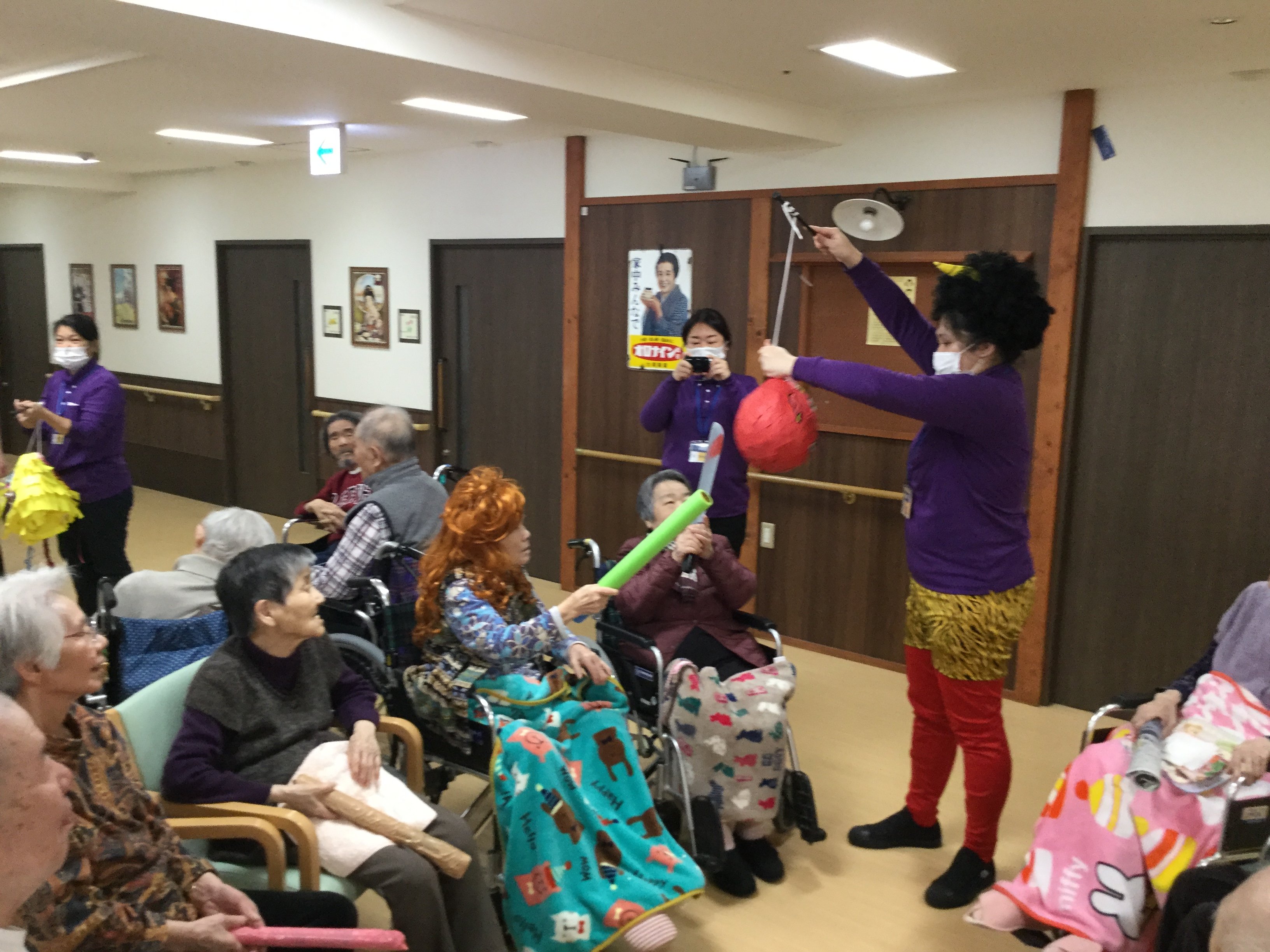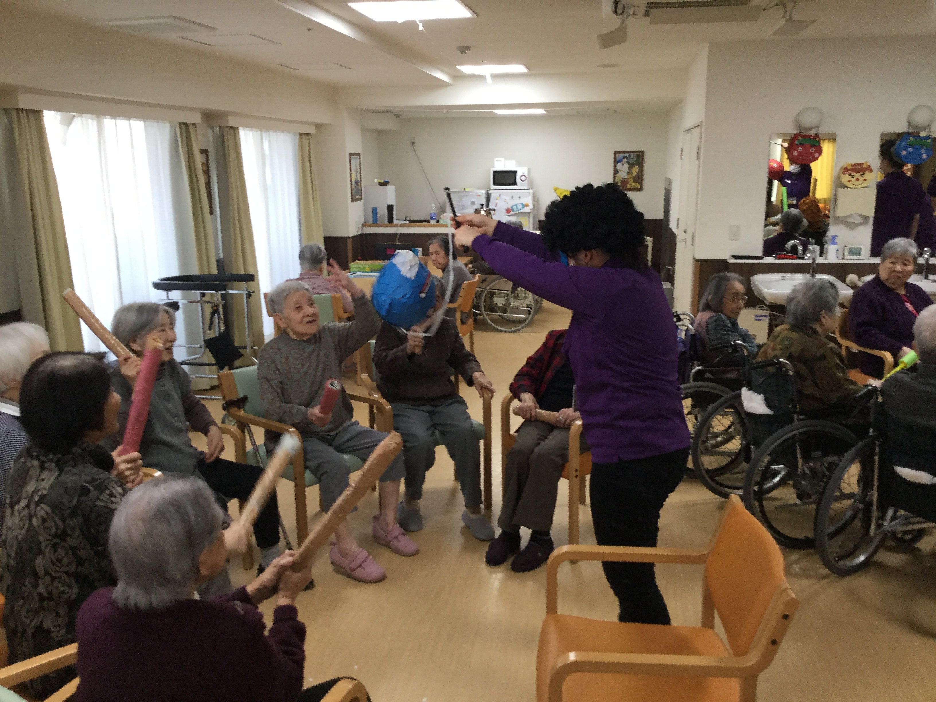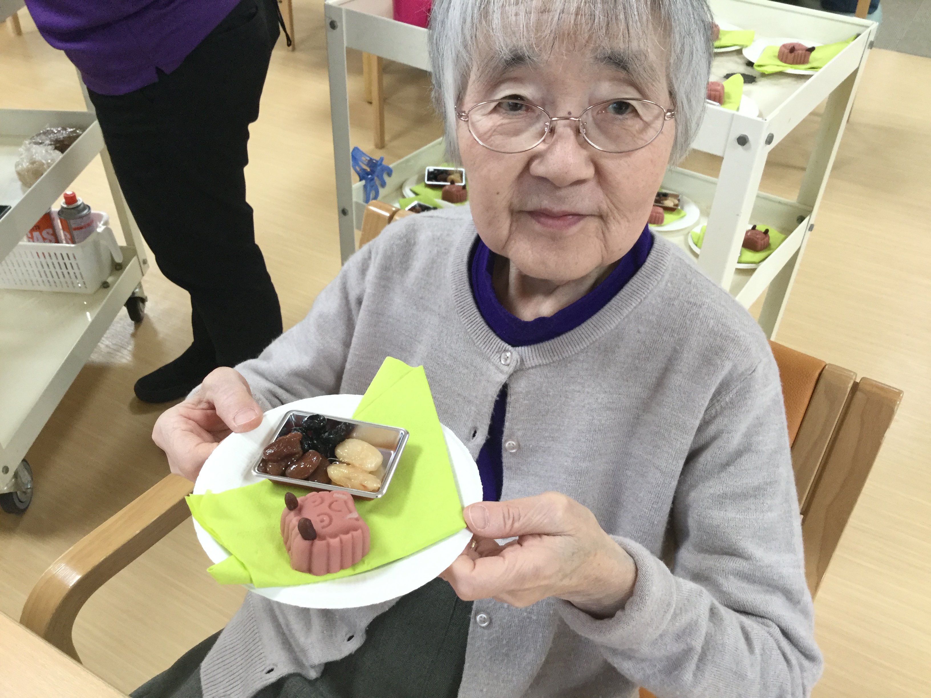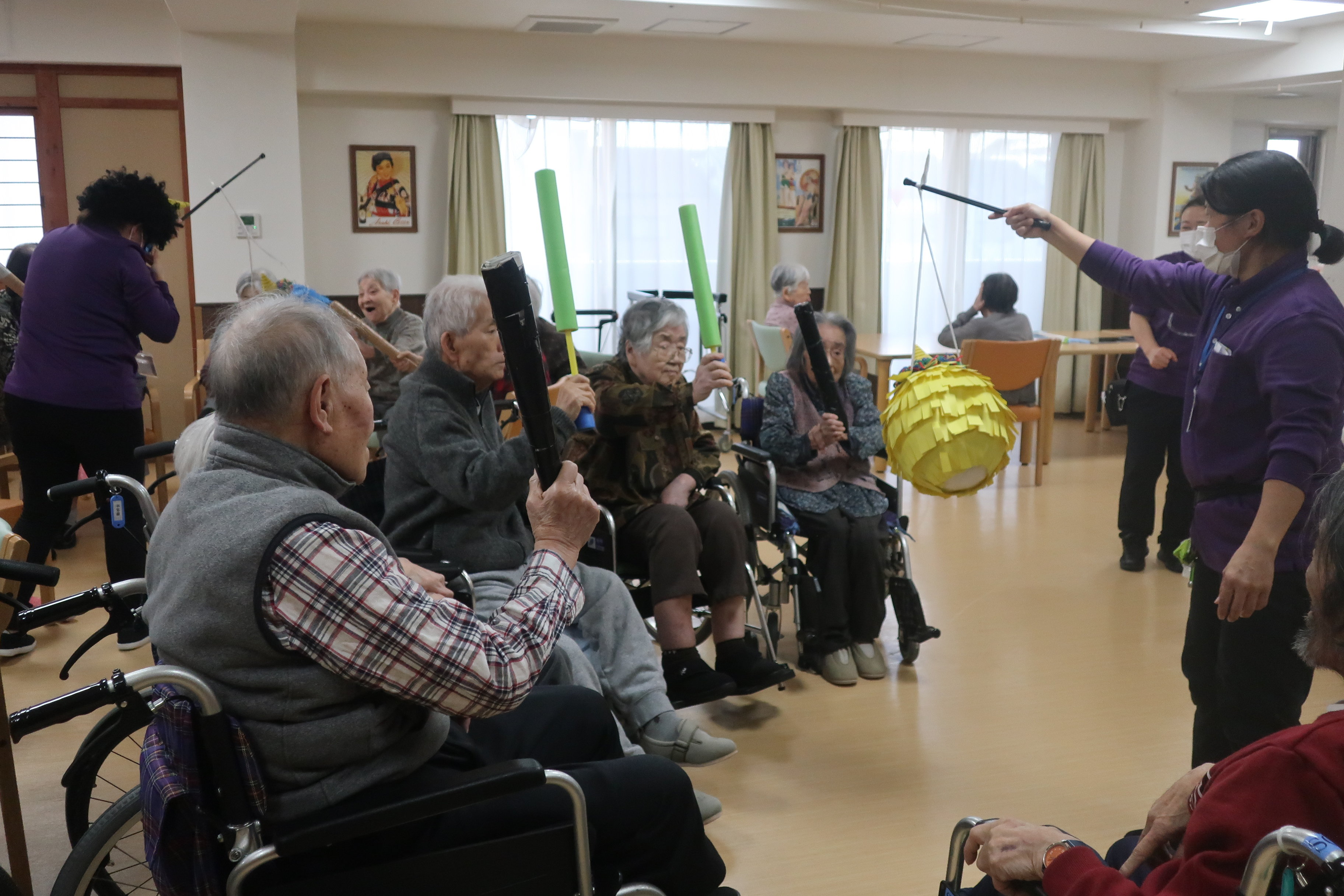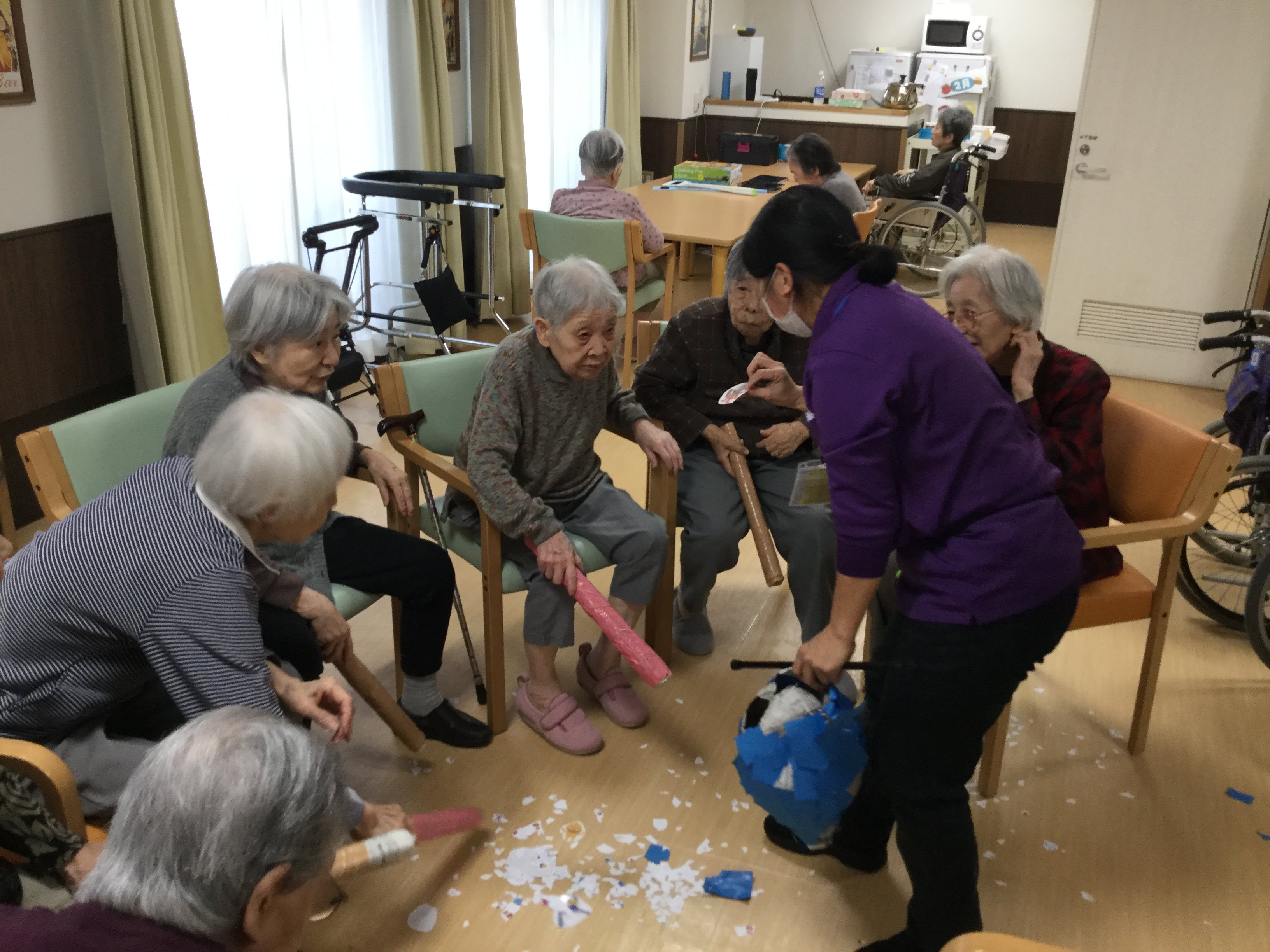 鬼のくす玉割、楽しそうですね!鬼がぐるぐる回転してご入居者の勢いもすごそうです。鬼モチーフのお菓子もおいしそうです。